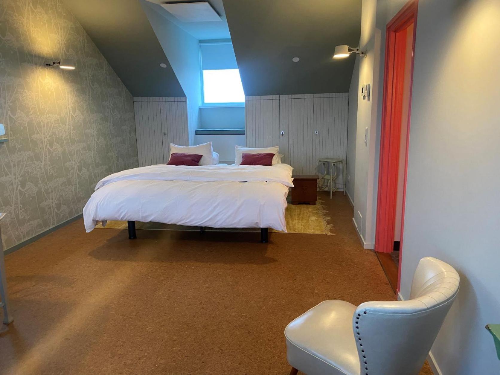 Prachtige grote kamer, met een goed bed, eigen douche en apart toilet en een ruime zithoek.