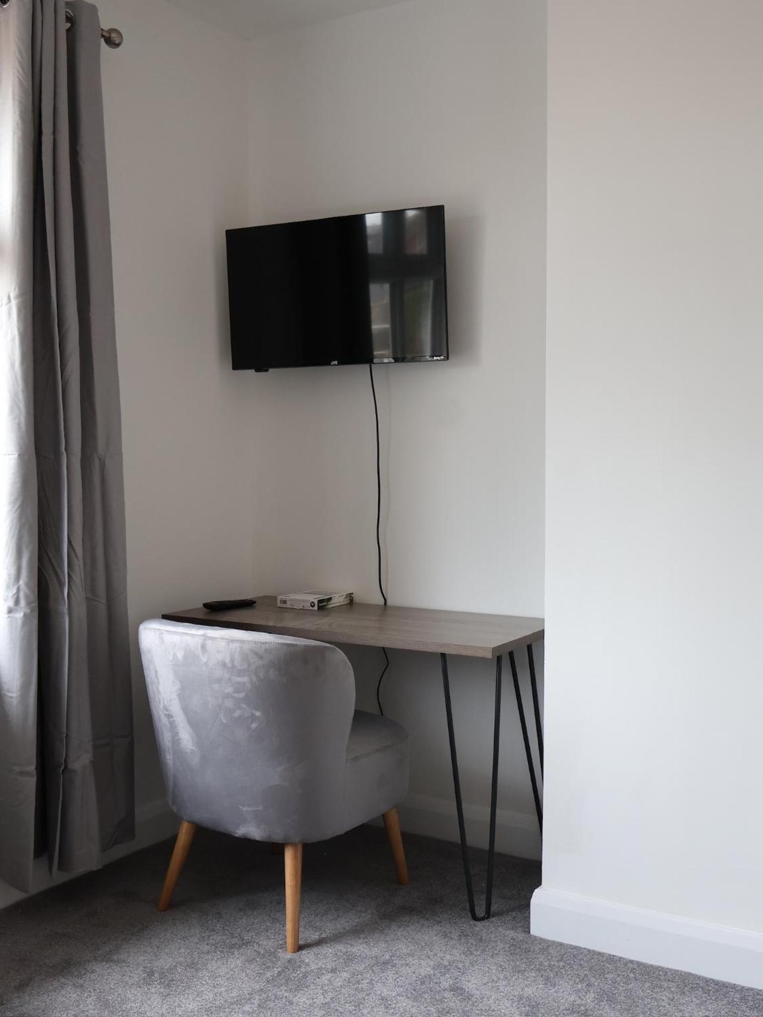 The room was very sparsely furnished. It would have benefited from a small table and chairs and/or a lounge type chair. This would have transformed the space and there was plenty of room for additional furniture. Also, there was a kettle and some milk but no tea of coffee and no glassware.