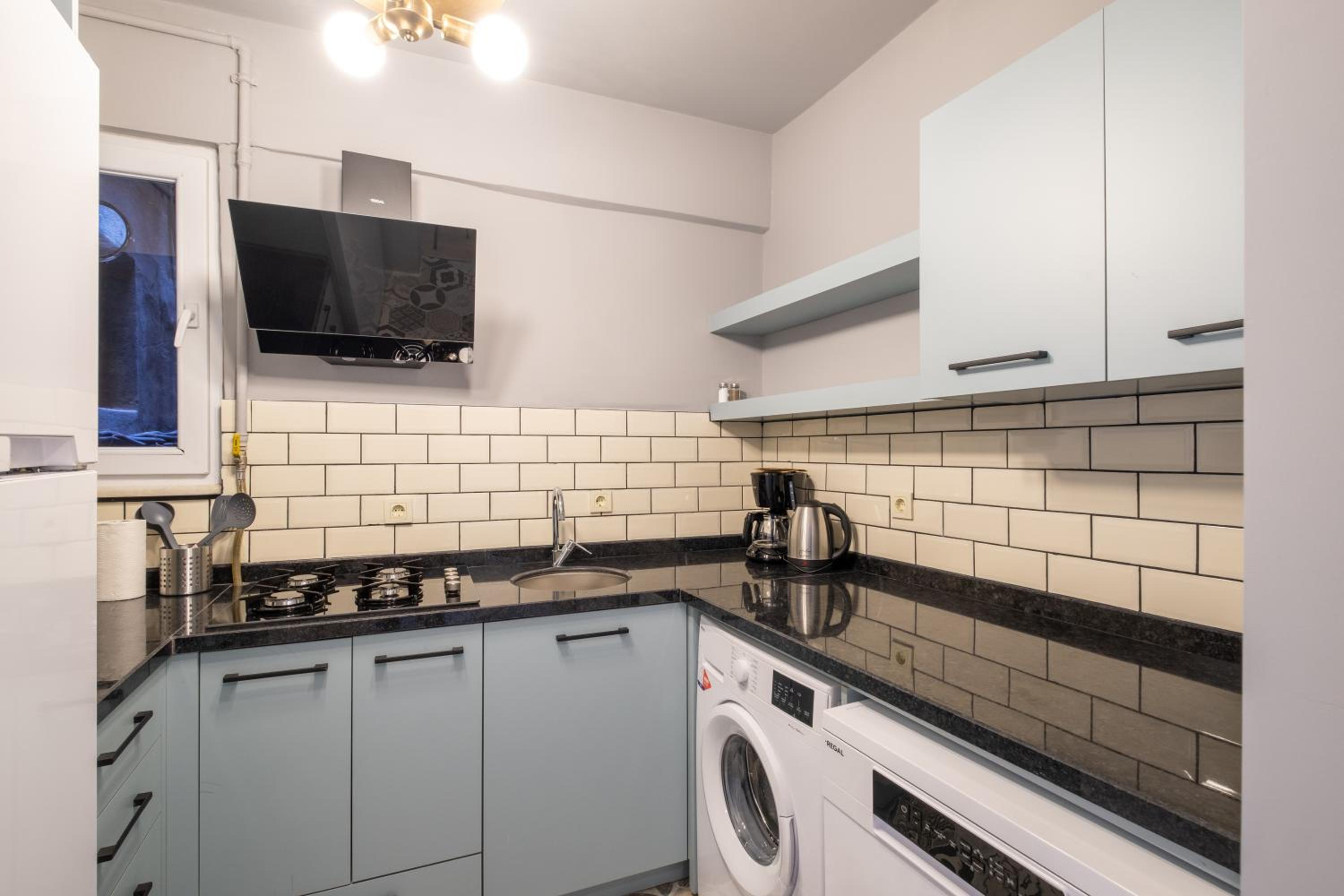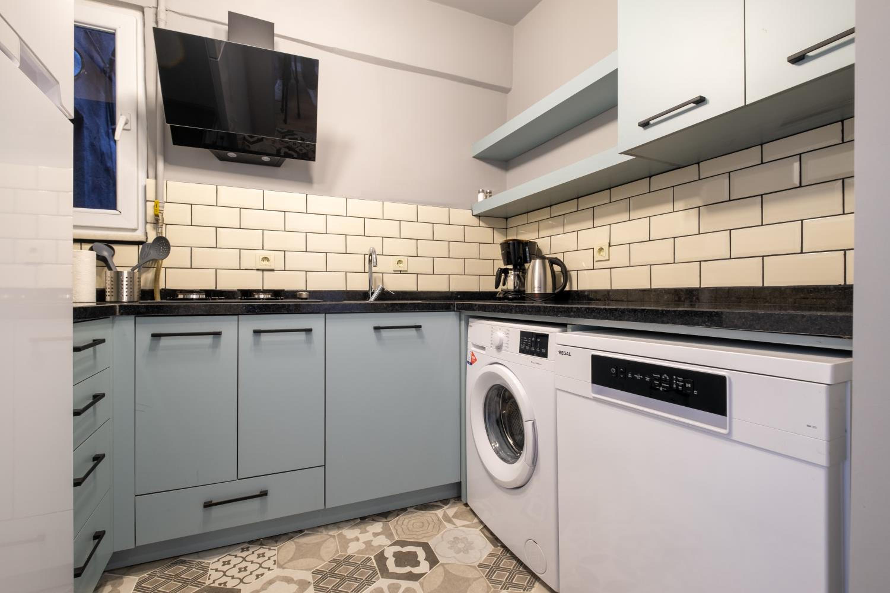 Kaffeemaschine, Bügeleisen, Bügelbrett, Waschmaschine, Geschirrspüler vorhanden.