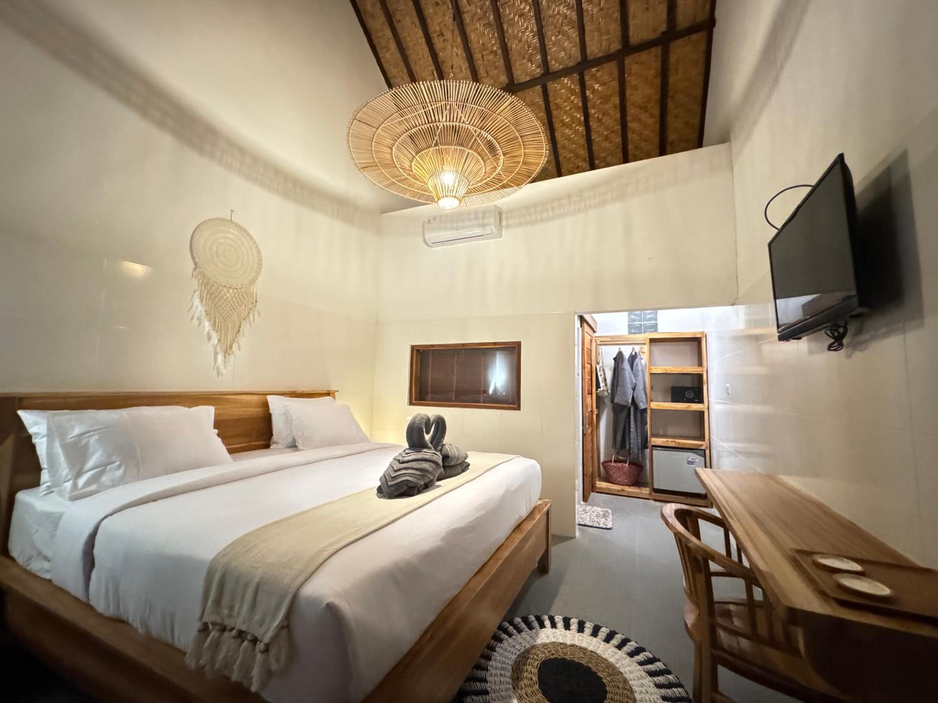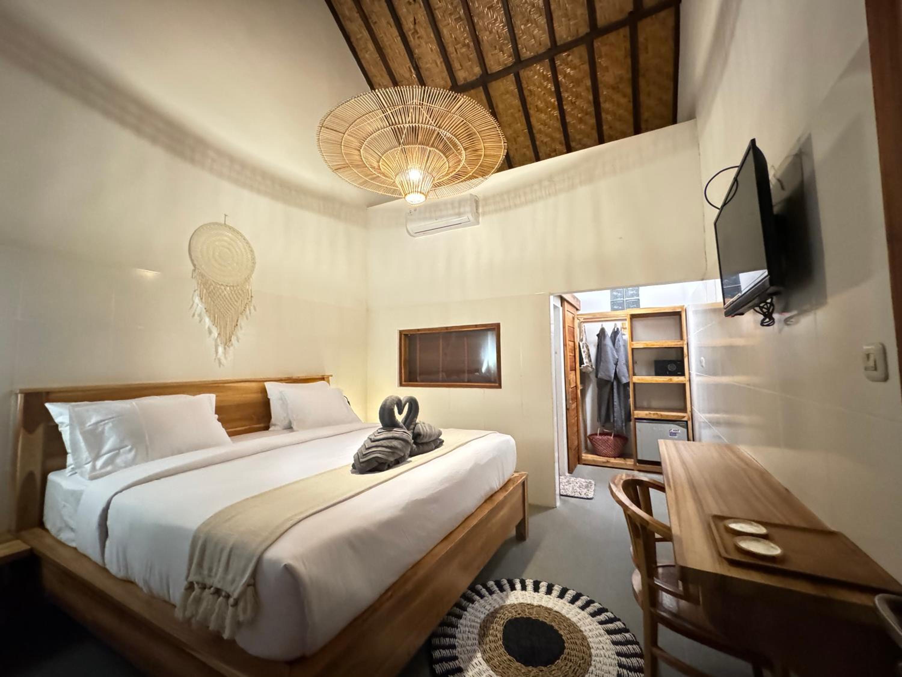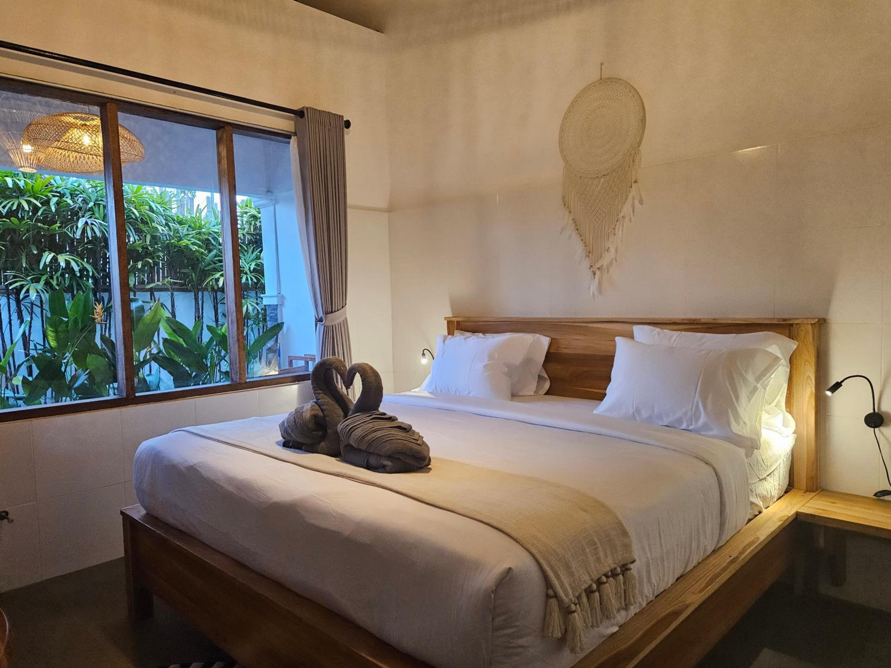 La ubicación ya que está justo en la calle de más ambiente de Kuta. La cama es grande y cómoda. Había caja fuerte, albornoz, bolsas para la playa. Nos dejaron salir una hora después del check out.