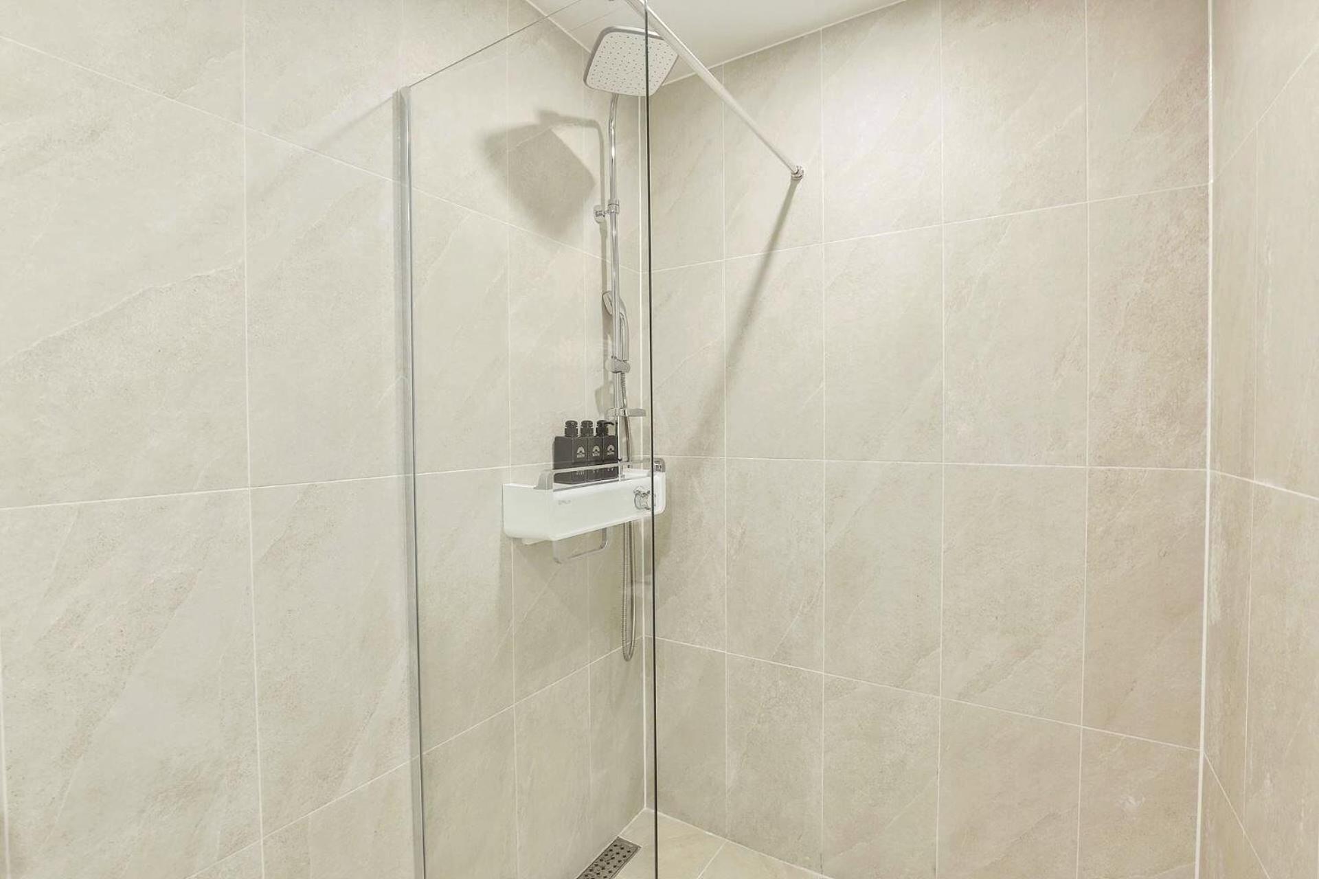 De hele vloer van de badkamer werd erg nat na het douchen. Een wisser was handig geweest
