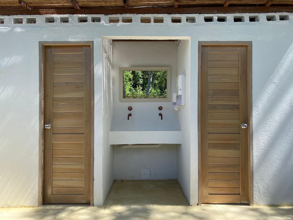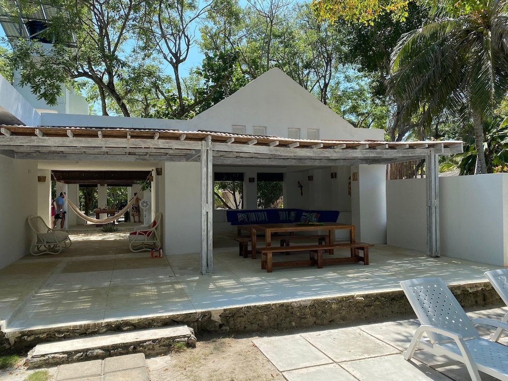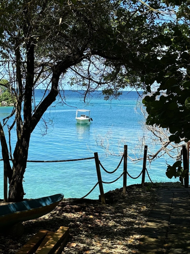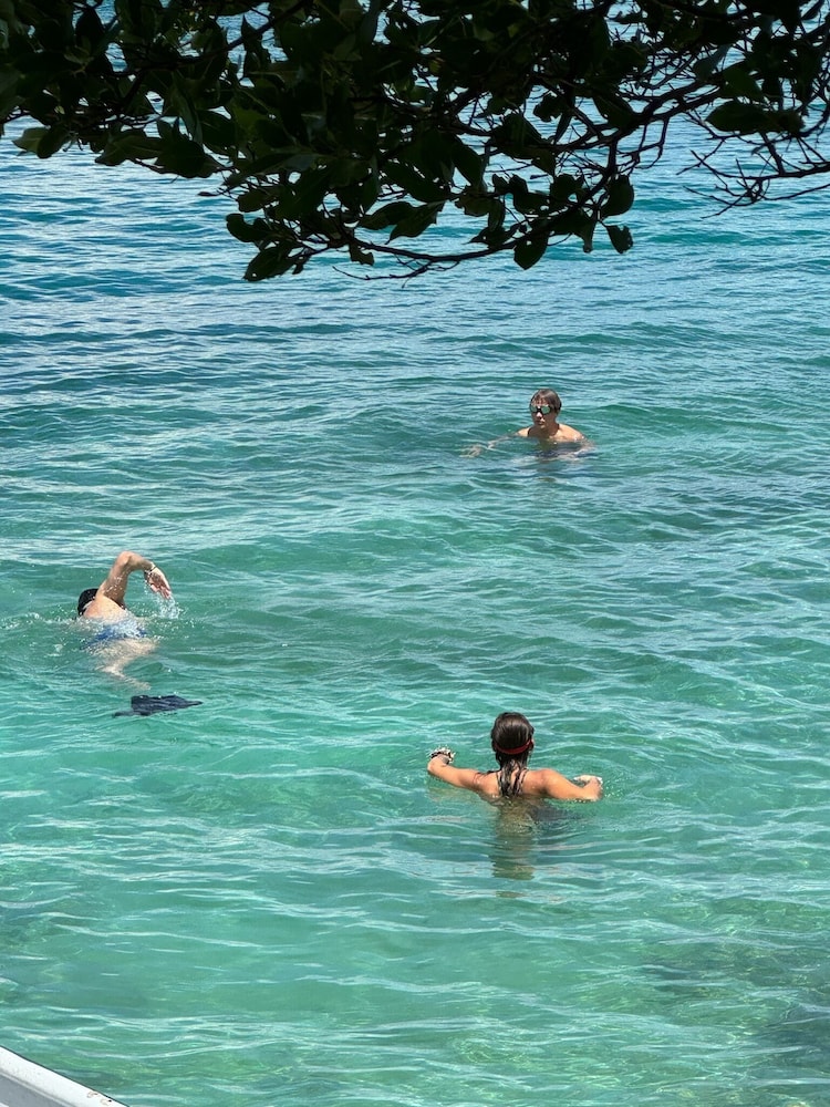 La ubicación es increíble, tiene una playa privada, de pocos metros (30 m aprox) bajo un árbol de mangle enorme que la da sombra y permite disfrutar del mar cristalino, que tiene cerca bancos de piedras donde puedes hacer snorkeling y ver los peces, es fantástico. El mar es poco profundo y muy tranquilo.