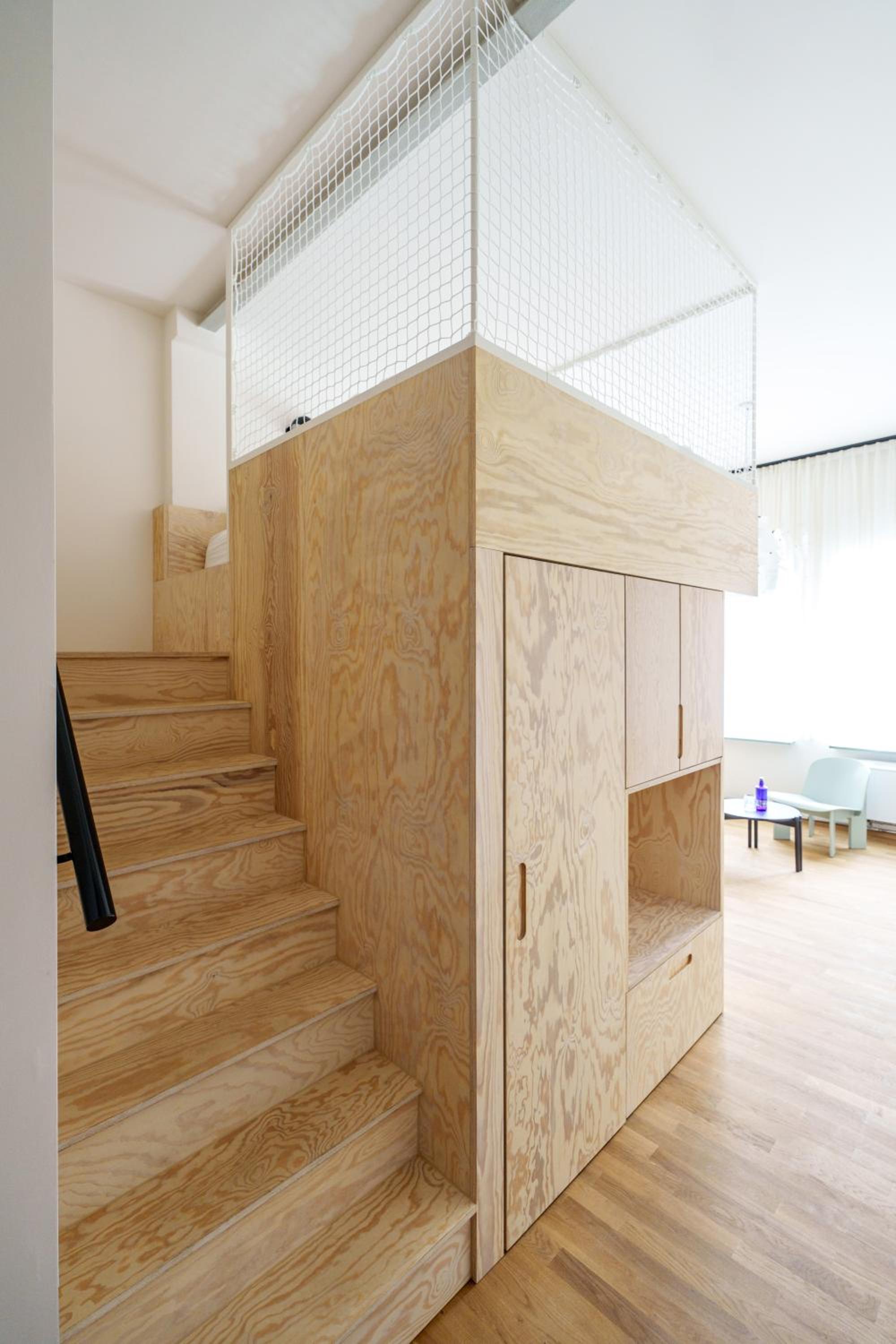 Das Bett liegt auf einer kleinen Galerieebene, zwar durchdachtes Raumkonzept, aber nicht ganz optimal