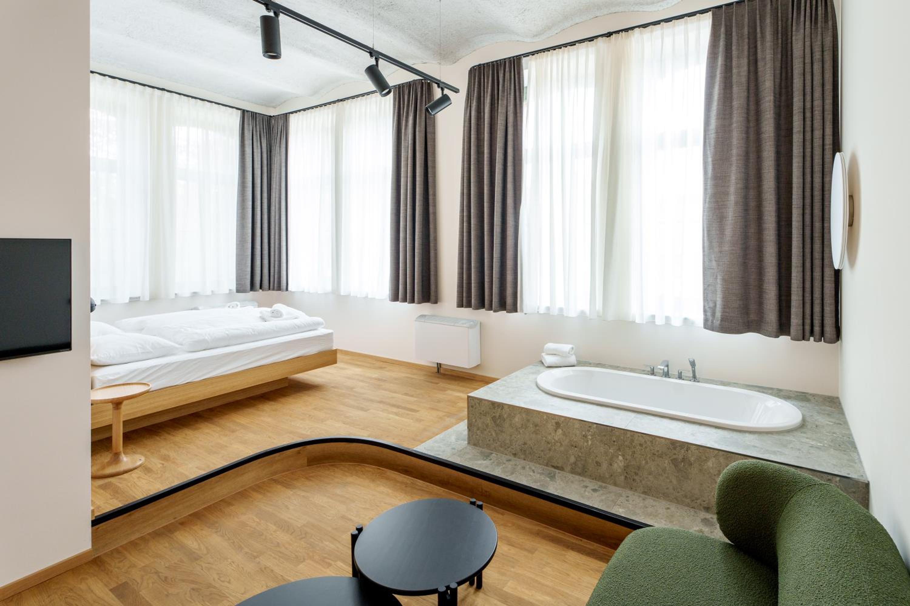 Sehr hochwertige Ausstattung, rooftopbar im Gebäudekomplex (leckere Drinks, netter Service), Abwicklung unkompliziert, rundum super!