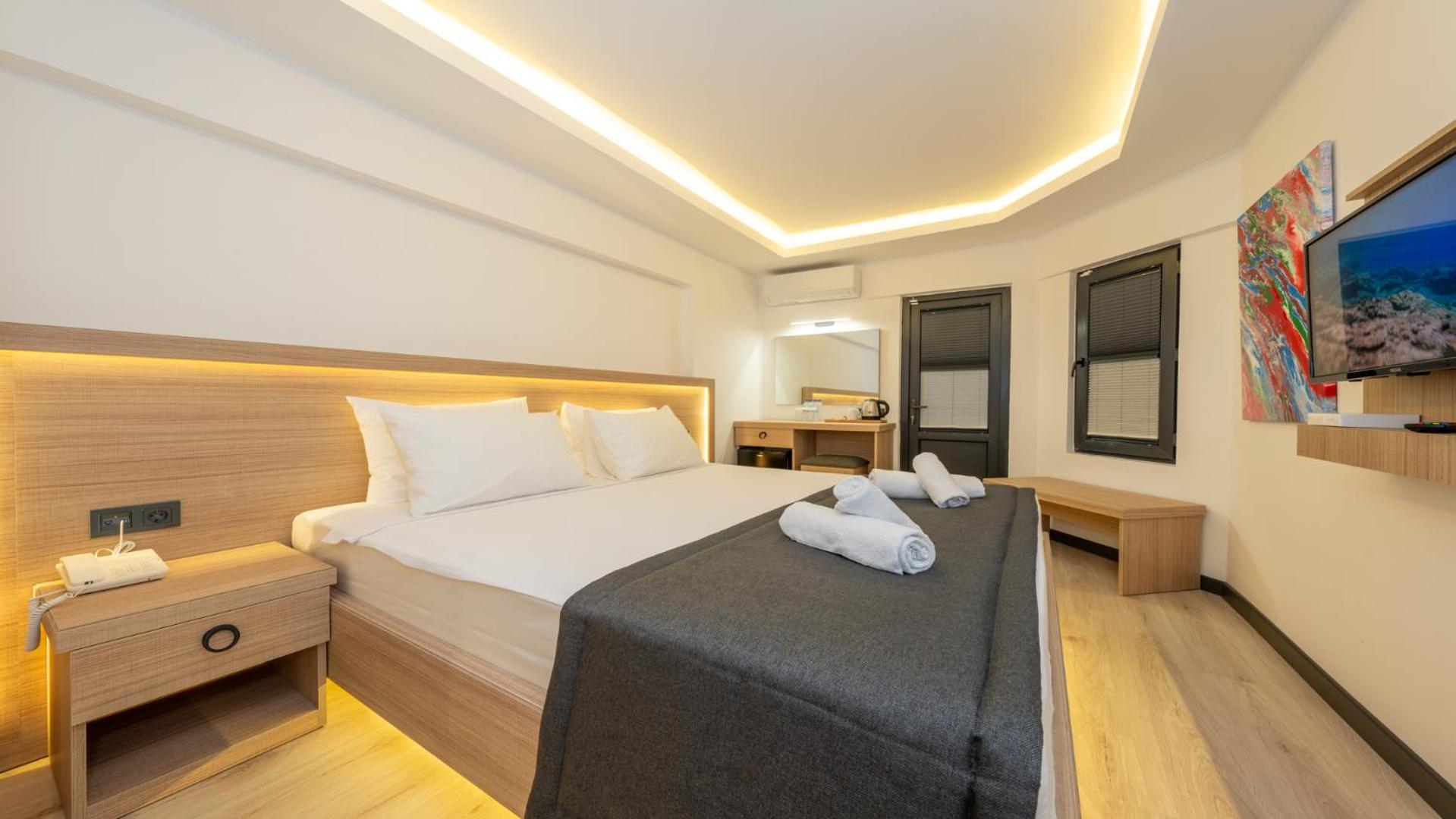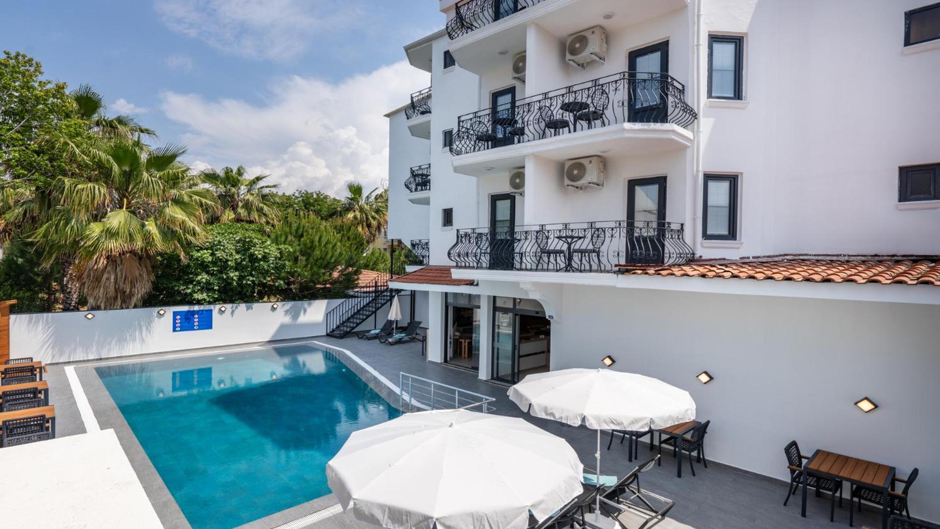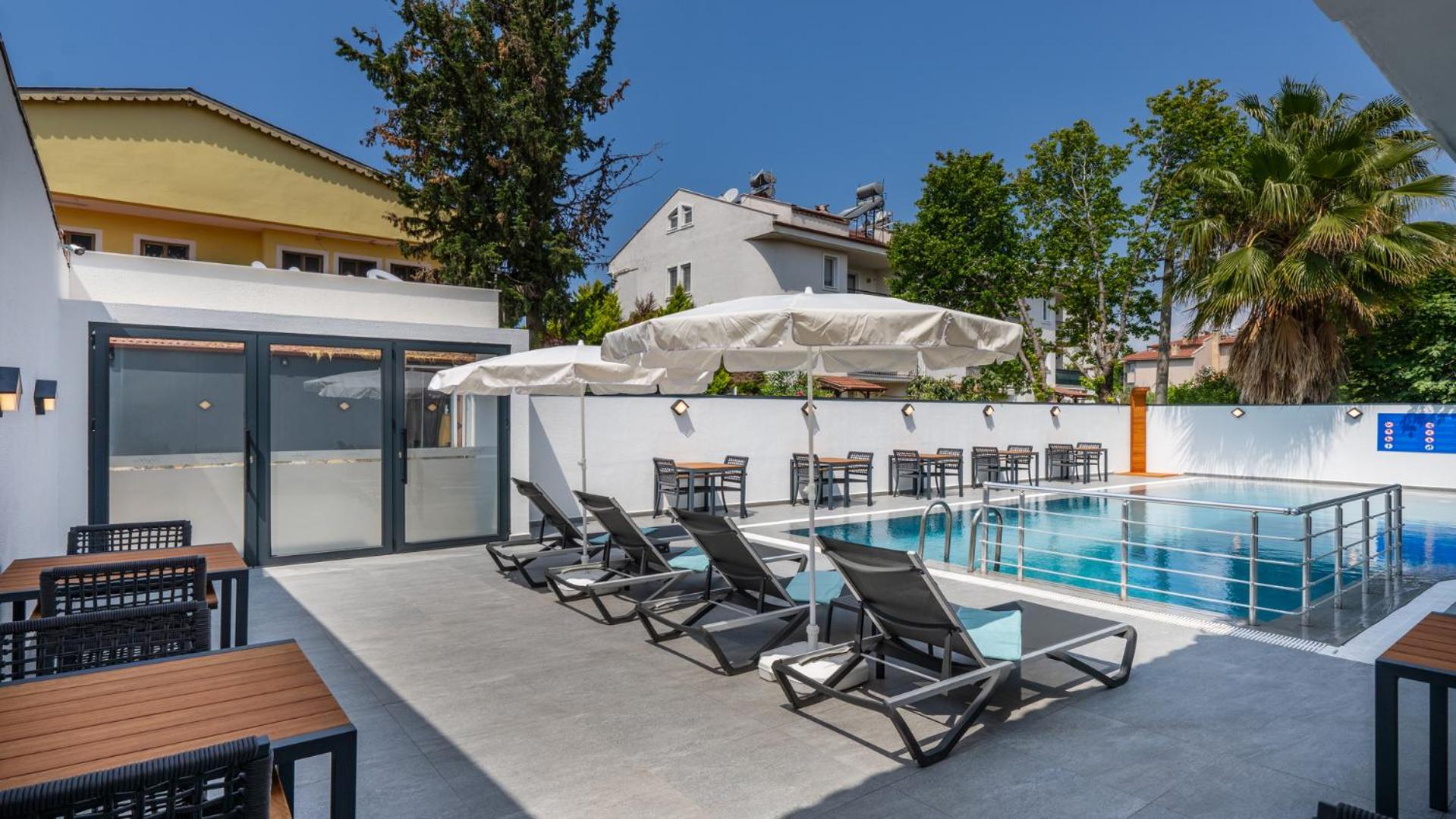 Experience the perfect blend of comfort and convenience at Skykhan Otel in Fethiye. Enjoy family-friendly spacious rooms, a refreshing outdoor pool, and top-notch amenities. Indulge in a delicious breakfast each morning before exploring nearby attractions like Calis Beach and Aquapark. Unwind on the sun terrace or seek adventure with various recreational activities. For a memorable stay in Fethiye, book your room at Skykhan Otel now.