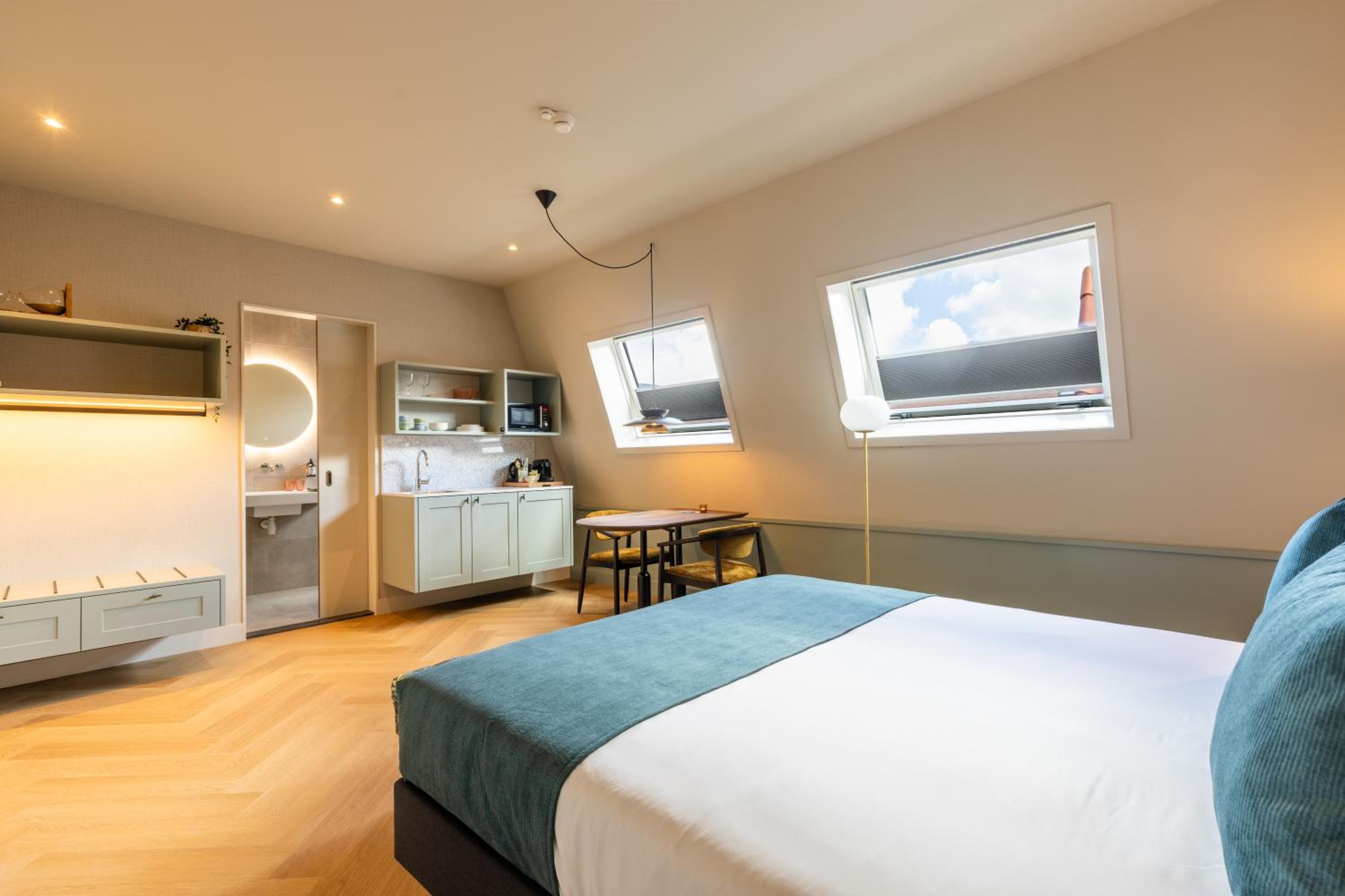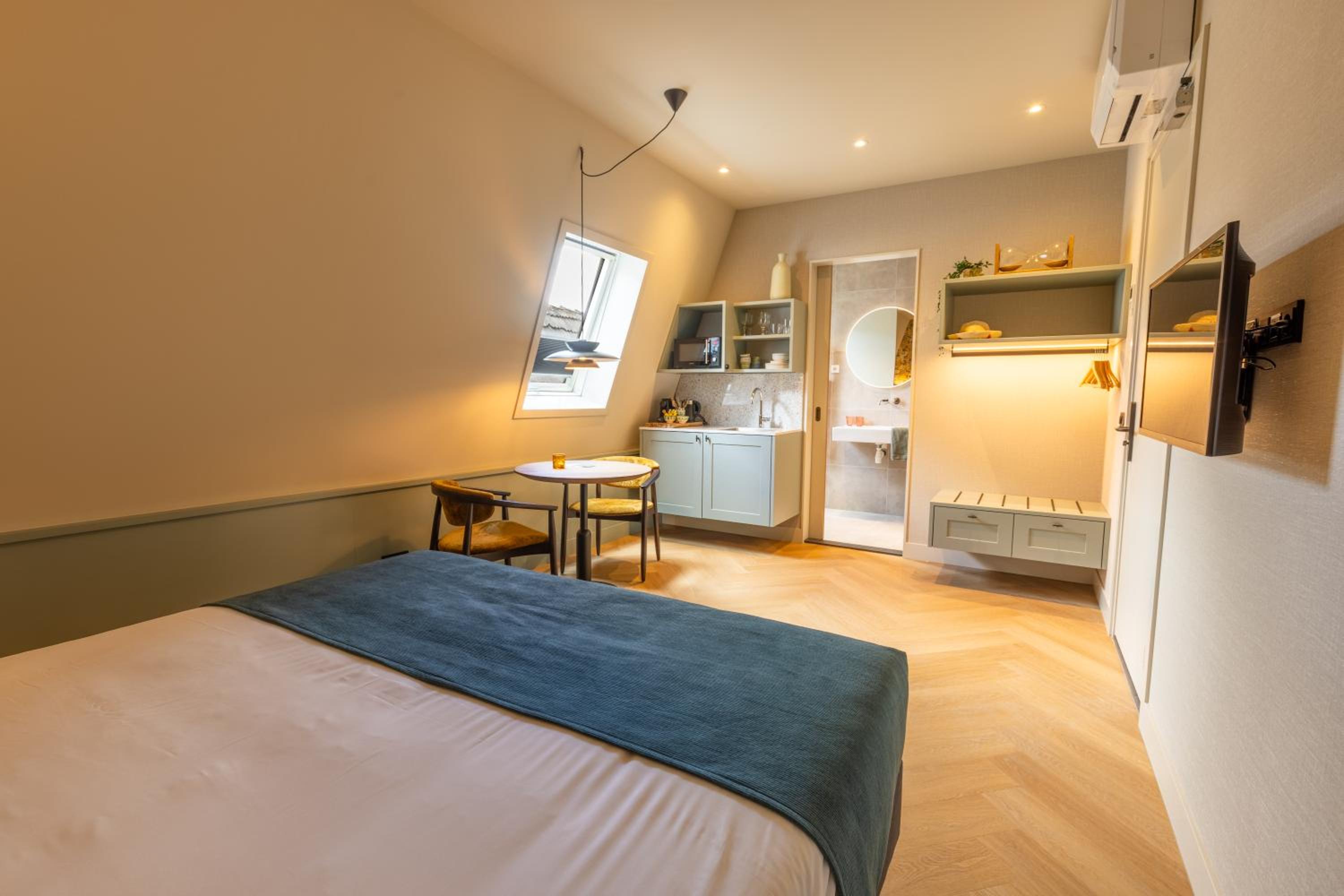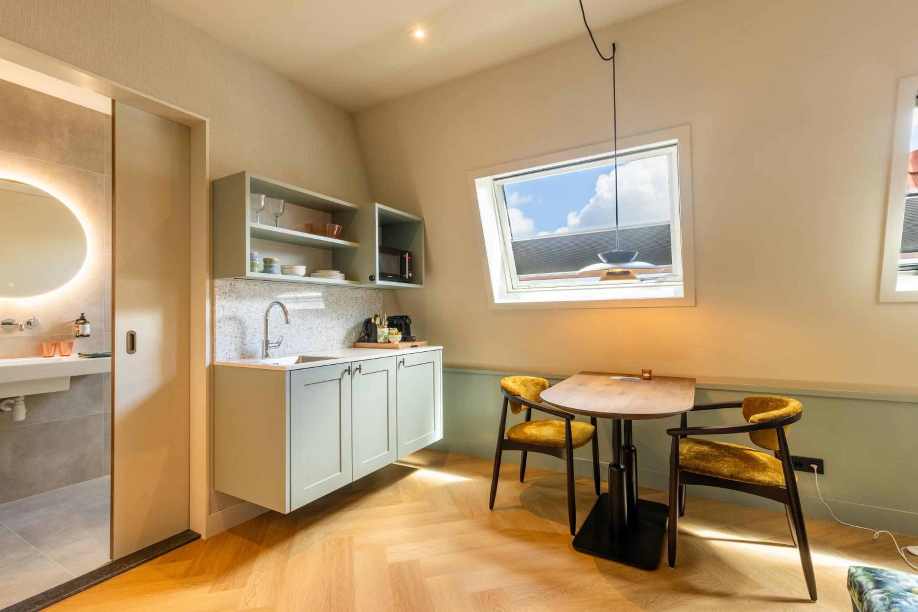Prachtige ruime kamer, sfeervol ingericht. Heel mooi en luxe sanitair. Compleet keukenblokje uitgerust met magnetron , Nespresso machine, waterkoker en melkopschuimer. Locatie perfect , midden in de Dorpsstraat. Supermarkt dichtbij en gezellige restaurantjes.