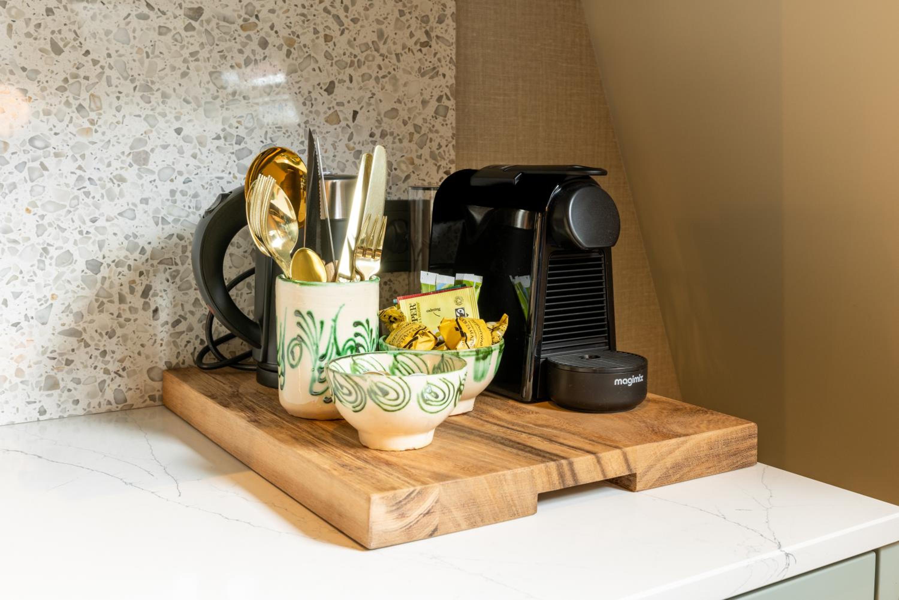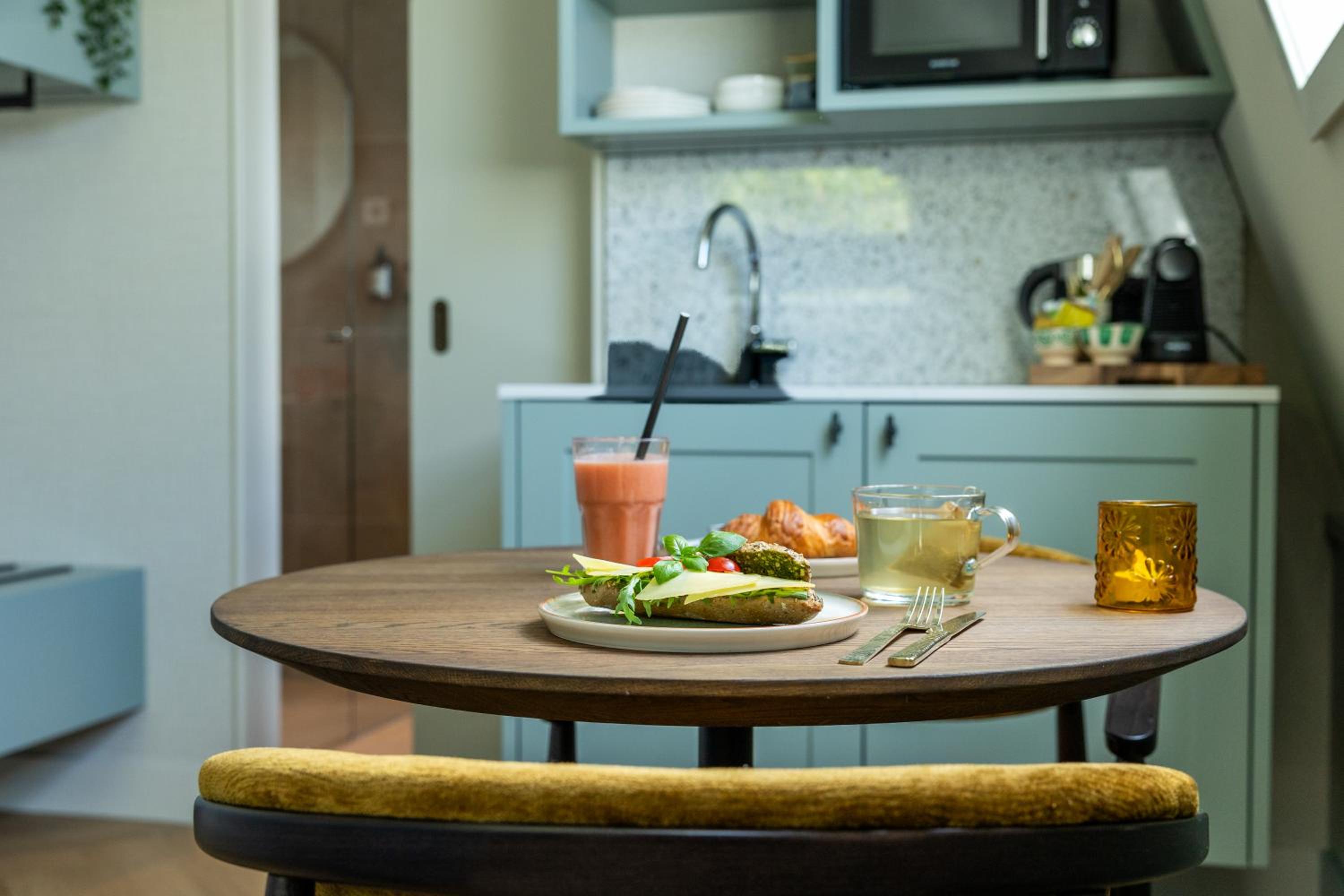 Prettige plek, heel mooi klein keukentje dat je kon ontbijten. Beetje een suite. Hoog niveau van afwerking, sfeervol.