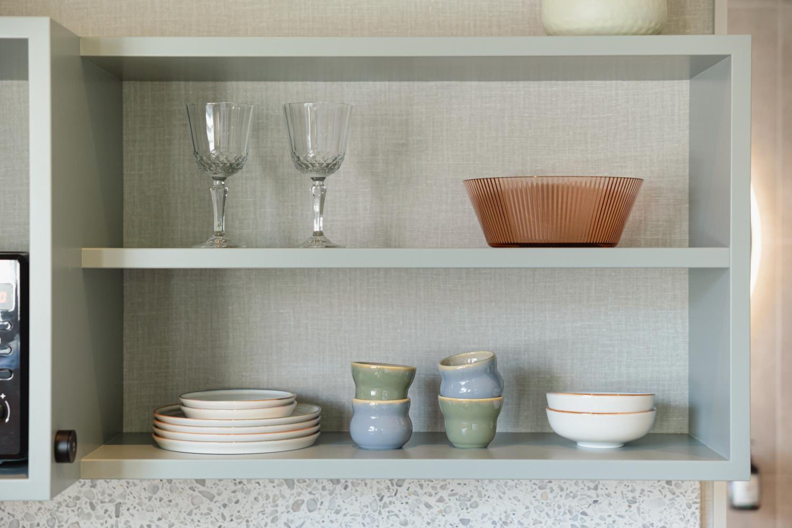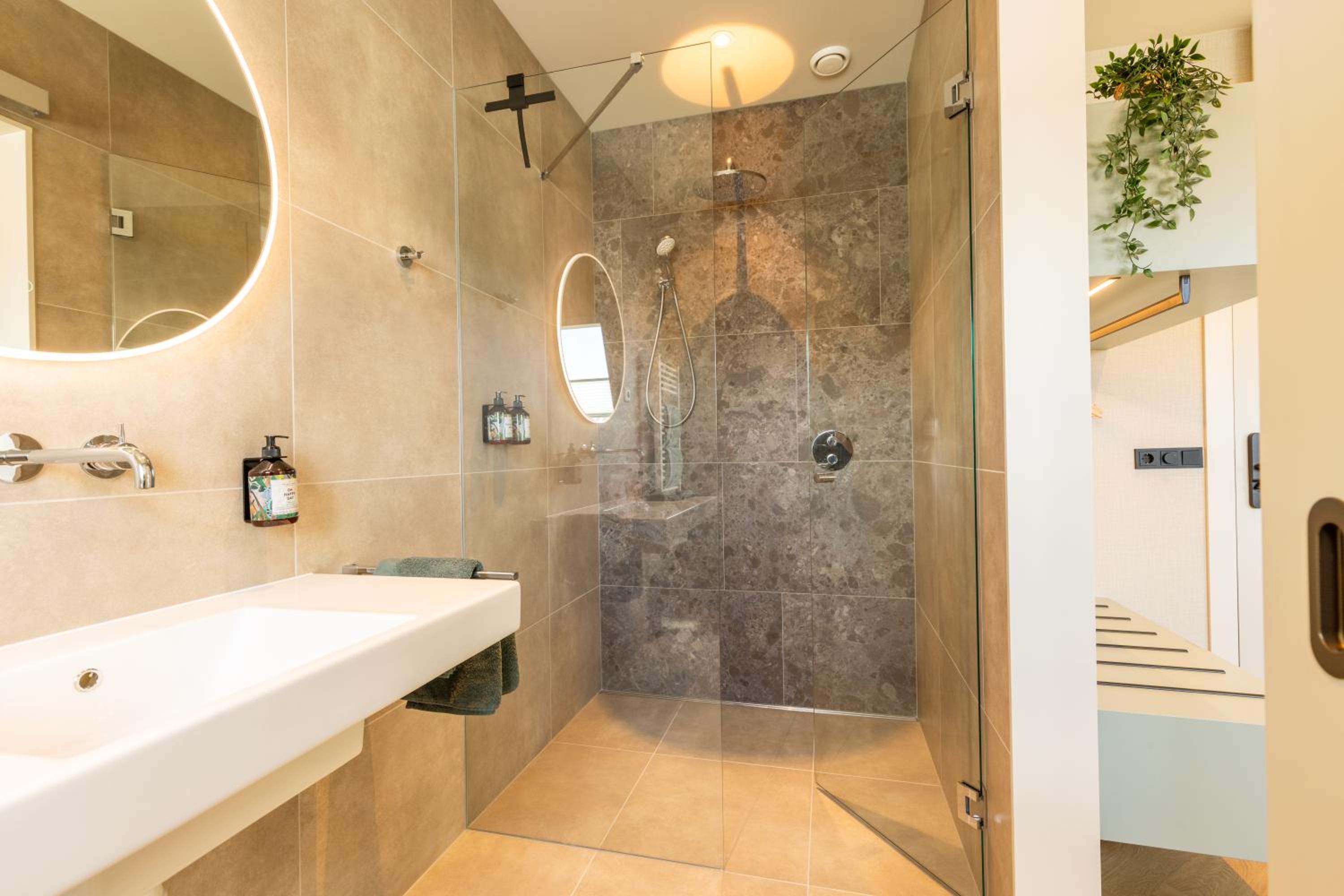 Fantastische regendouche, mini kitchenette met koelkastje en een fijn tafeltje met stoelen. Net alsof je een eigen appartementje hebt, super!