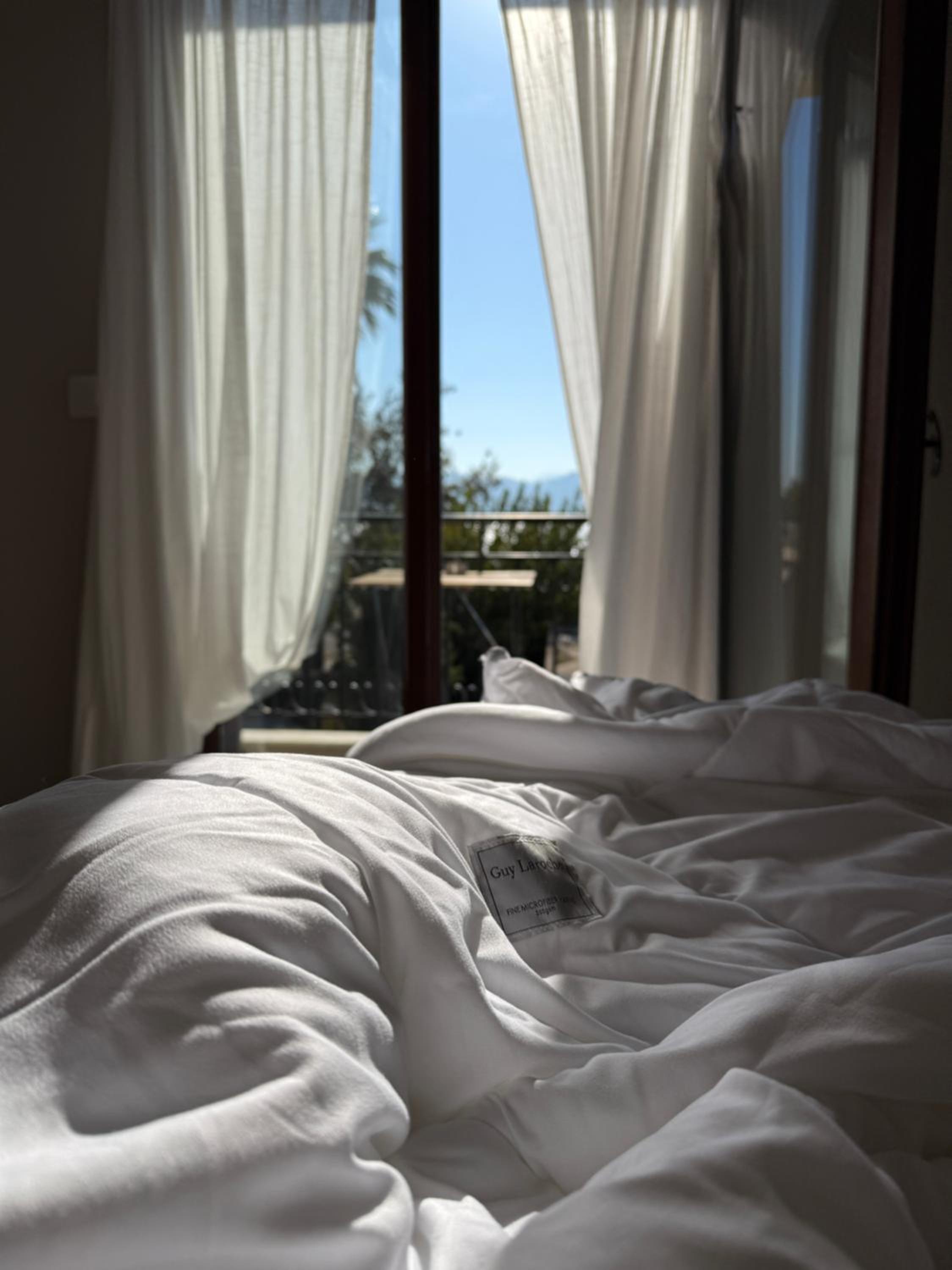 We had breakfast in our room as we had a lovely kitchen/diner in addition to our bedroom.Both rooms had little terraces, one with a castle view the other with a sea view. Our hostess Cristina was absolutely delightful and super helpful. The location was amazing. Right on the beach and a stones throw from the town and all the restaurants.