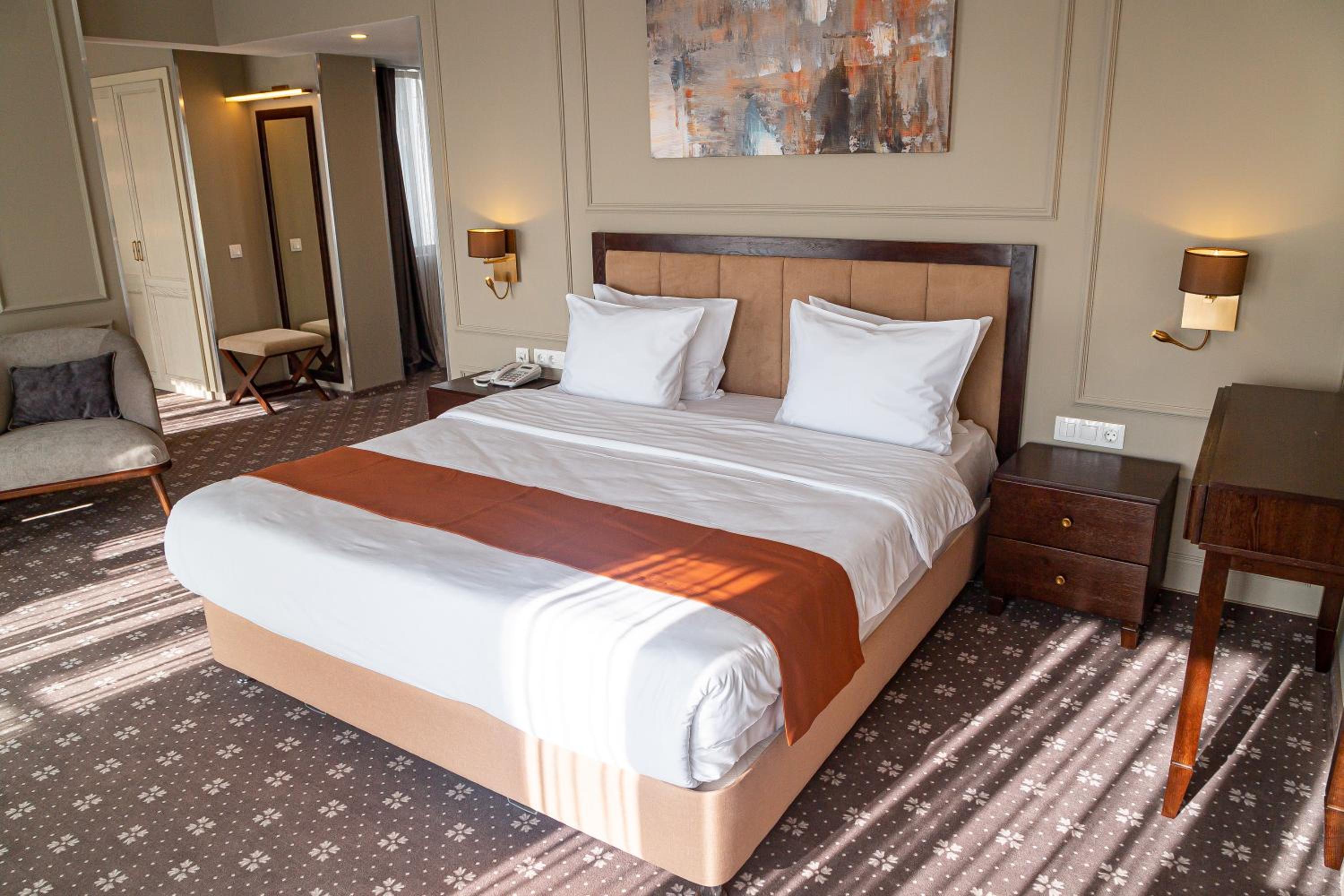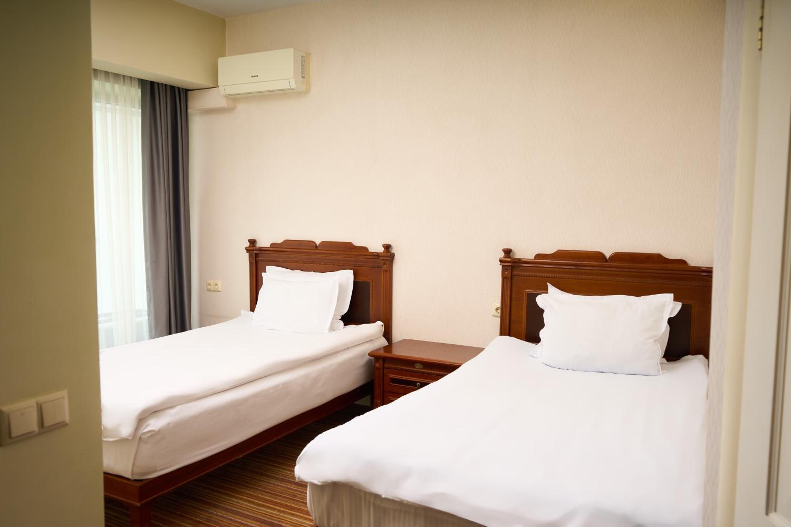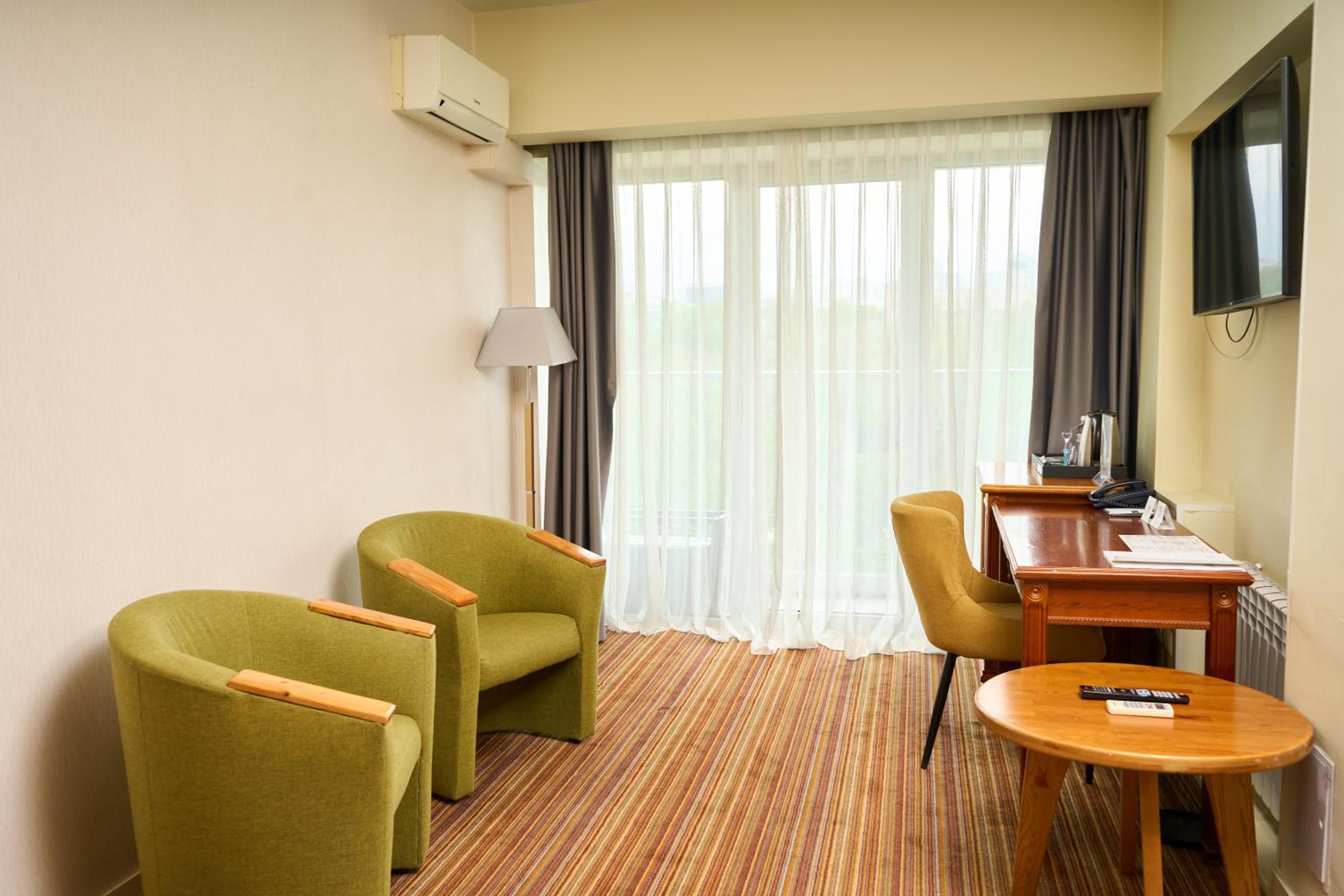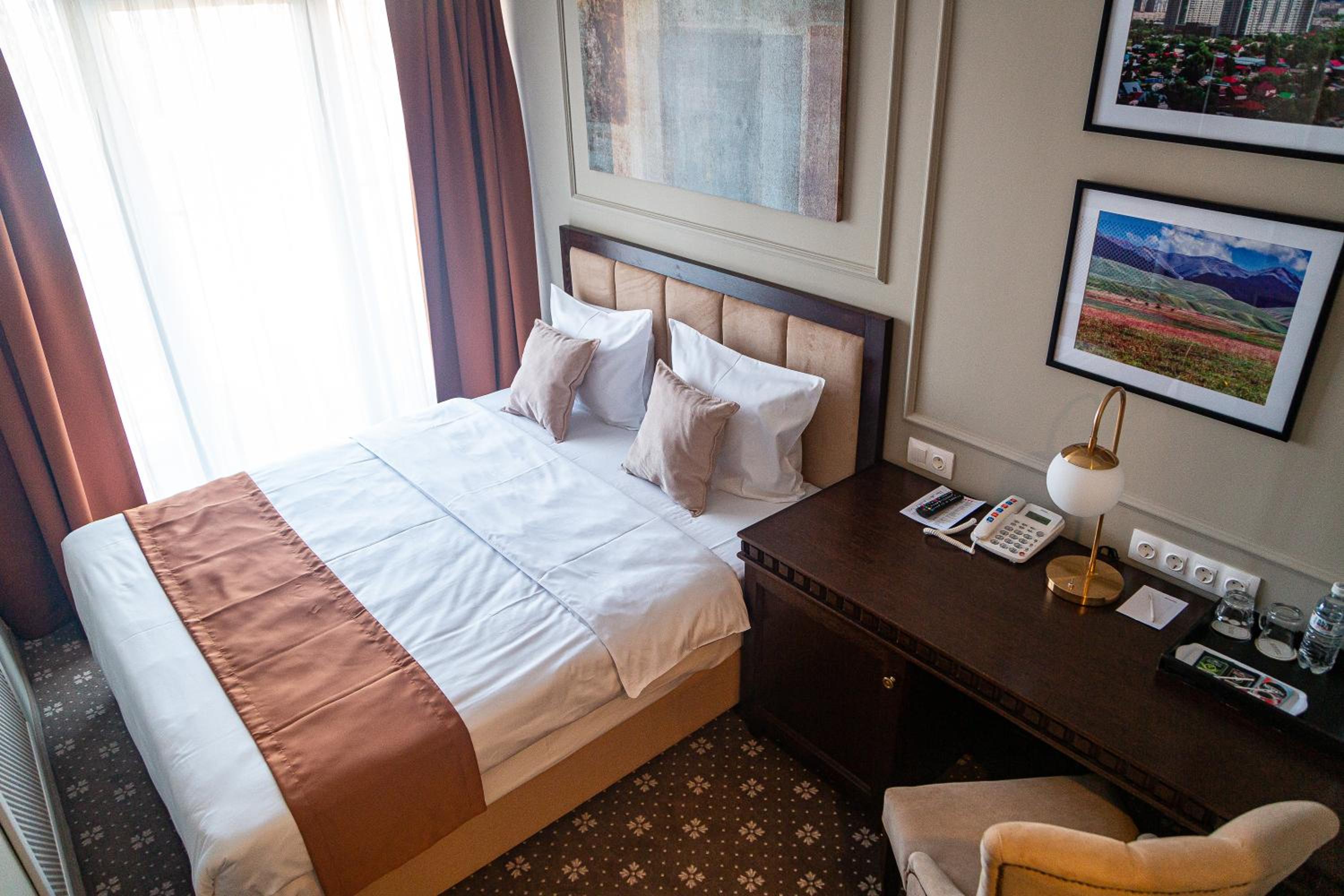 The rooms at Almaty Hotel are designed in a modern style and come equipped with all the necessary amenities such as a minibar, flat-screen TV, and fridge for a comfortable stay.