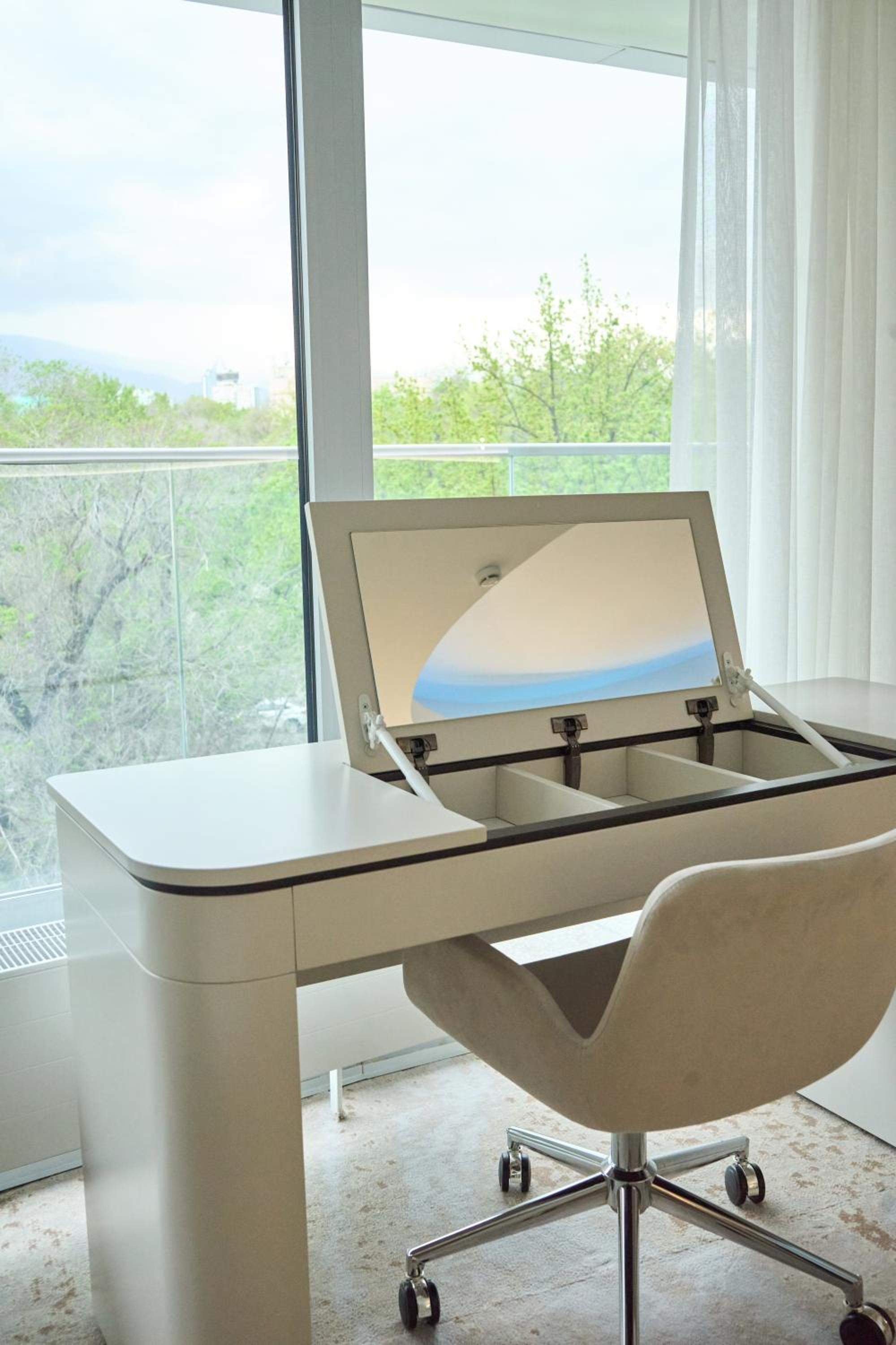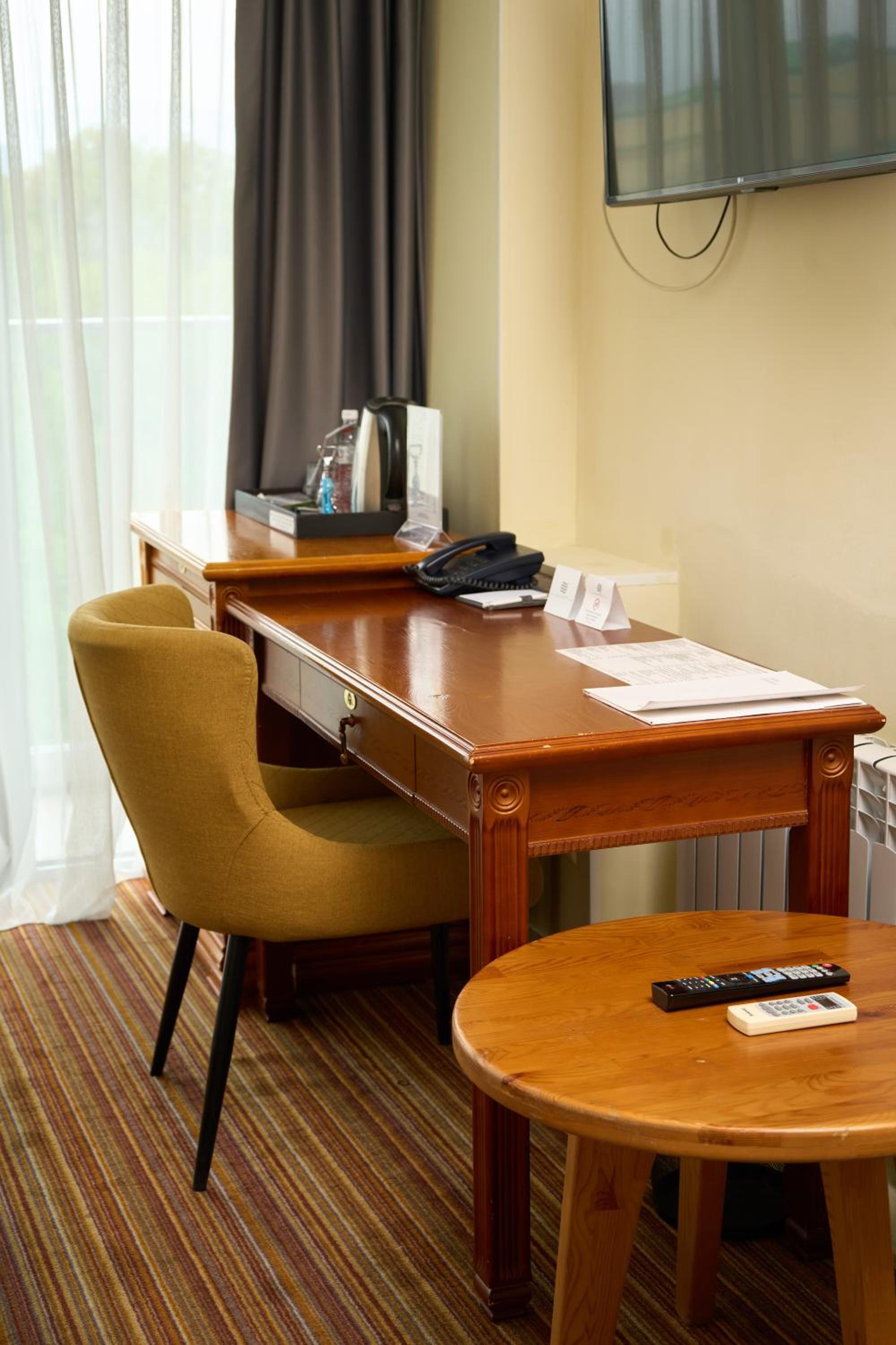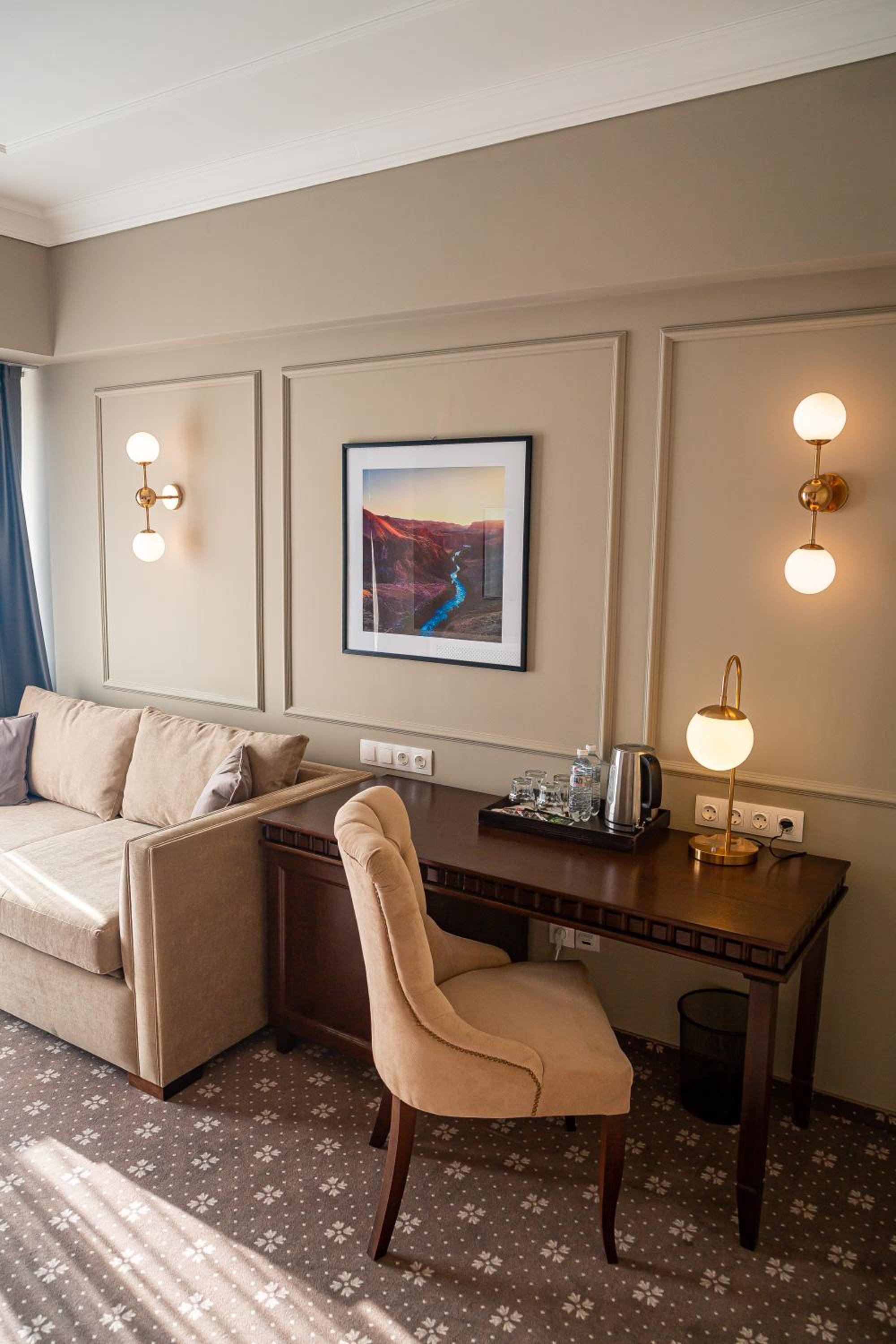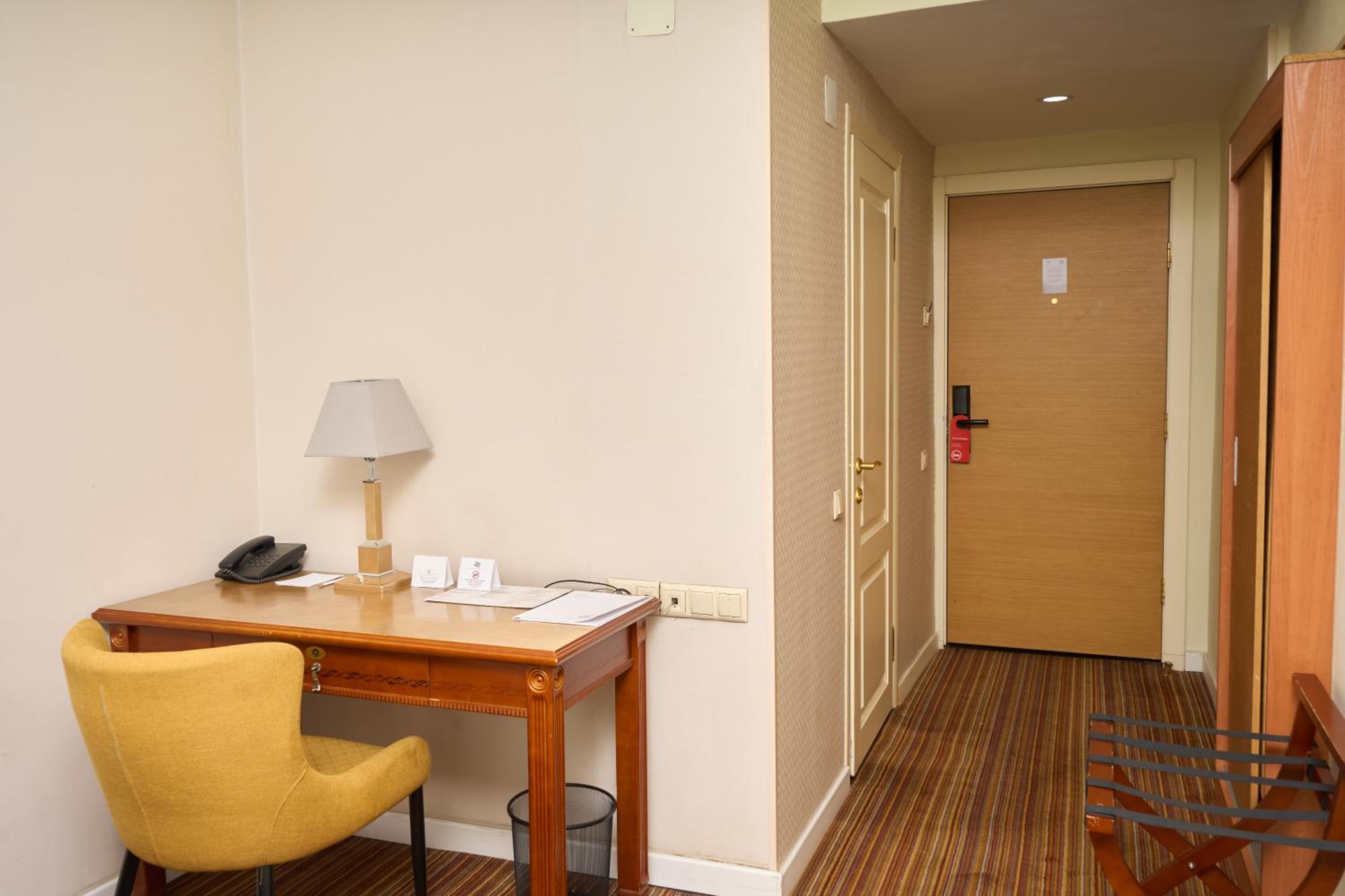 The rooms at Almaty Hotel are designed in a modern style and come equipped with all the necessary amenities such as a minibar, flat-screen TV, and fridge for a comfortable stay.