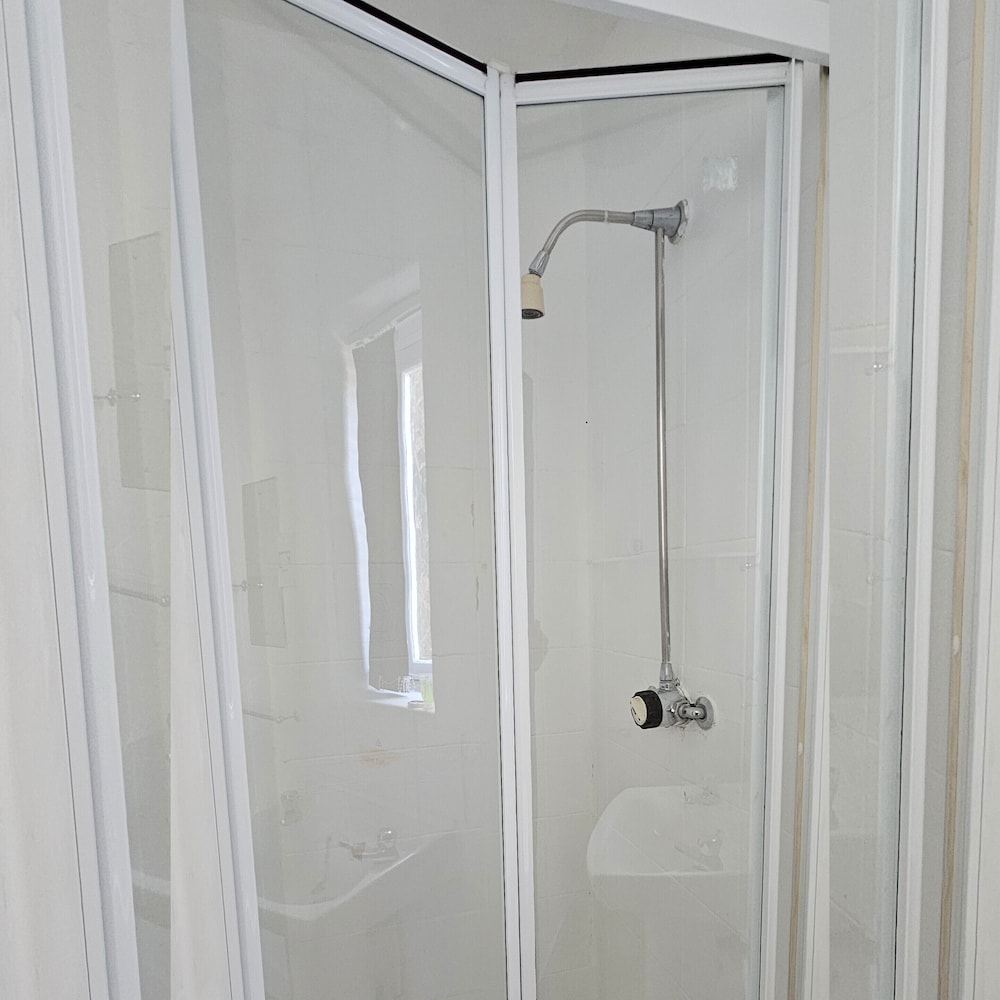 The room need a refurb as wall paper ripped and the door handle hanging off and shower doors dirty