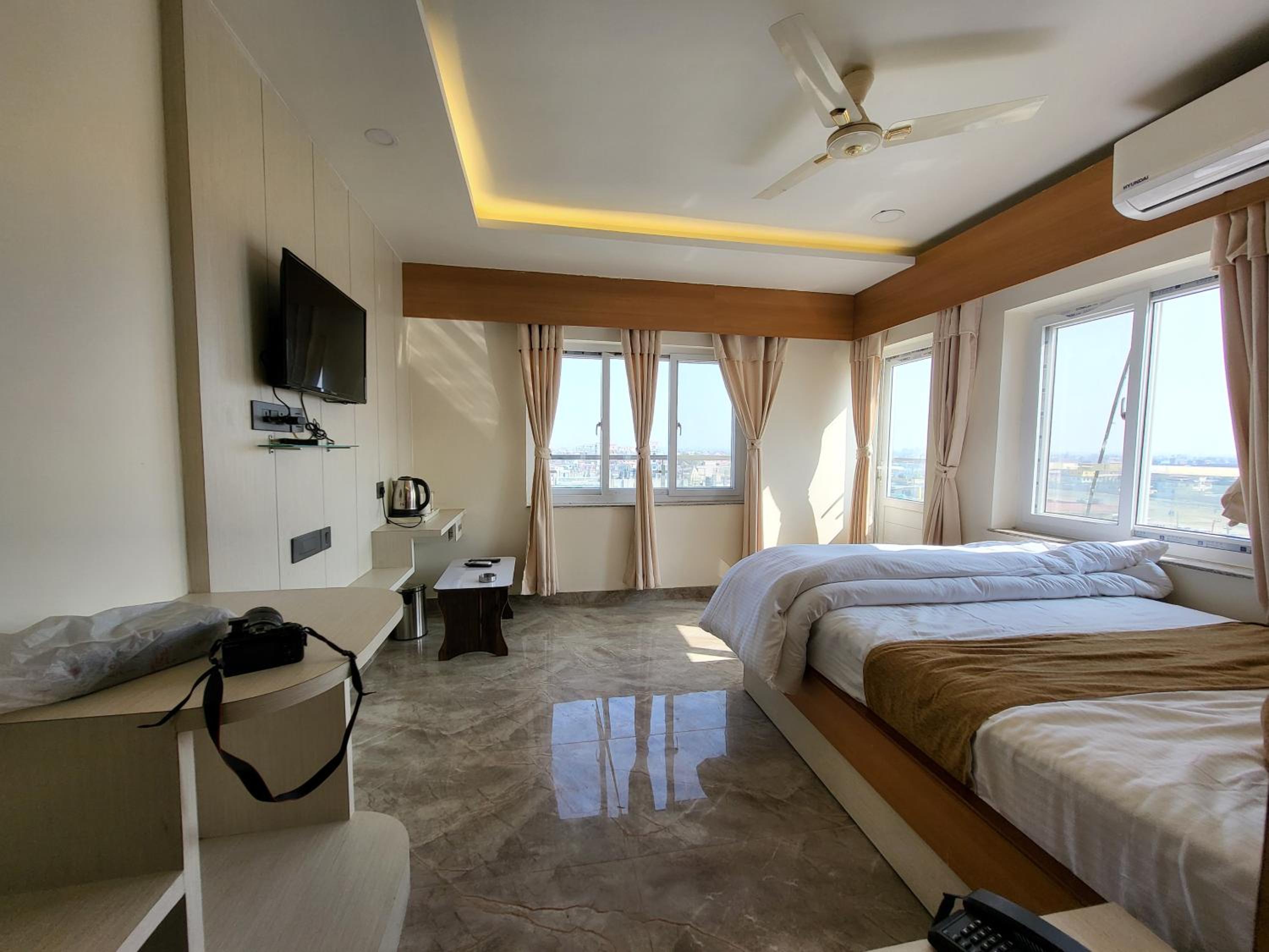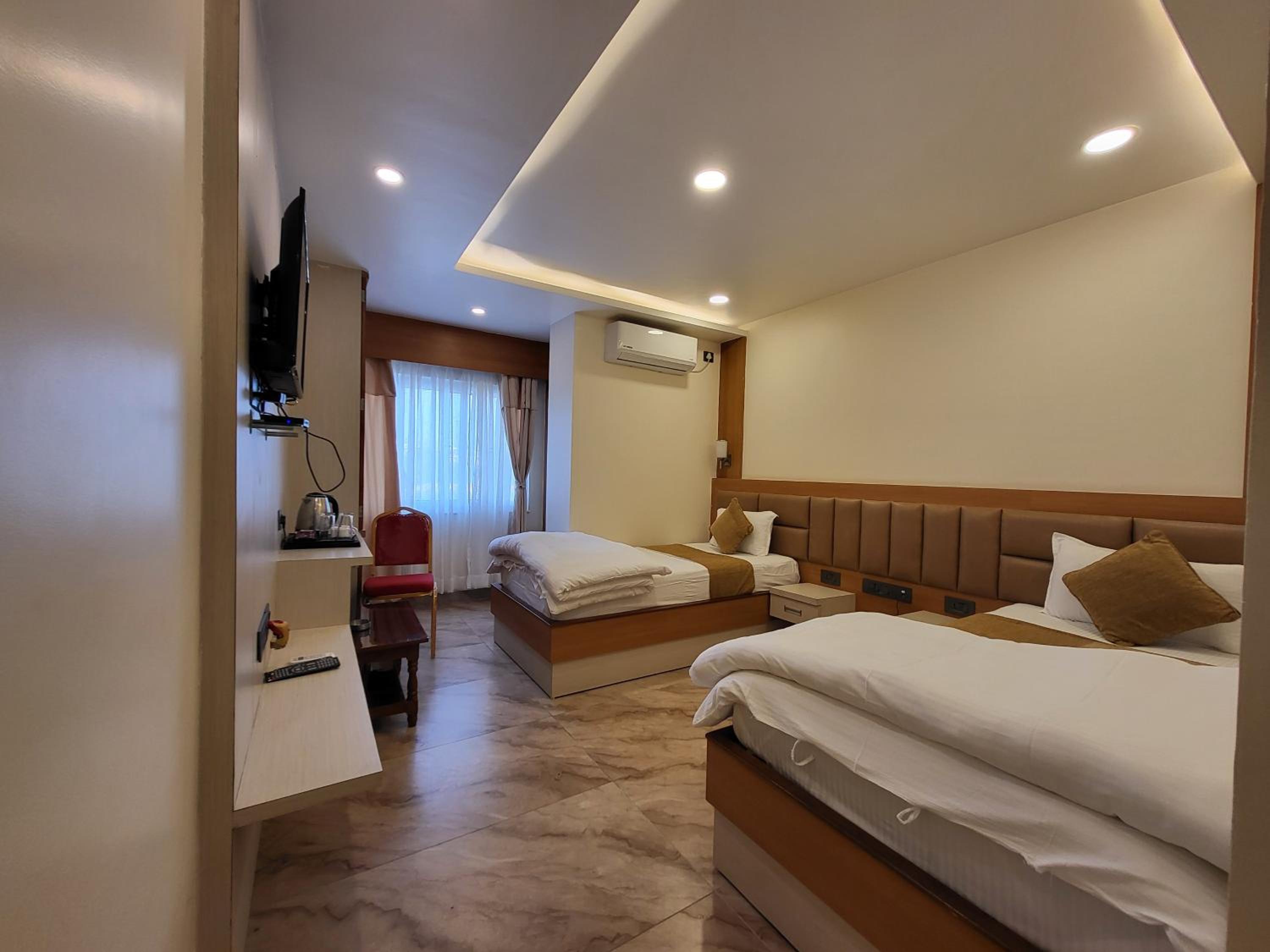 Emplacement à 10 minutes à pied du temple. A quelques minutes de l’aéroport. Chambre bien équipée avec une belle terrasse. Le restaurant au septième étage offre une belle vue sur la ville et aussi une cuisine népalaise qu’on a beau appréciée. Ils nous ont fait de délicieux cappucino avec une superbe machine à café. Le staff a été super sympathique. Le séjour pendant le festival a été un vrai succès