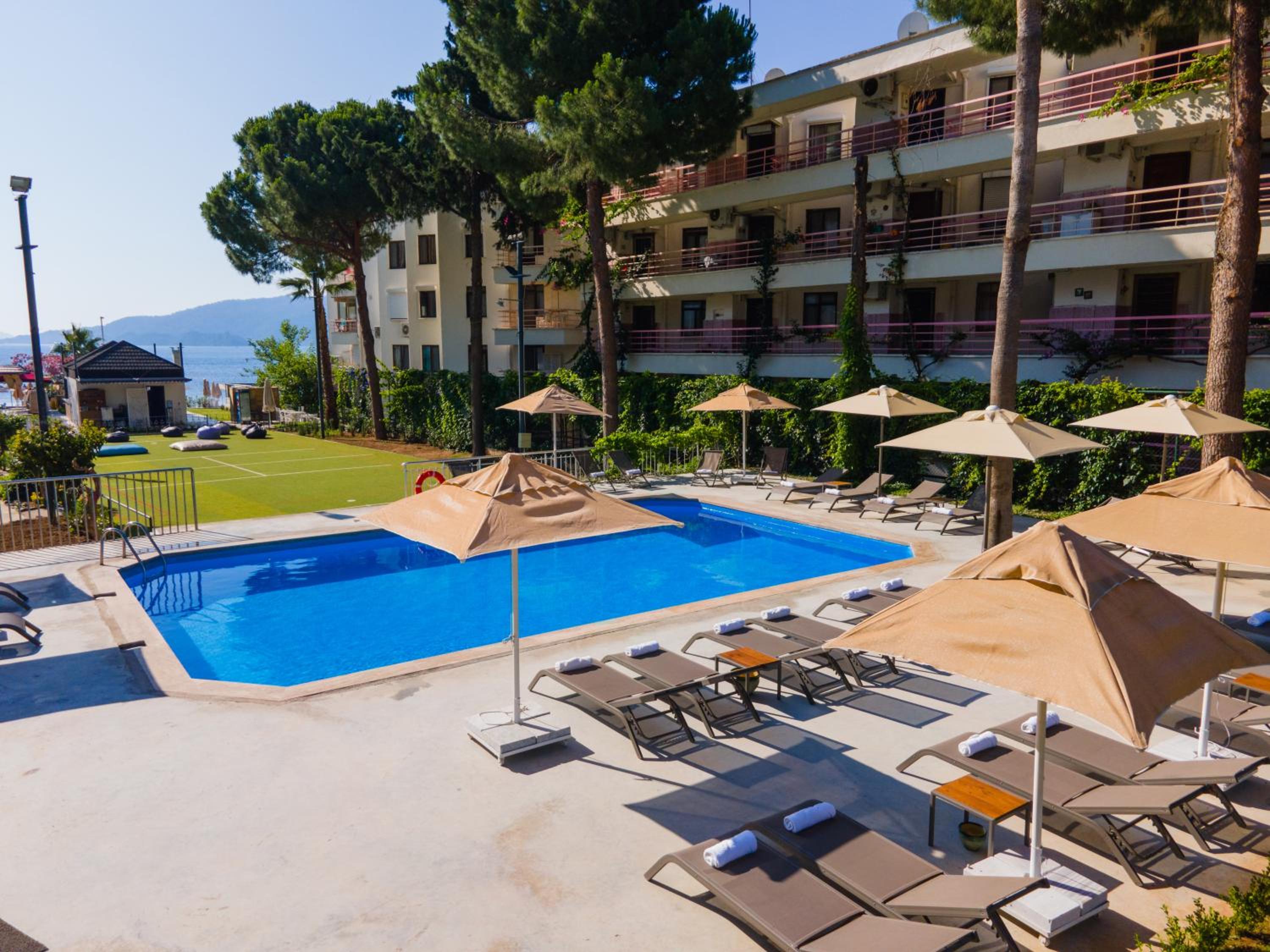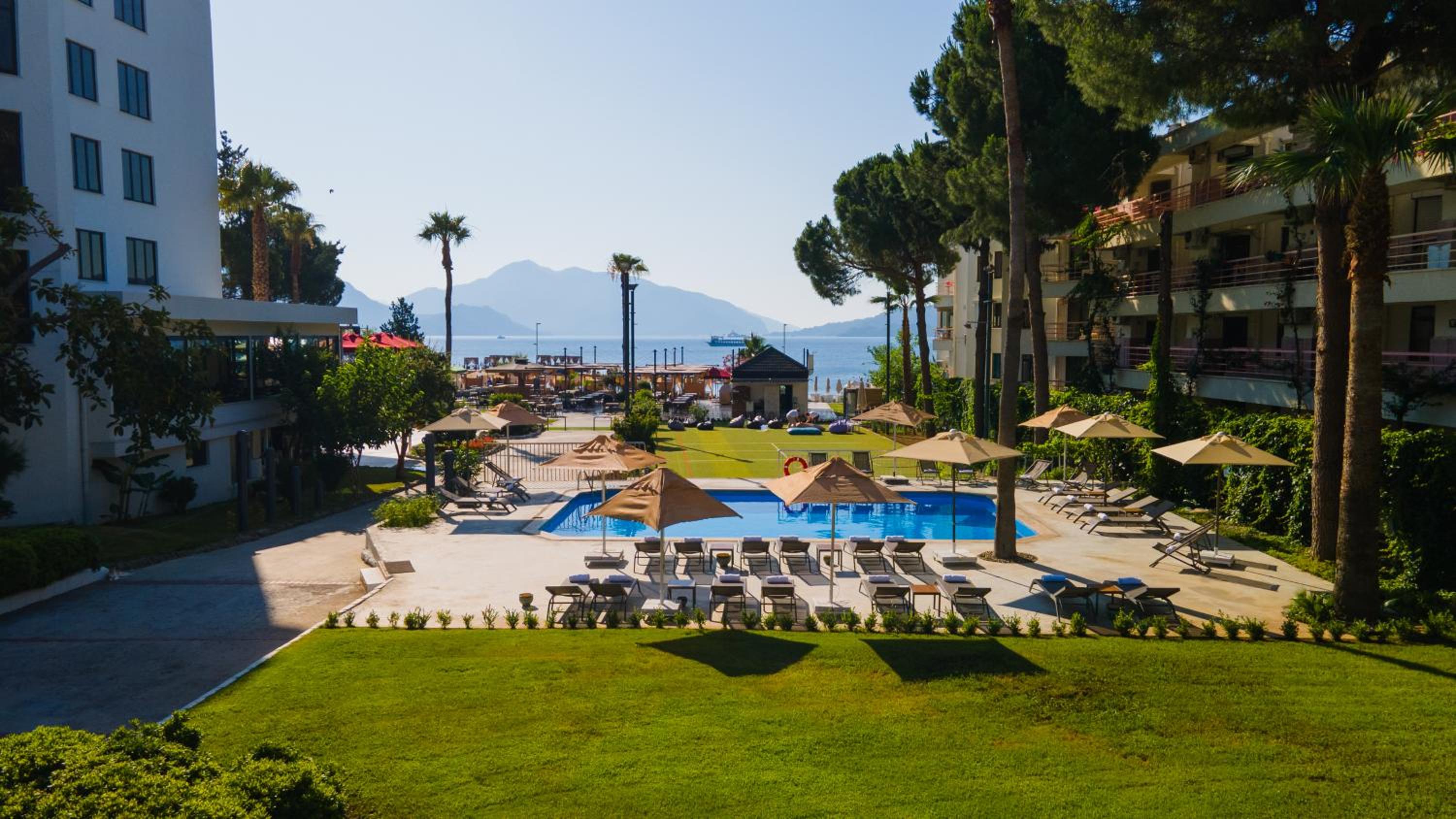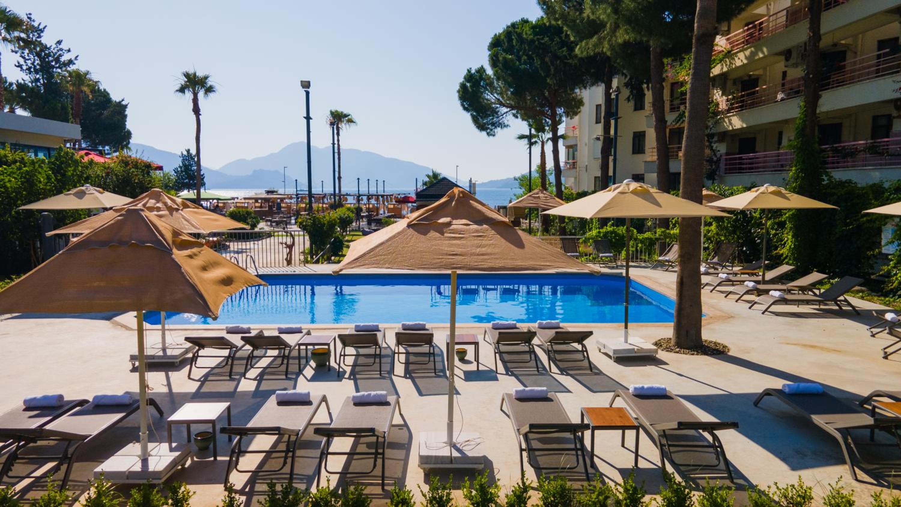 Самое лучшее расположение в Мармарисе - далеко до шумных баров и отелей близко к гавани, но при этом все еще Citiler, имхо в разы круче Icmeler, если не брать в расчет часть дорогих отелей на горе с собственными пляжами на понтонах, этот кусок лучший. Отель с прекрасным завтракам (реально браво, за неделю не надоело вообще), приемлимым состоянием номера (обновлялся явно недавно), тихо, приятная музыка в ресте по вечерам, свой пляж (условно свой, лежаки бесплатно но ими могут пользоваться за деньги кто угодно, в разгар сезона места себе находили), море отличное, учитывая особенность города (минимум транспортных средств вокруг, есть место где поплавать). Персоналу отдельное спасибо - особенно русскоговорящему сотруднику(це) на ресепшн и повару отеля