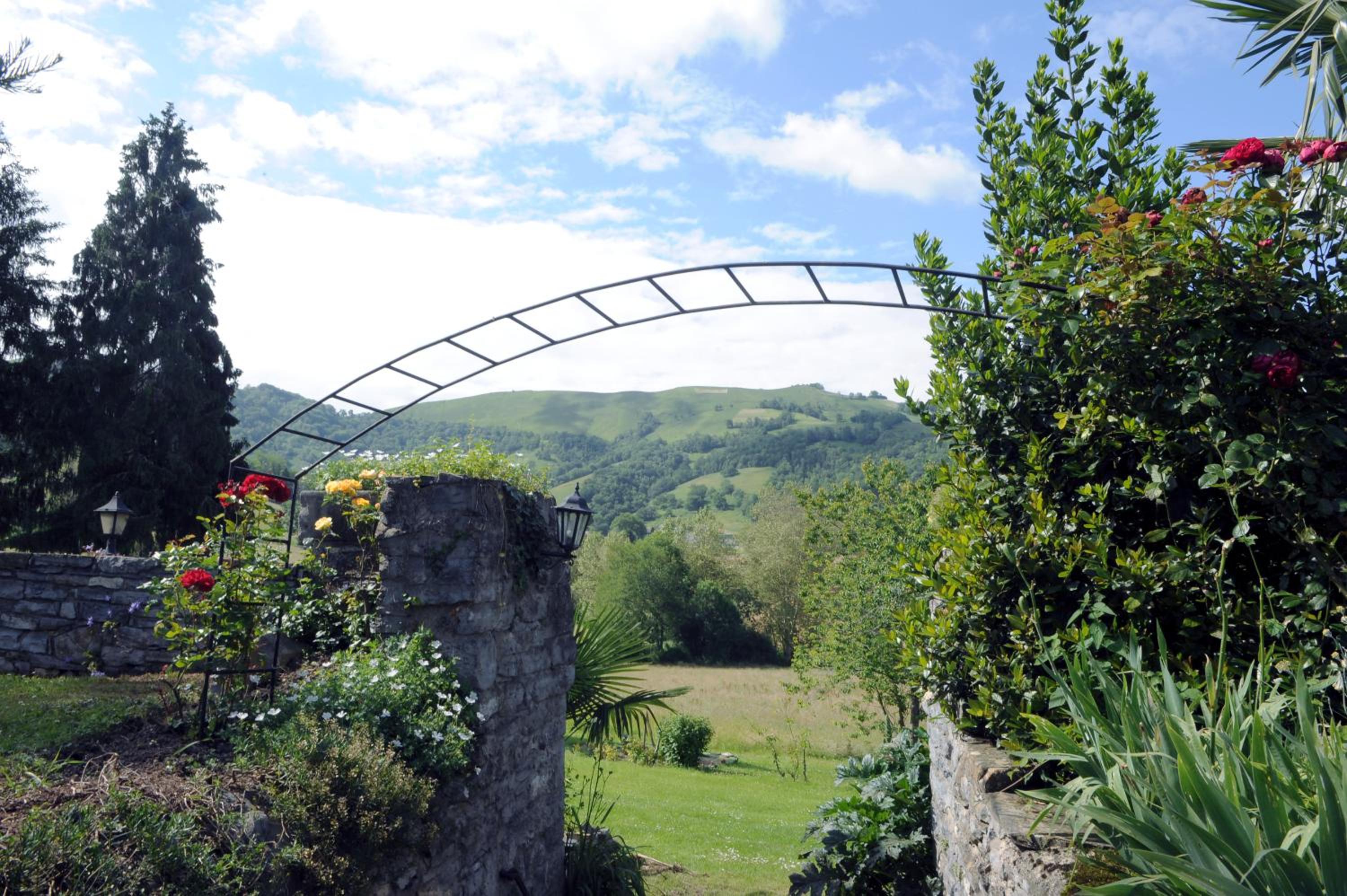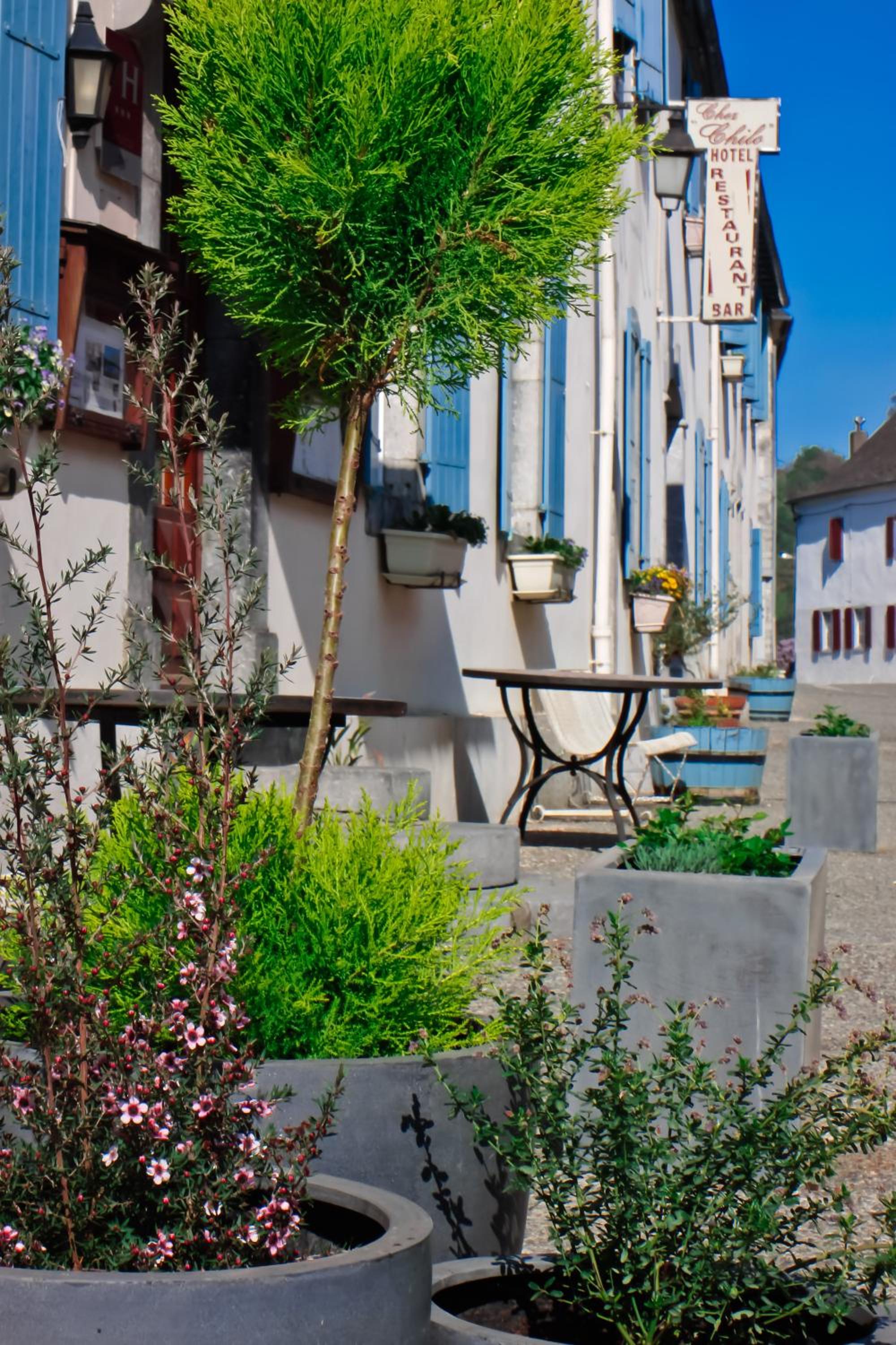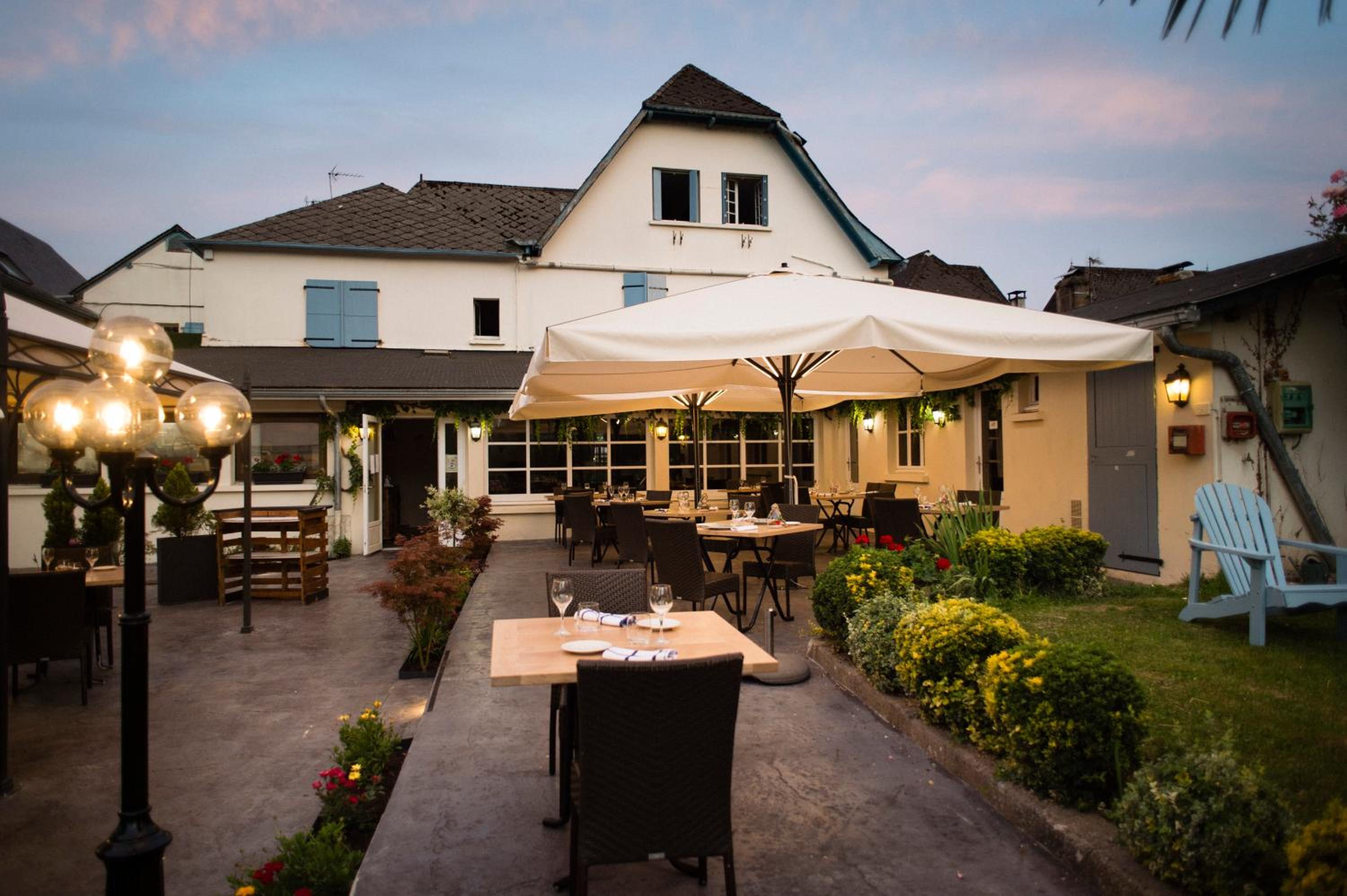 Scenic Surroundings: Nestled in the heart of the mountains in Barcus, Hotel Restaurant Chilo offers a serene escape with a picturesque tree-lined garden and a refreshing swimming pool.