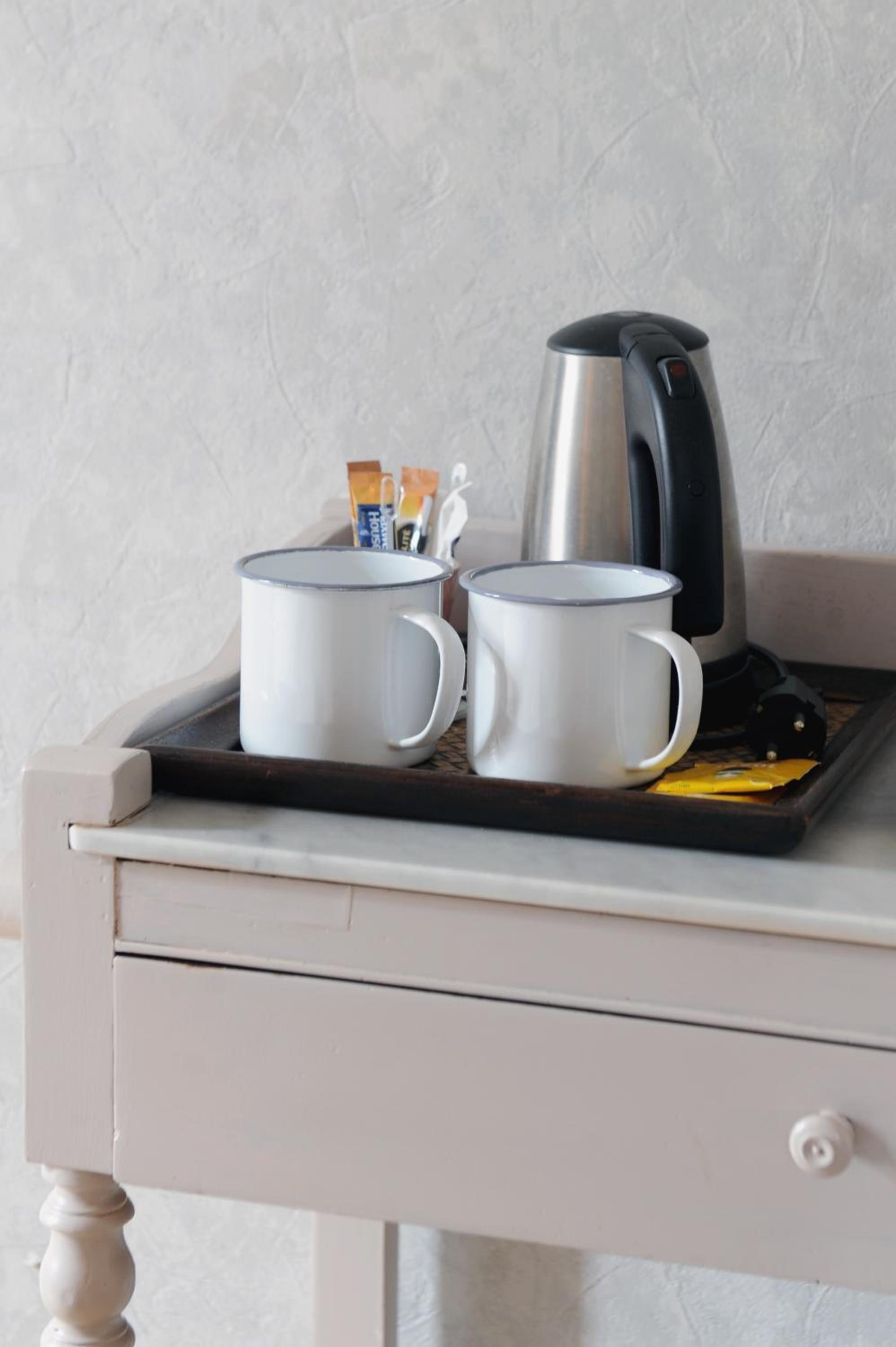 Une bouilloire à disposition comportant du calcaire et l’absence de tasse pour pouvoir l’utiliser