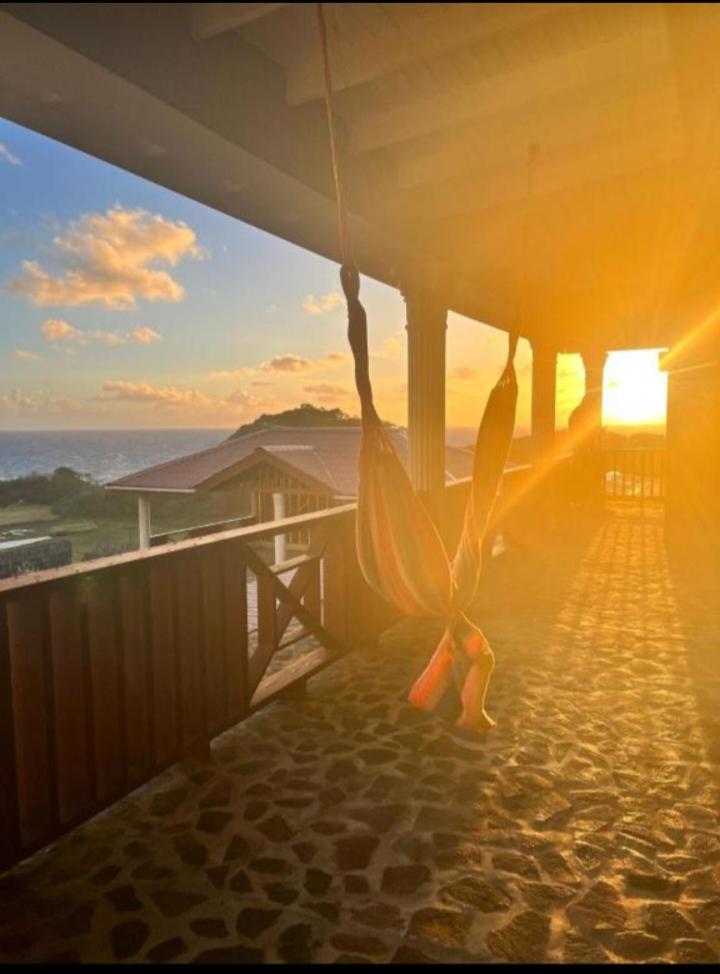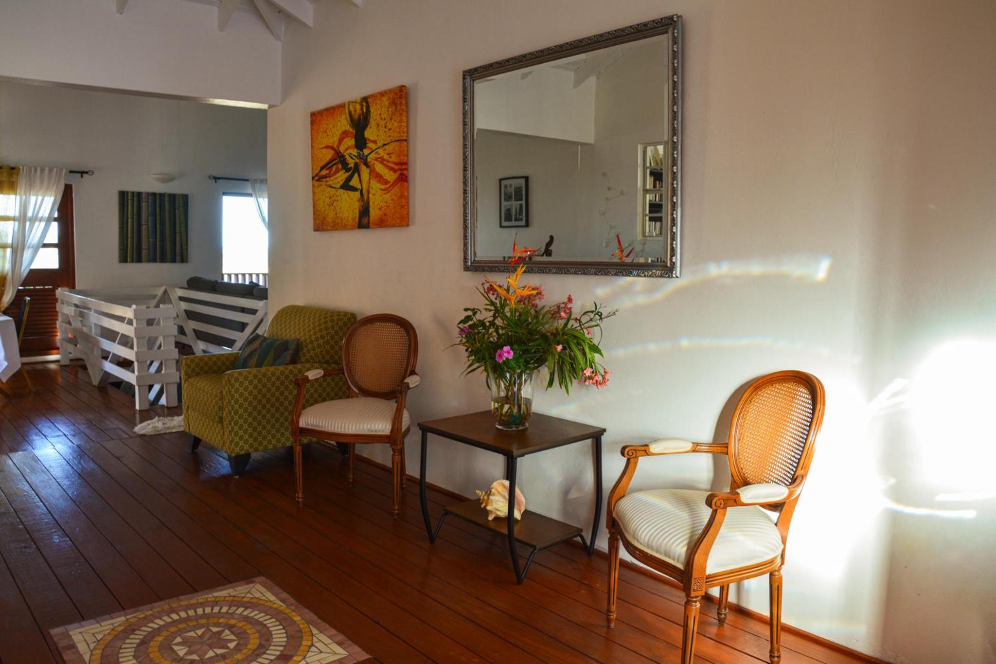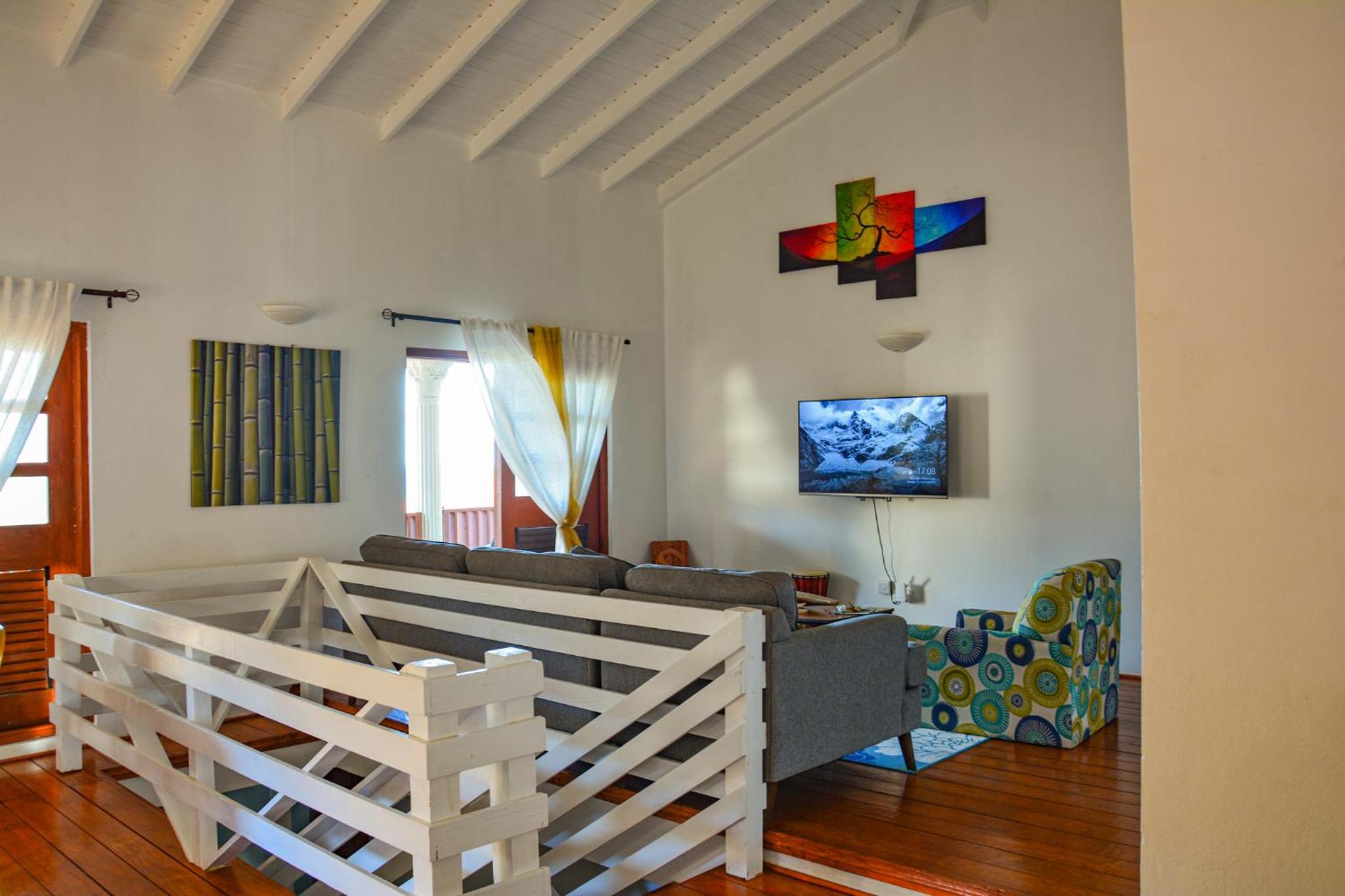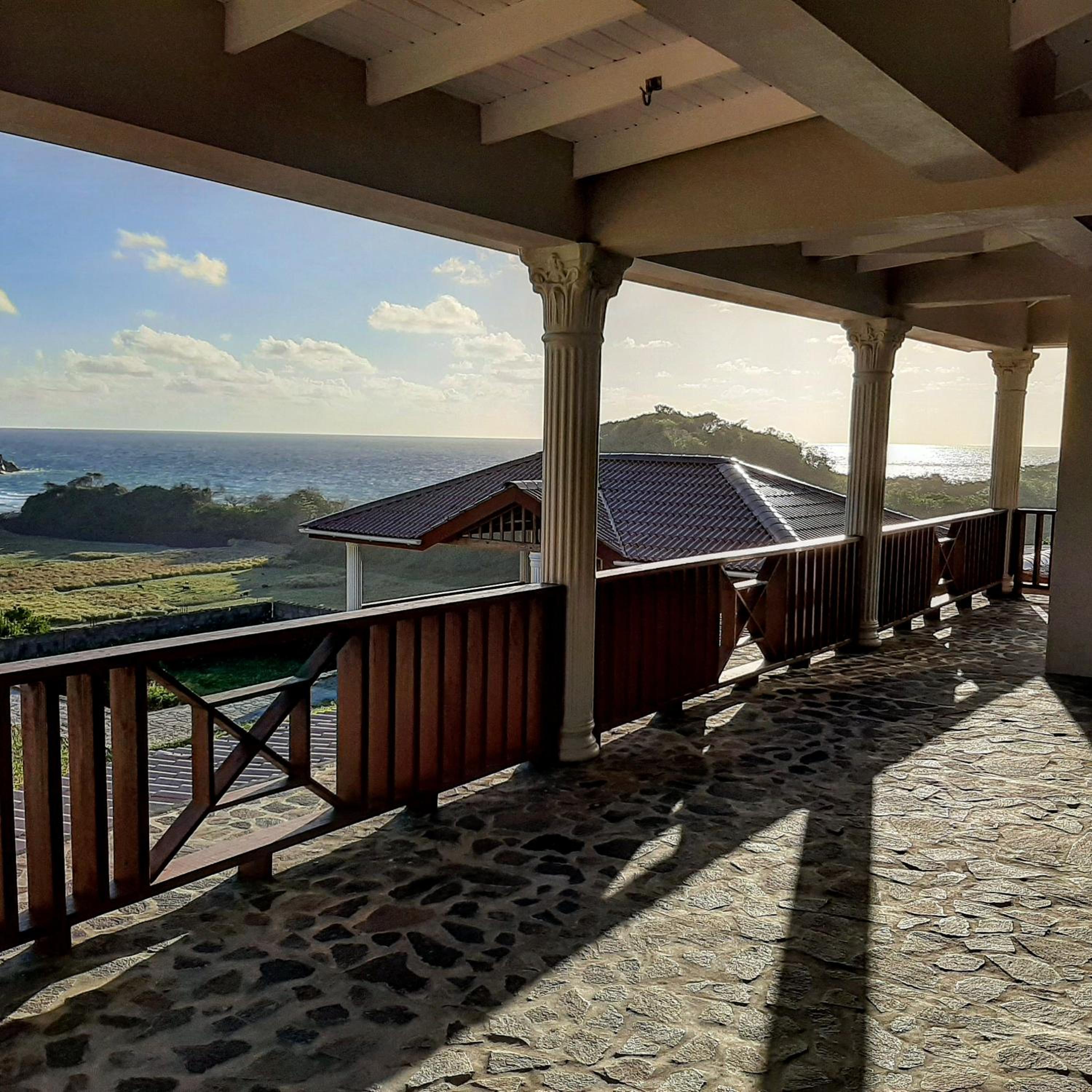 Peaceful and remote location with views of the Atlantic Ocean across a field with cows and a few goats. Lively breeze blowing across the terrace with comfortable seats. Lower bar with more seating on an outdoor covered deck. Quick trip from airport (definitely request a driver from the manager) but through backroads. If arriving at night, get a driver! King Bed was super comfortable, sliding door to upper deck. But the best part was Sharon, the owner! Excellent cook, warm, engaging and kind.