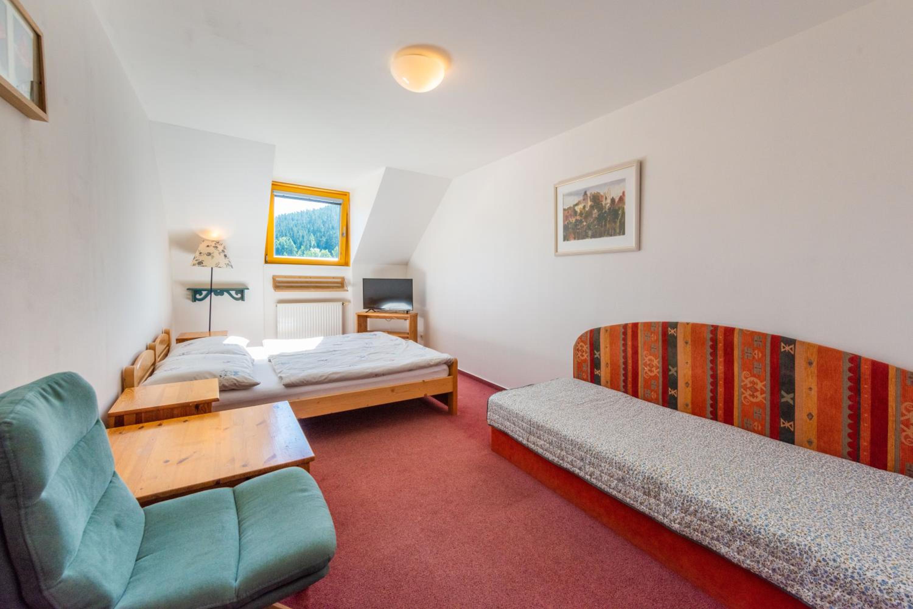 Luxurious Spa and Wellness Center: Hotel Modřín-Wellness v ceně offers a top-notch spa and wellness center with a fitness center, sauna, hot tub, and shared lounge. Relax and rejuvenate in style during your stay.