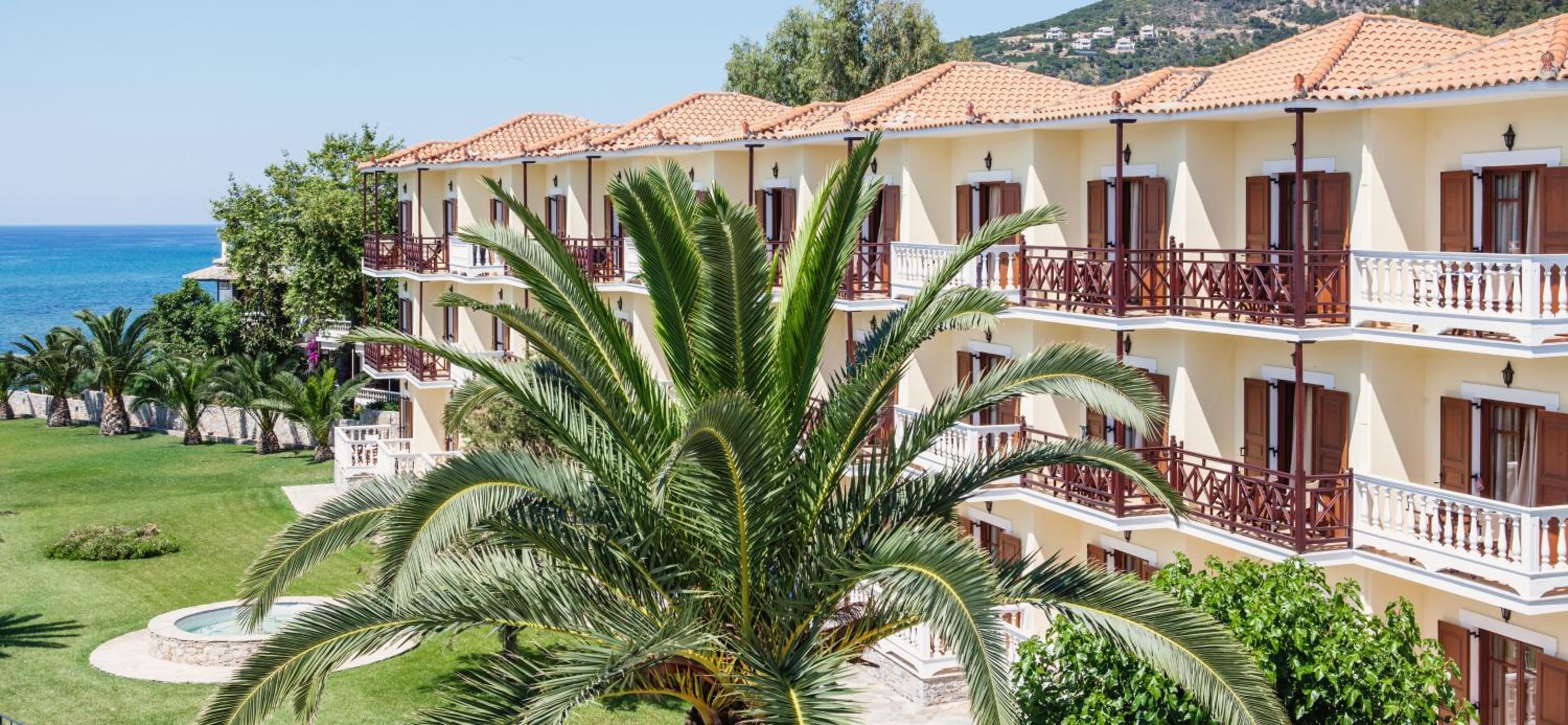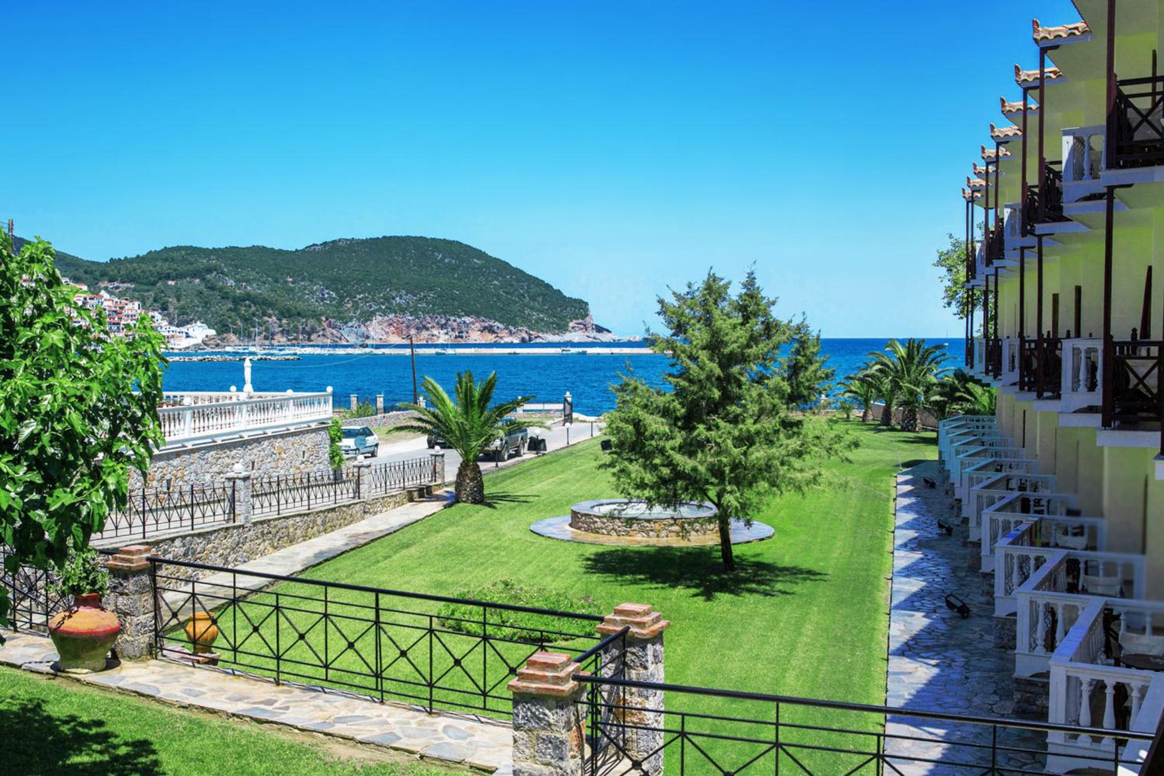 Friendly staff, nice rooms with very comfortable beds and pillows. Very clean in all areas. Very good and varied breakfasts and kind staff clearing and serving us. Can sit in or outside. Good showers with hot water. Small but nice balcony with fantastic views over Harbour and skopolos town. About a mile to walk to the other side of the harbour but all on the flat. Nearby tavernas and lovely little bar on way home, with many more to choose from on the way home. Skopolos town is fun to explore with lots of little back streets and steps up hillside. There is castle at the top. Bus runs about hourly and you can visit about 10 beaches. All lovely and have beach bar and chairs. Hotel has nice pool and chairs but I used the sea. Beach nice to swim near breezy bar.