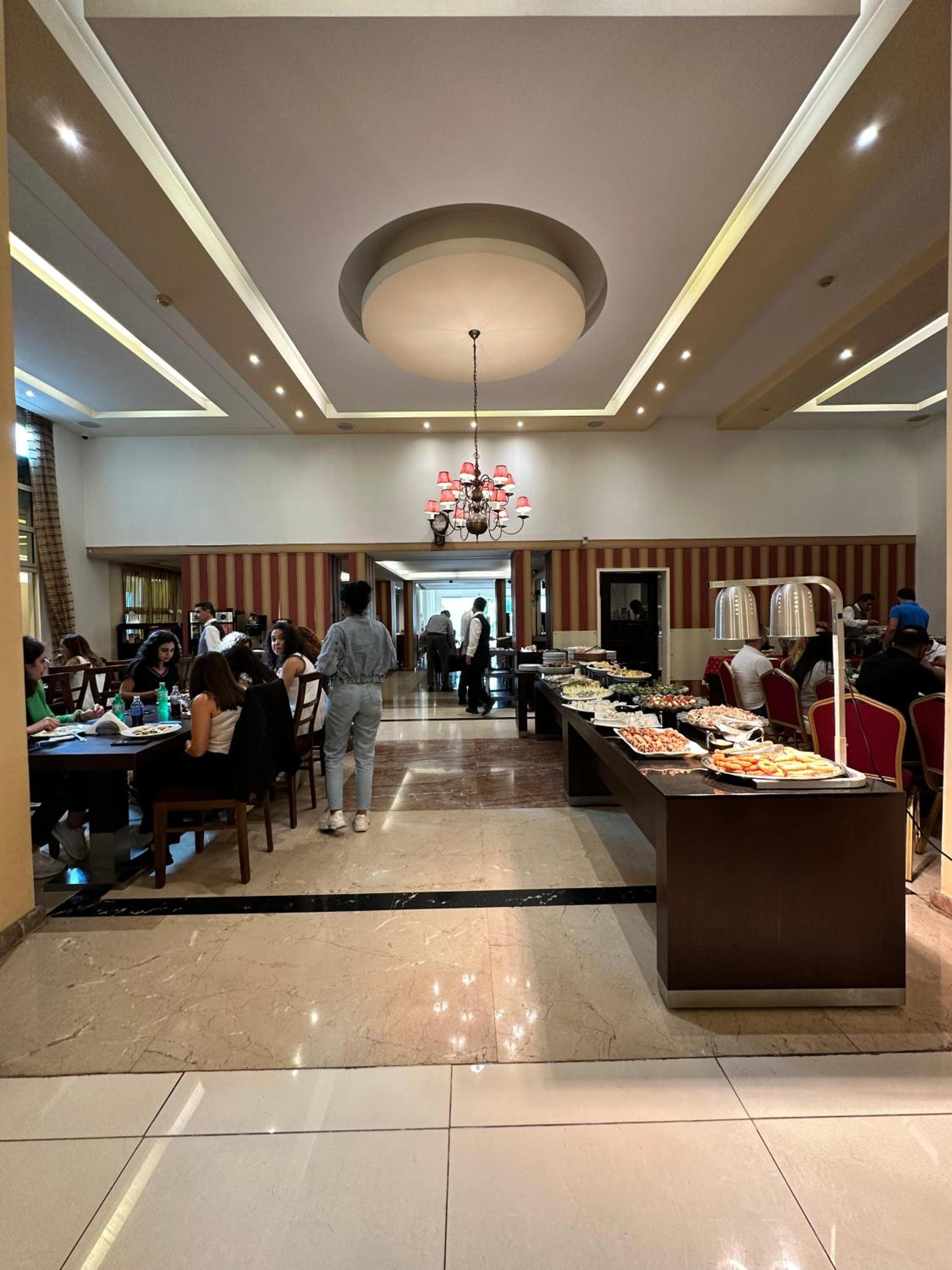 The tables in the dining area were not covered — there is truly a lack of attention to small details in the hotel. The overall appearance is very plain and minimalist, without care for details, which is a pity. The hotel has potential