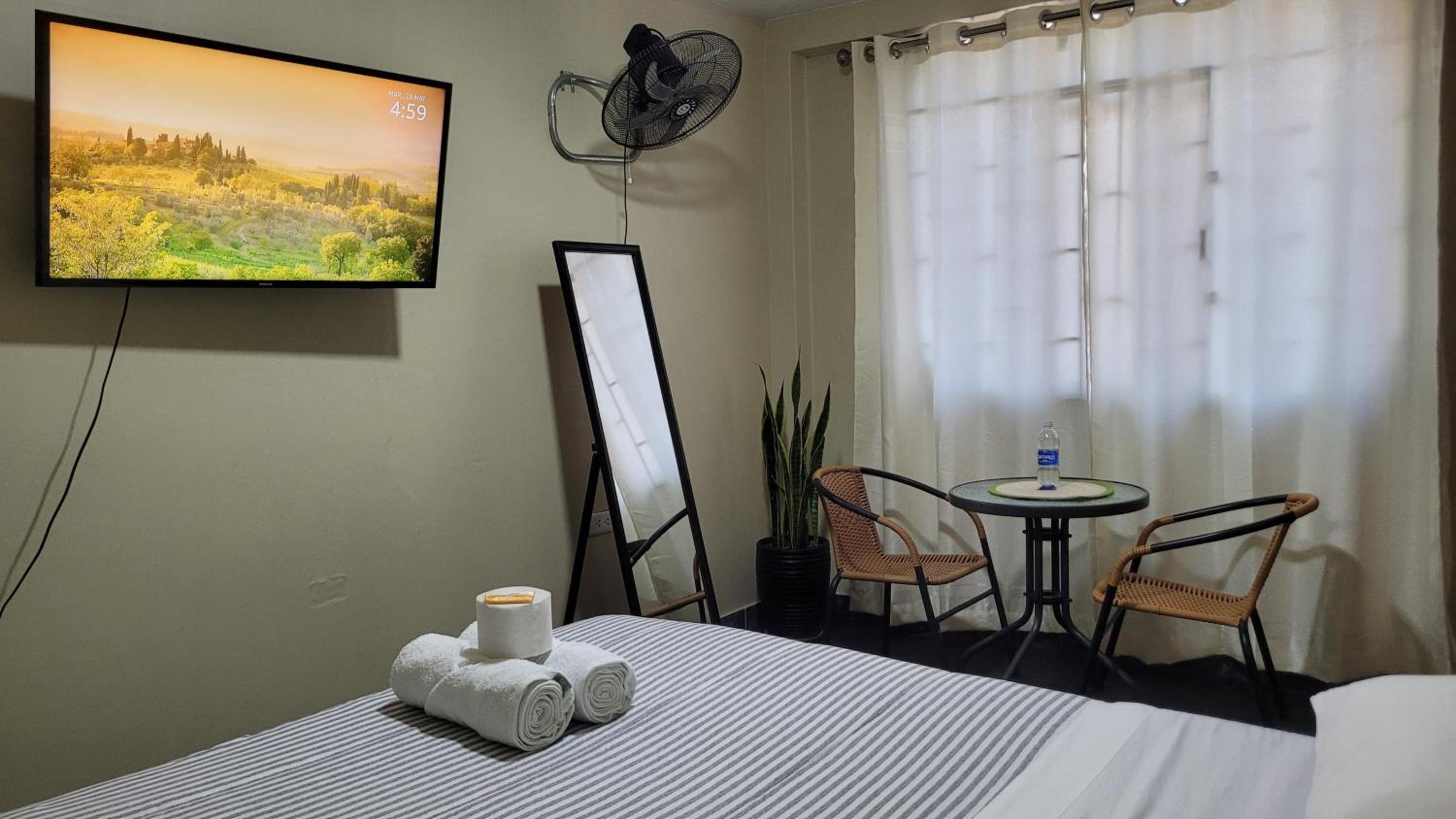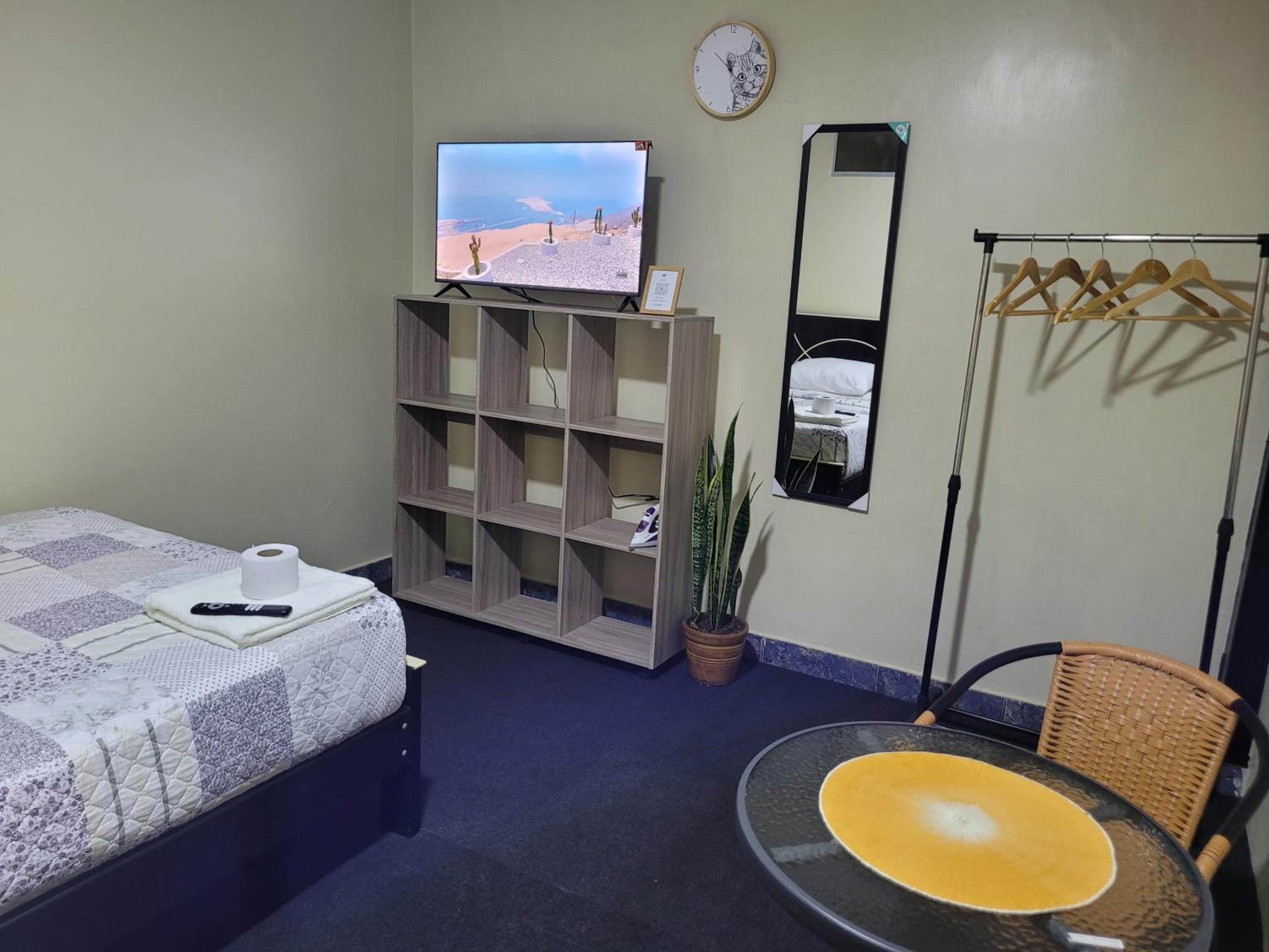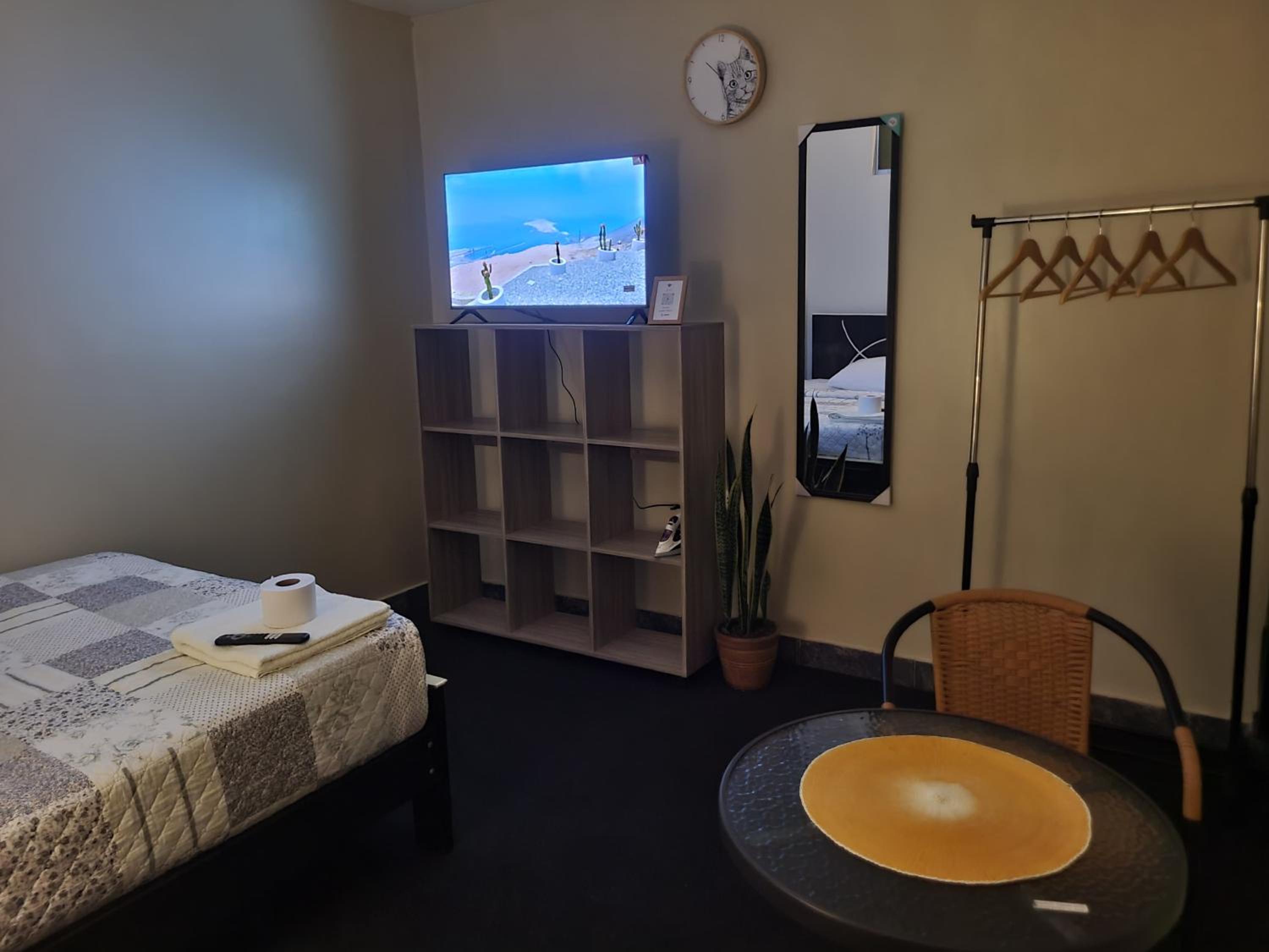Unwind in our well-equipped units featuring a desk, flat-screen TV, and cozy bed with fresh linens. Access the shared bathroom with plush towels provided.