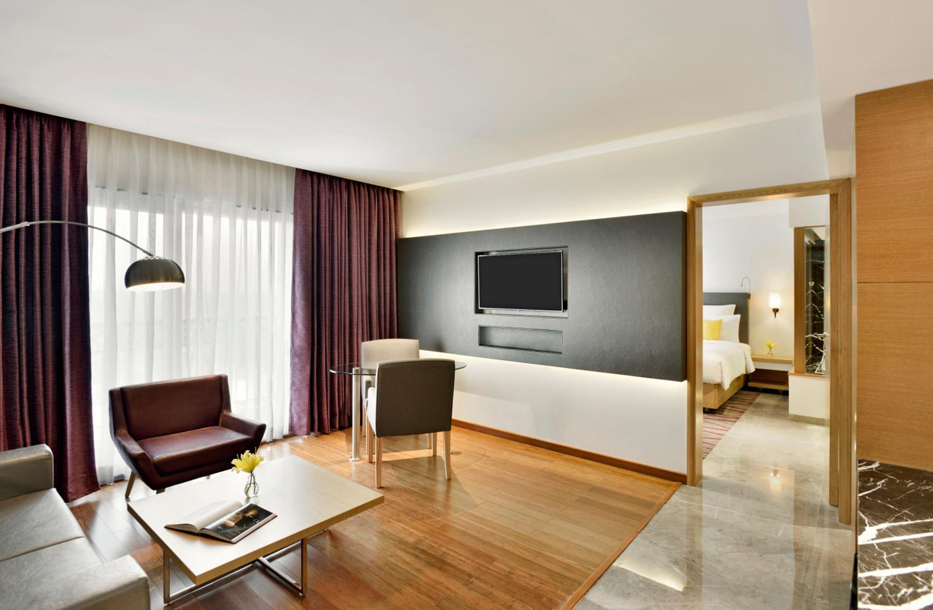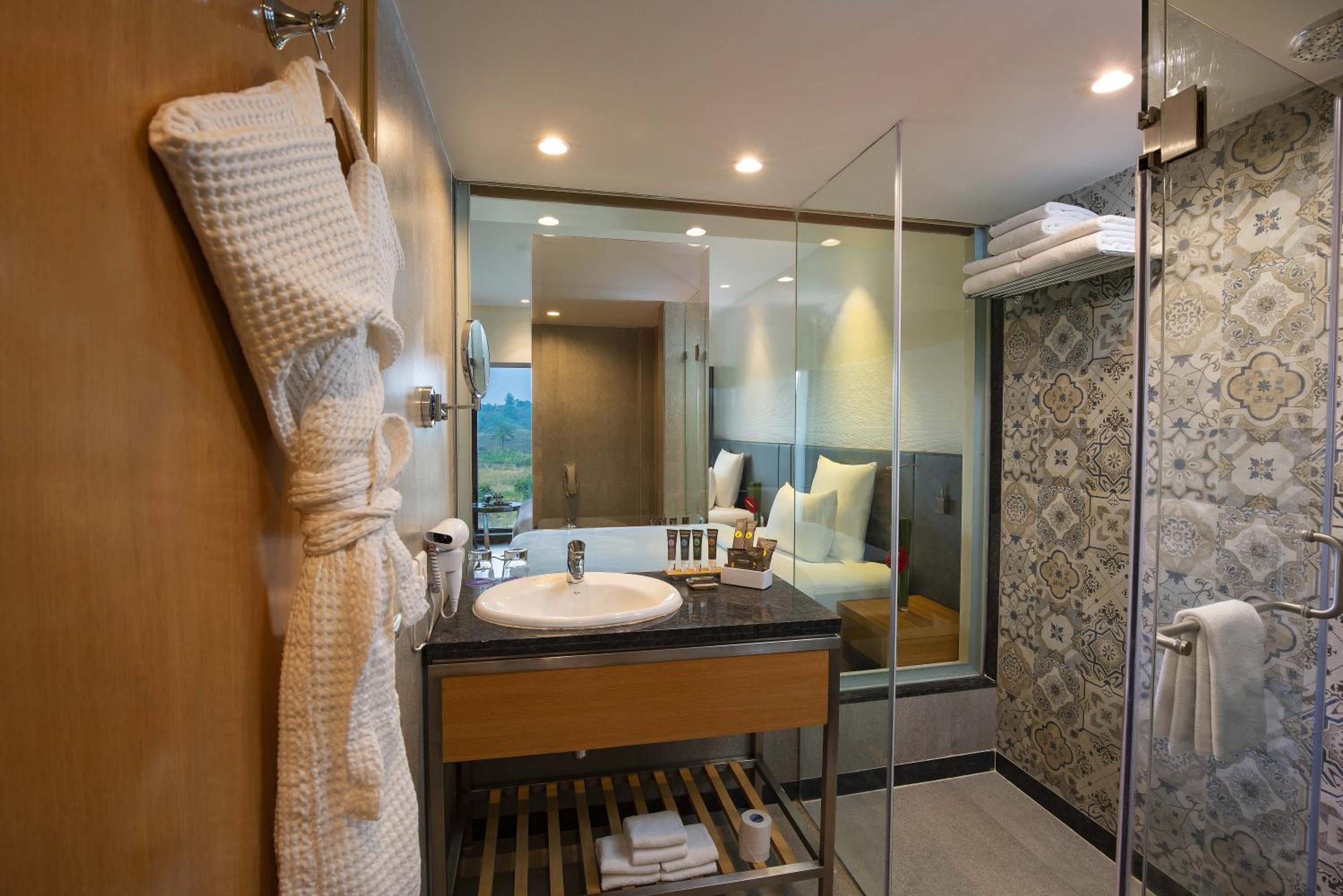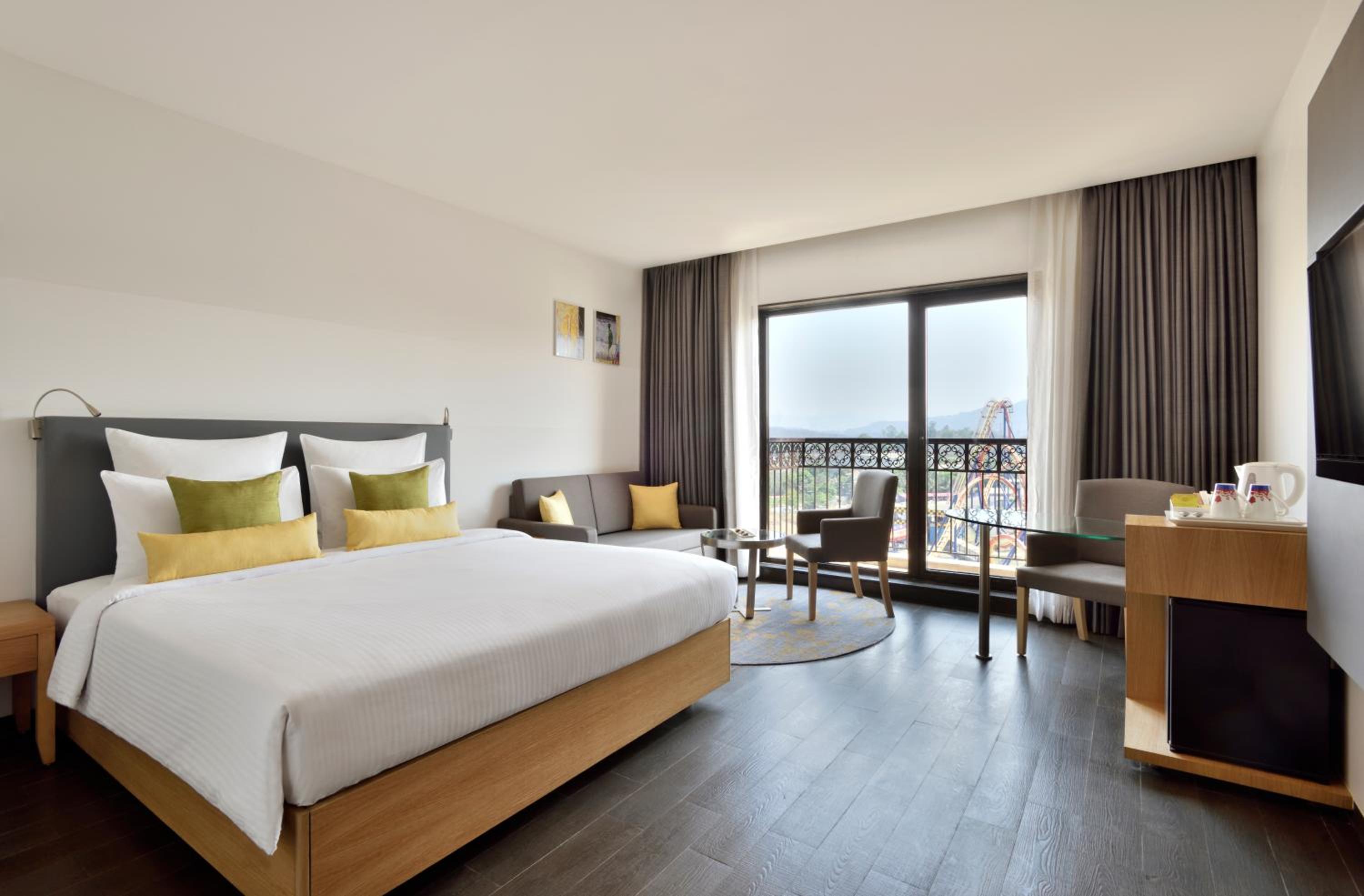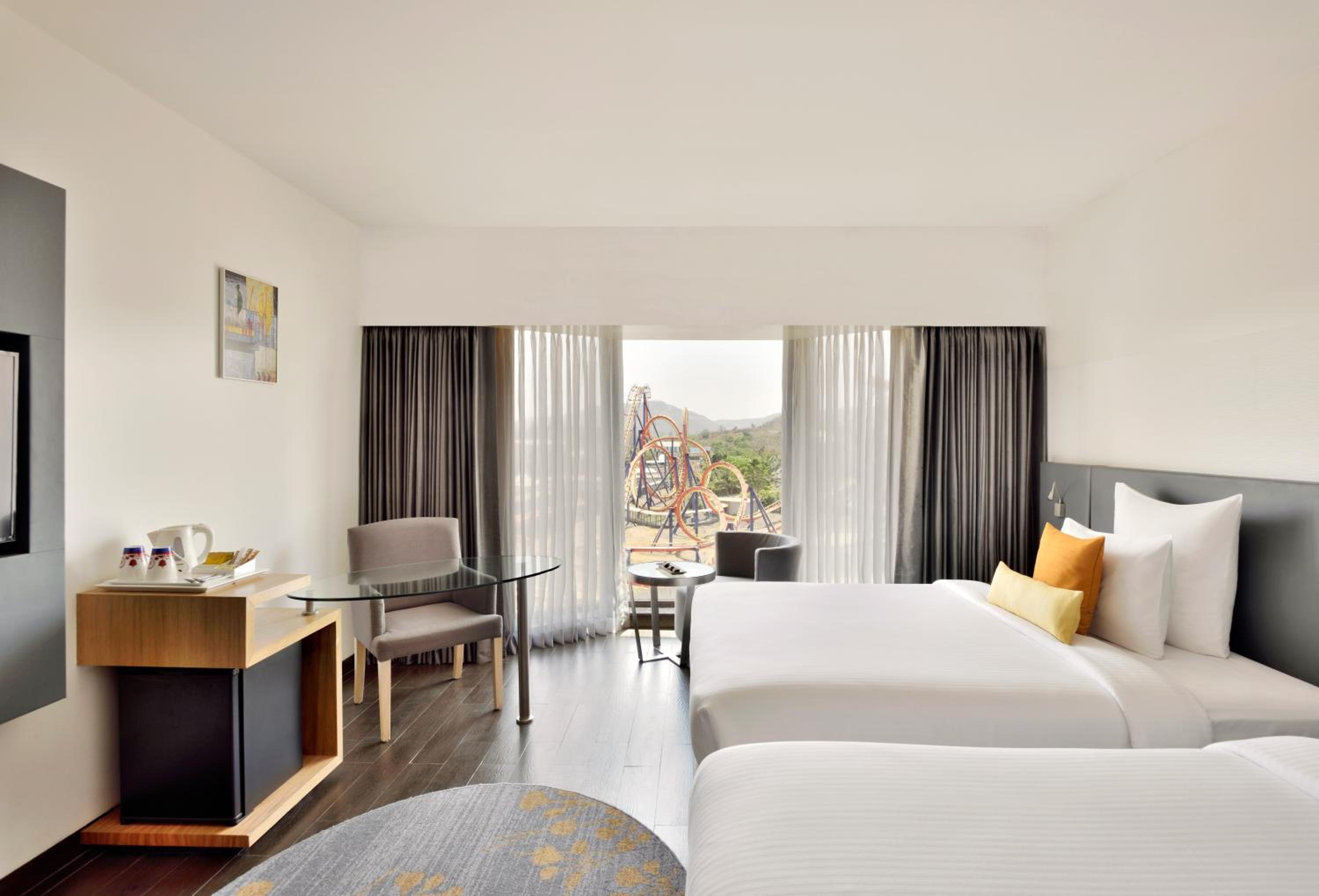 Novotel Imagica Khopoli offers air-conditioned rooms with modern amenities, ensuring a comfortable stay. Each room features a flat-screen TV, minibar, and private bathroom with bathrobes and slippers.