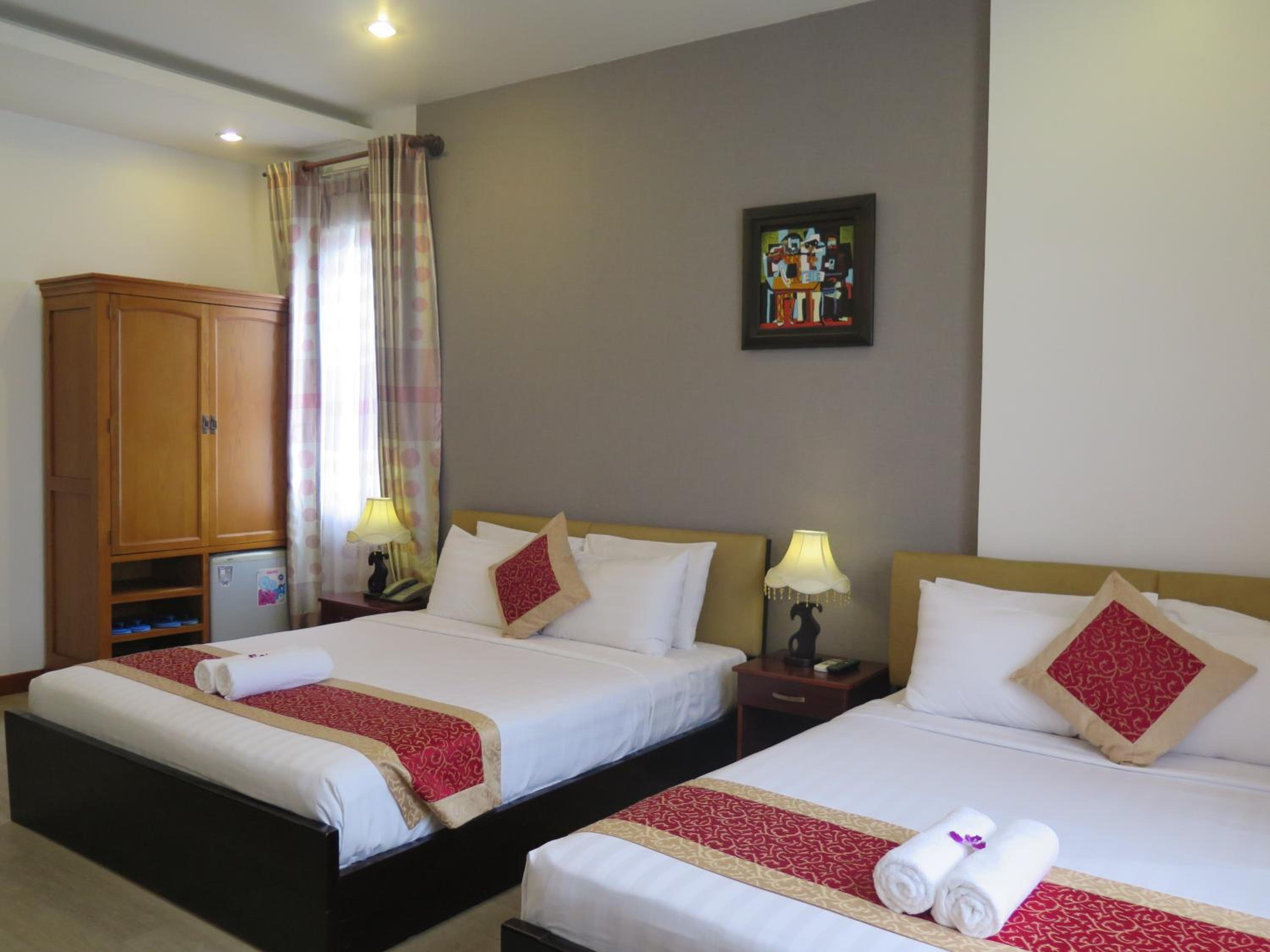 The hotel offers air-conditioned rooms with cable TV, a fridge with minibar, and private bathrooms with hot showers, ensuring a comfortable stay for guests.