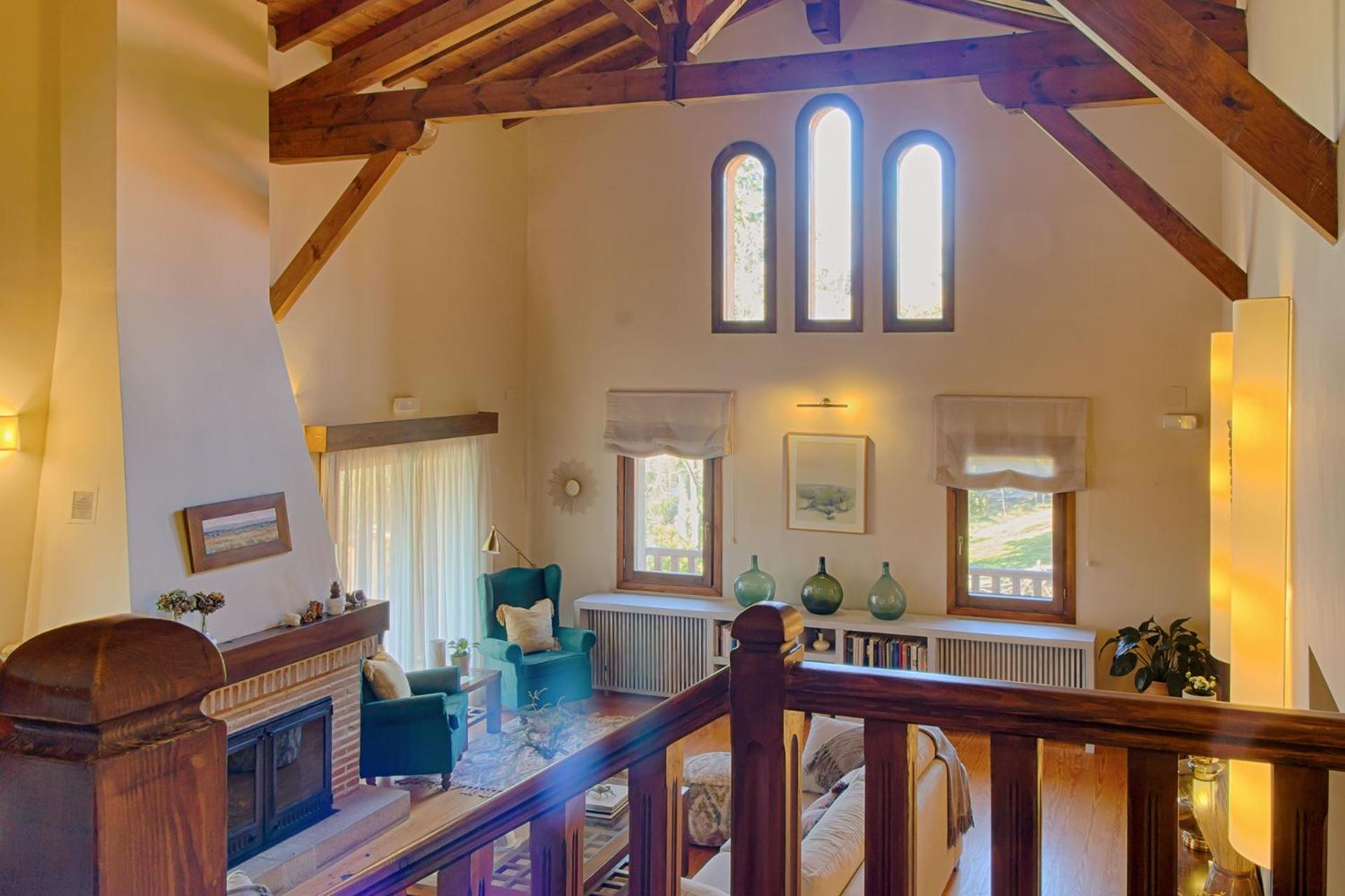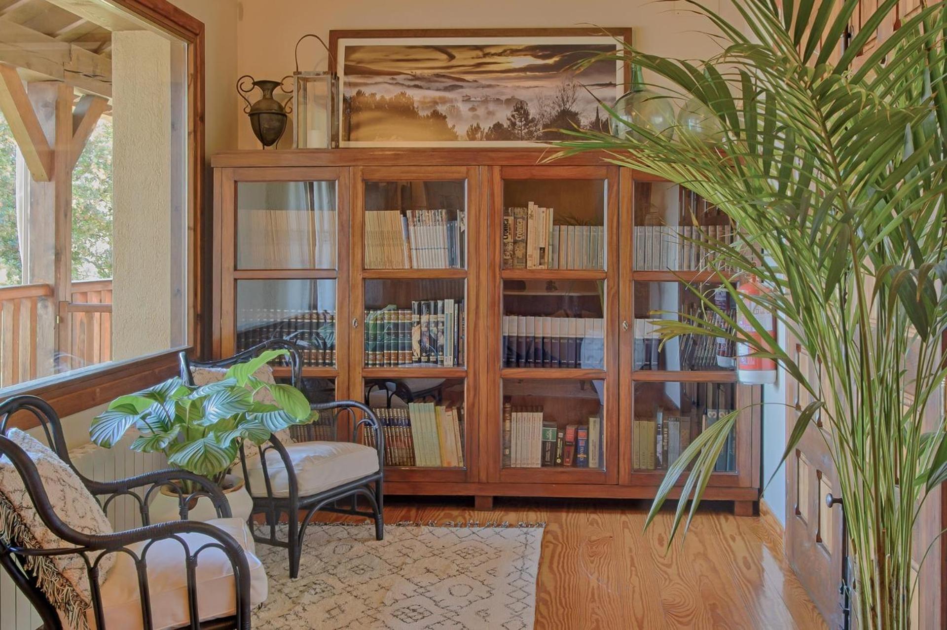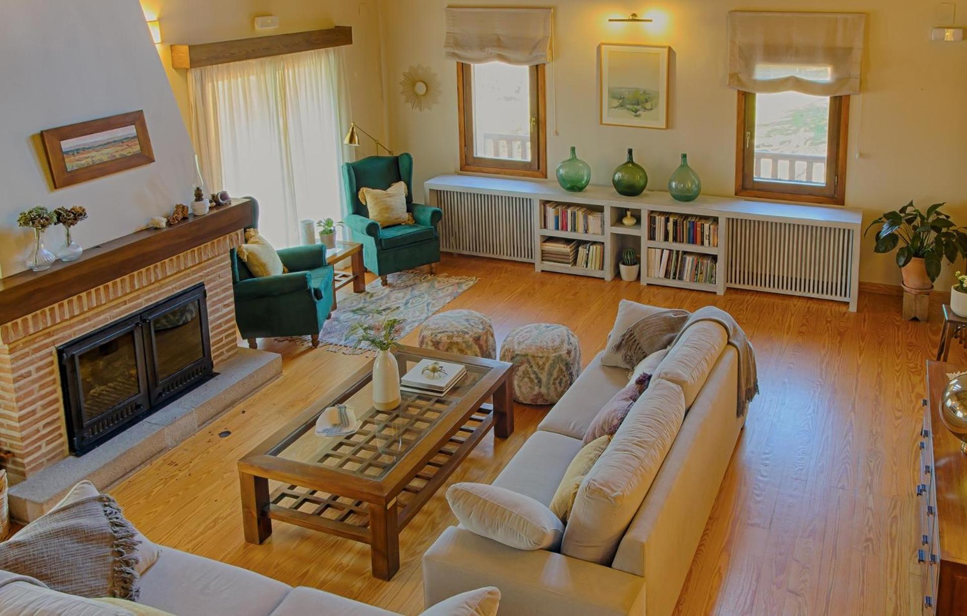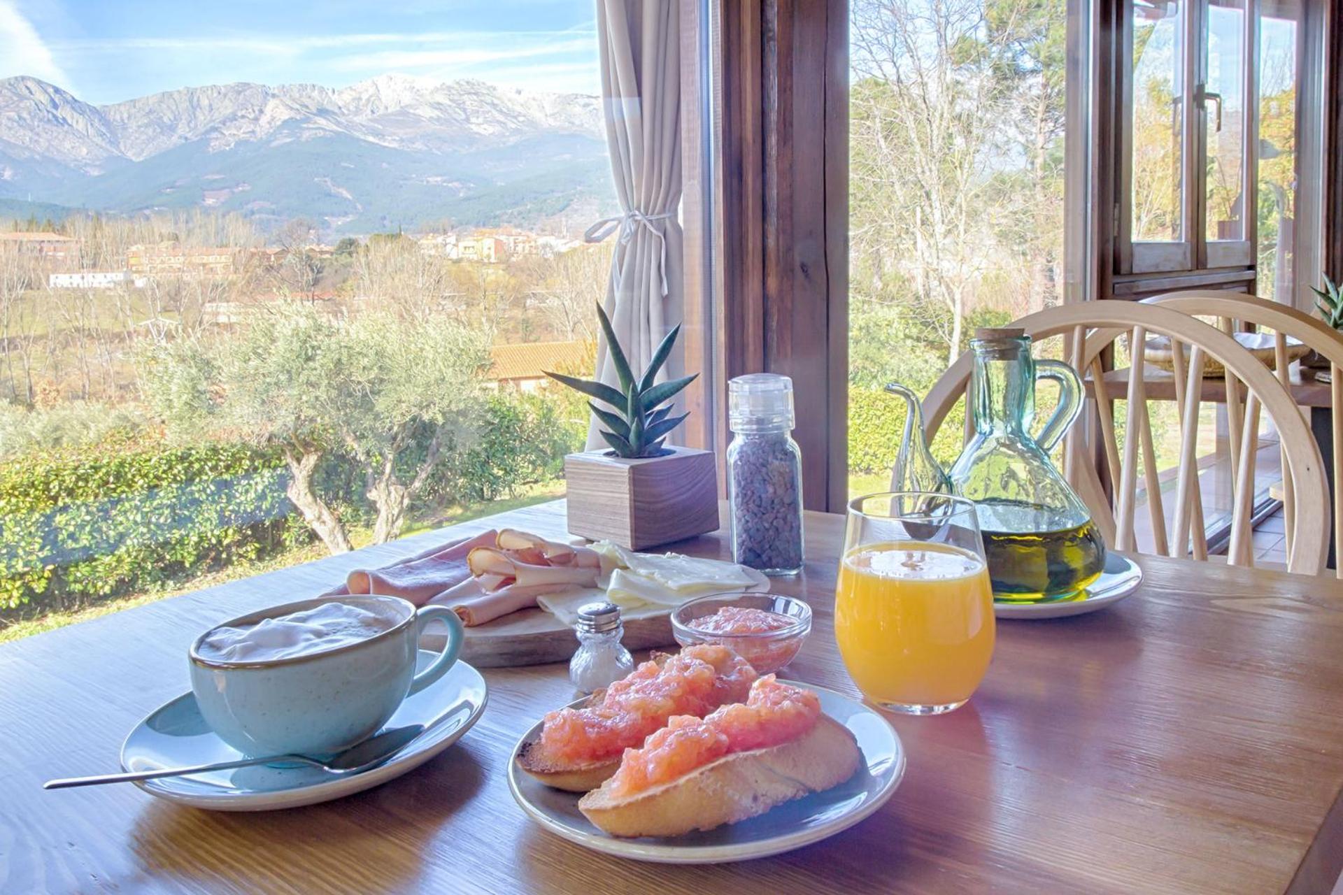 El desayuno con vistas es una pasada y también se puede disfrutar del saloncito con sofás y chimenea.