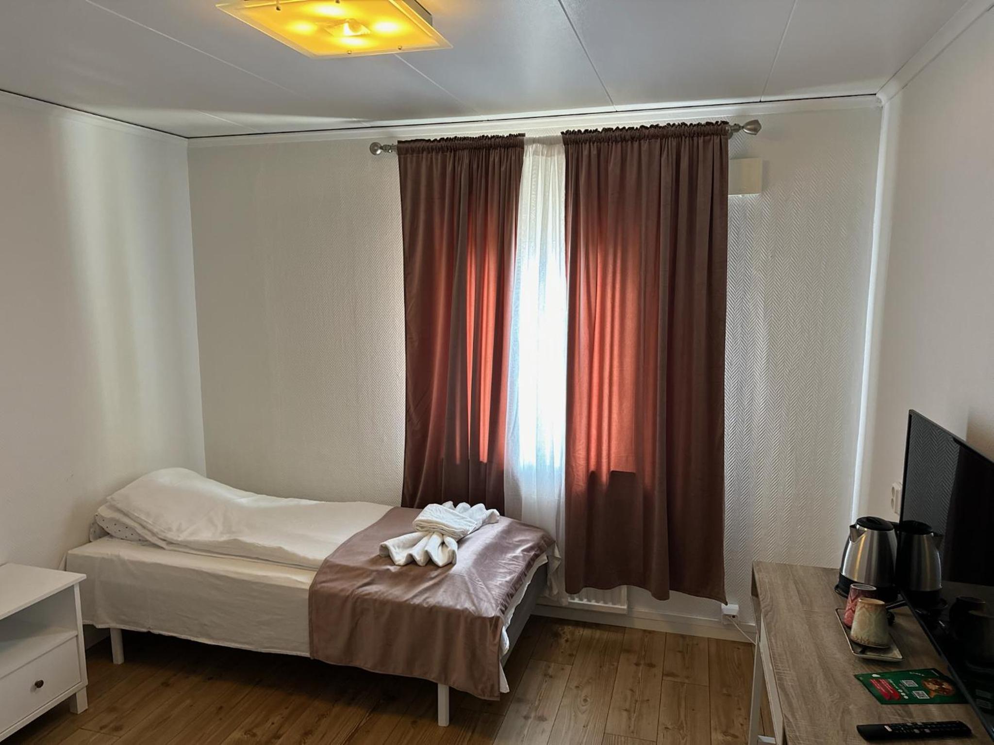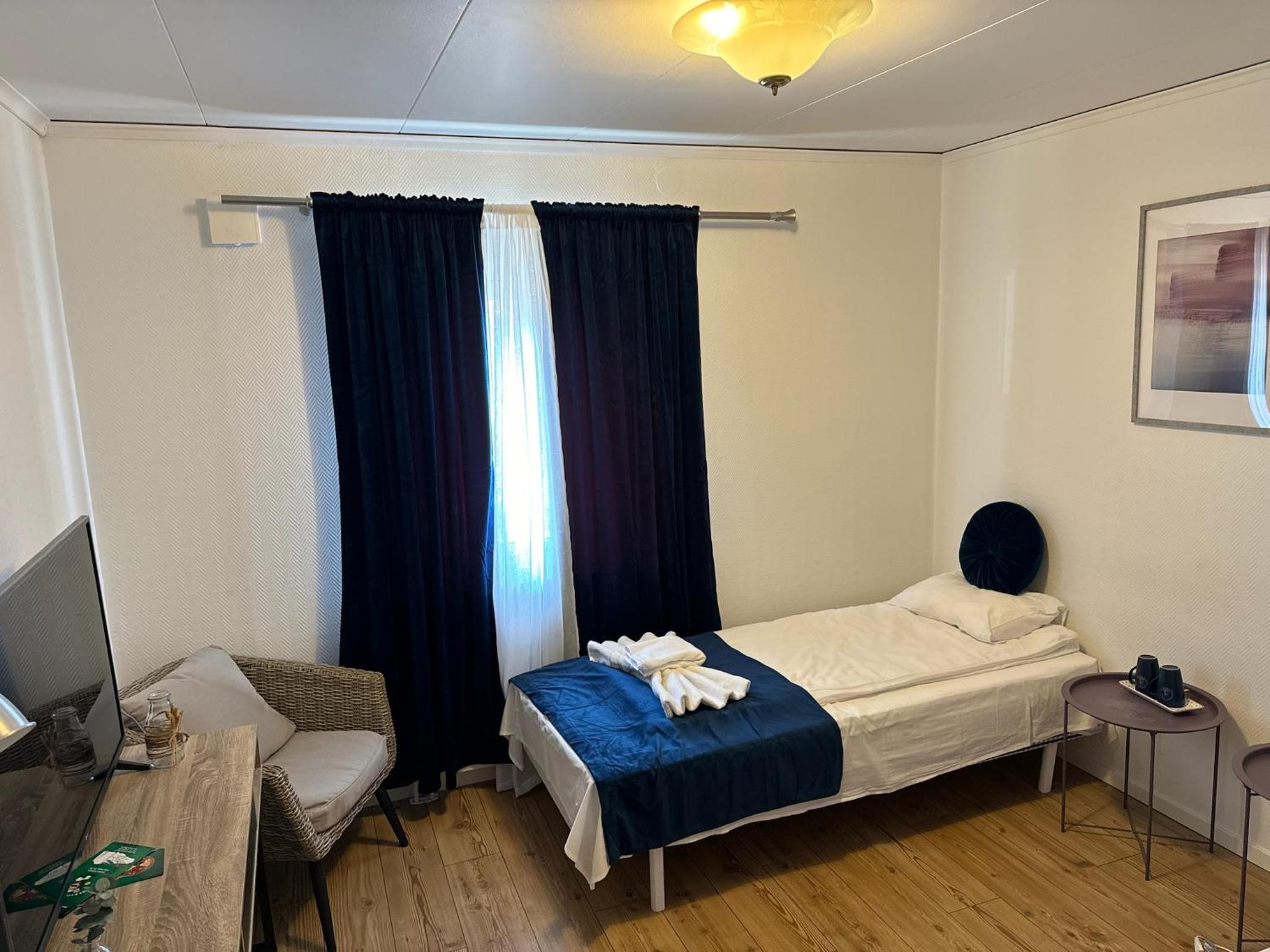 Läget rent och fräscht. Läste mycket negativt om hotellet tycker inte det car så illa. Vänligt personal, skön säng, tyst o lungt. Saknade frukost men det fanns på CirkelK precis intill.