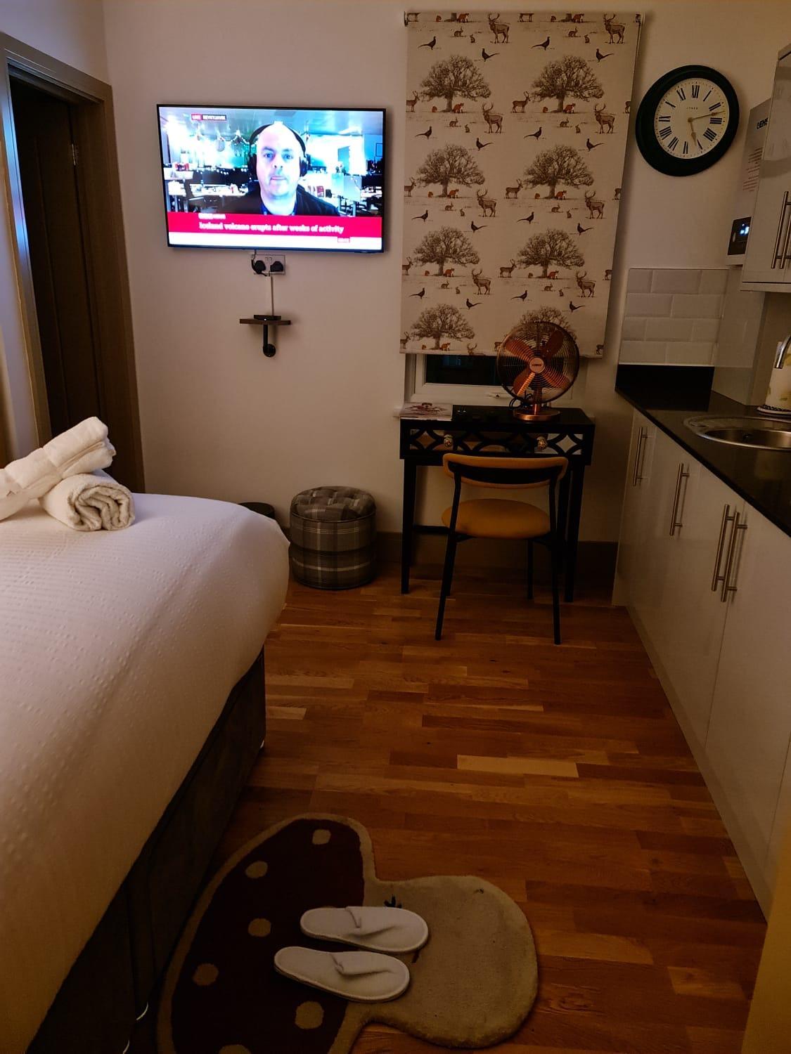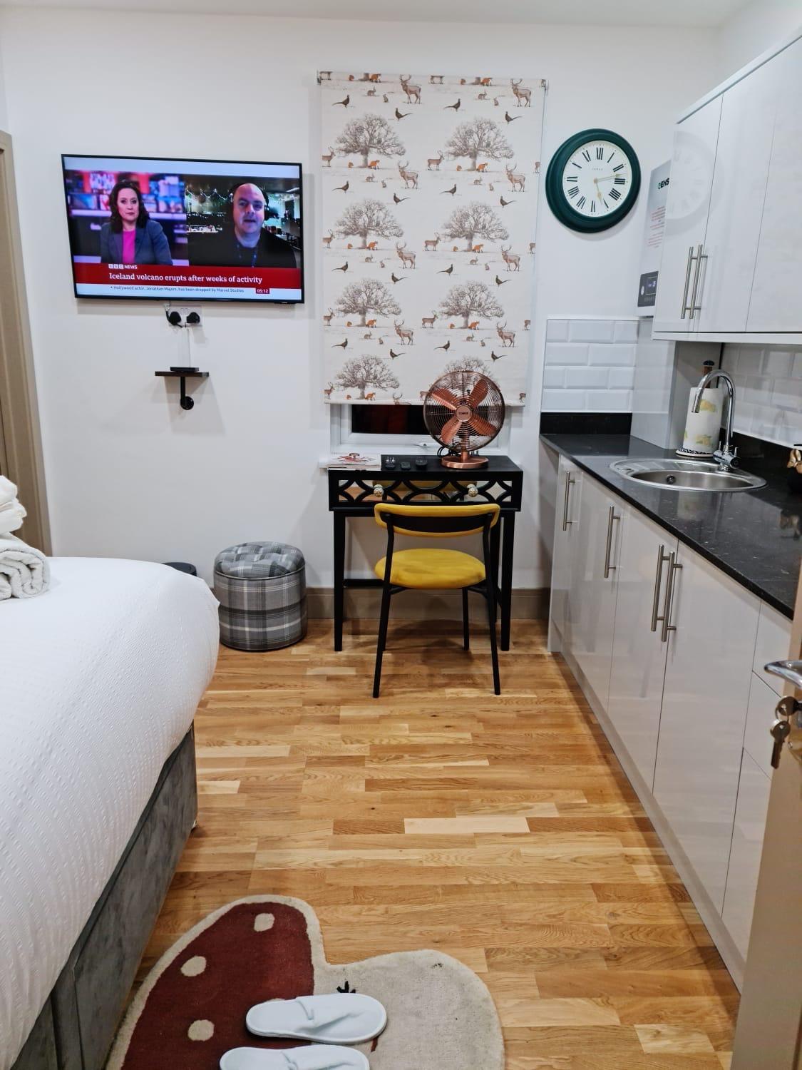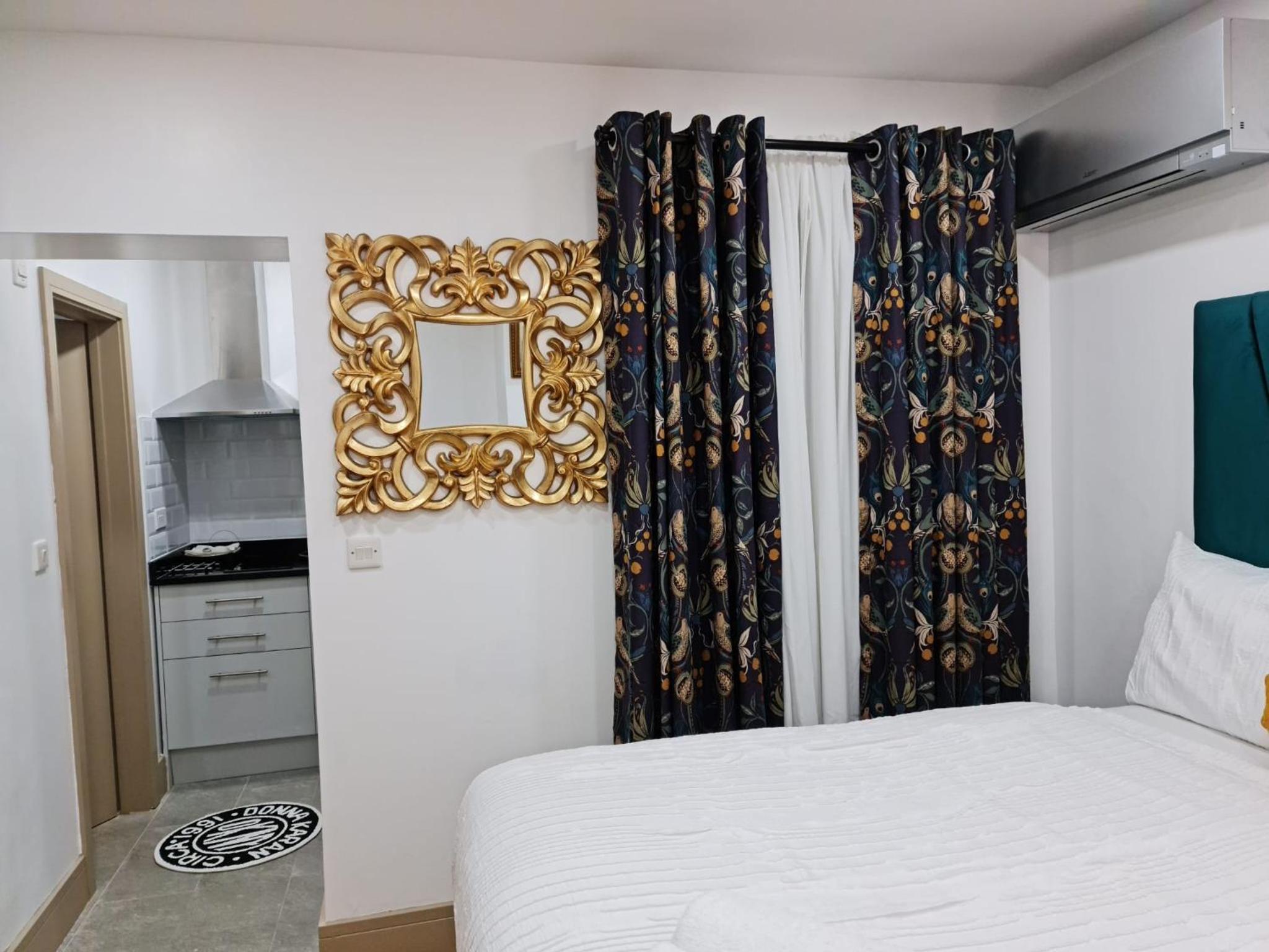 Experience comfort and style in our air-conditioned apartments with modern amenities like satellite TV, fully equipped kitchen, and a private bathroom with walk-in shower and slippers.