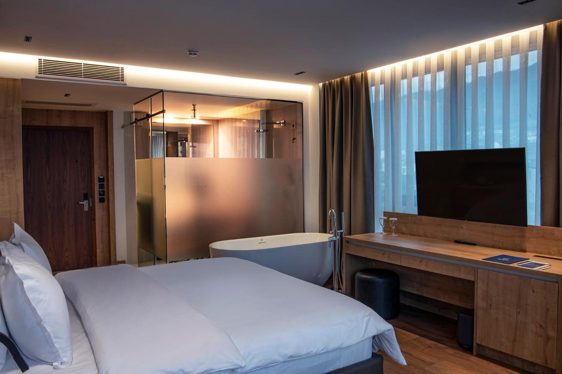 Colazione a buffet molto buona. Personale gentile e professionale. Hotel vicino alle montagne e alla fonte del fiume Istog,spettacolare. Abbiamo sfruttato la spa con due tipi diversi di sauna e una piscina da 20 m.
