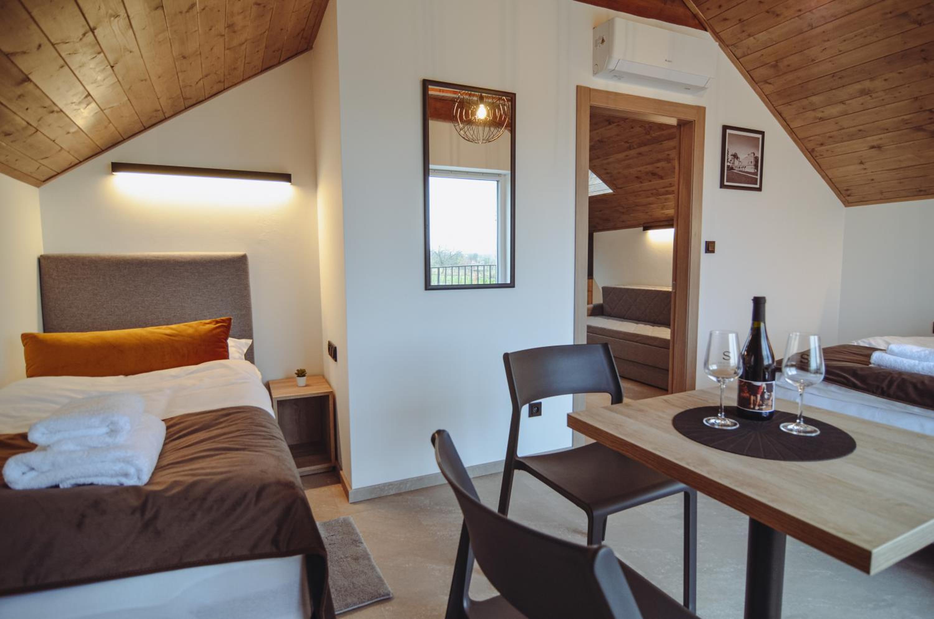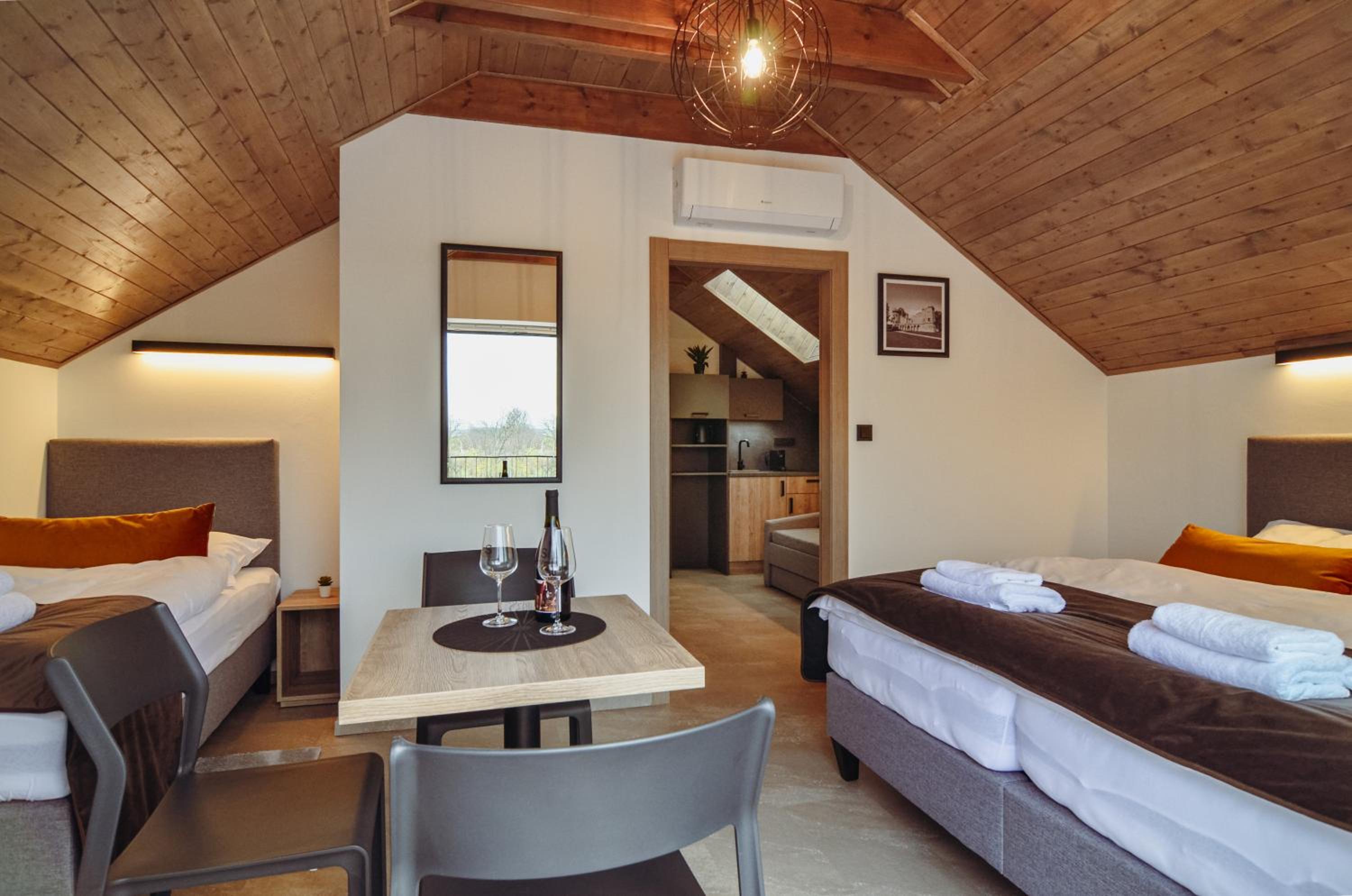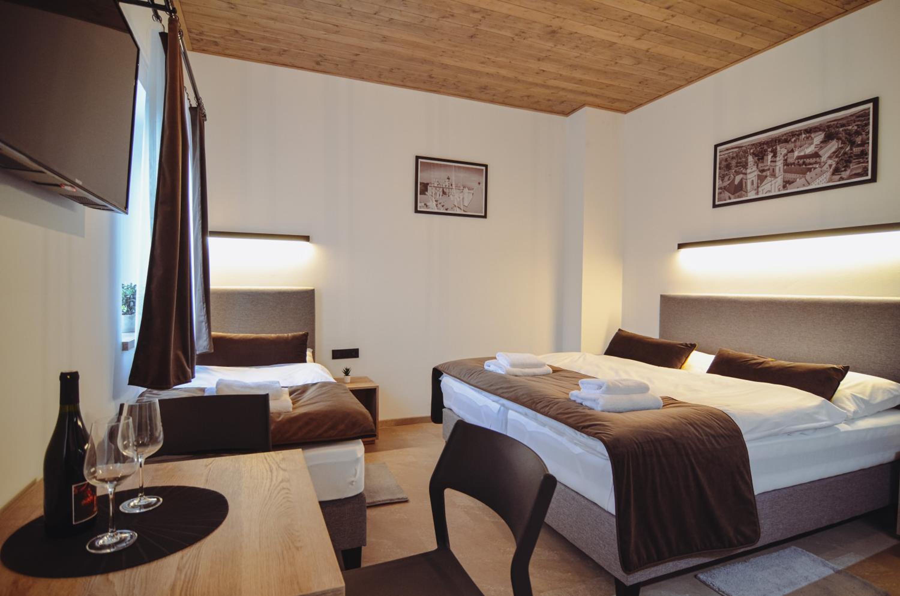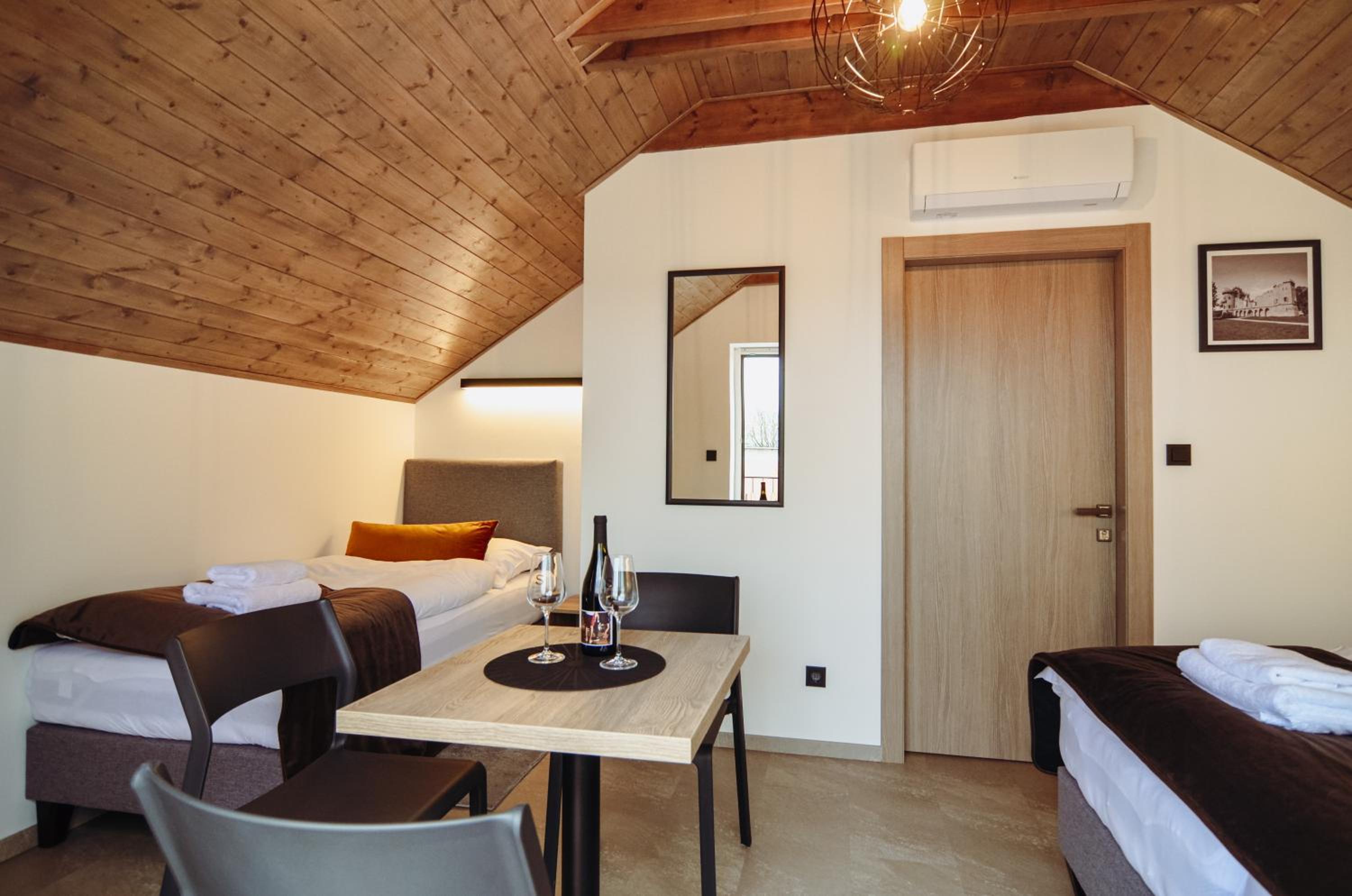Pokoj v podkroví s terasou. 2 místnosti, malá kuchyňka, s koutkem a pohovkou. Vybavený základními potřebami - dostačující na krátkodobý pobyt. Všechno plně funkční, čisté a bez problému. Příjemný výhled na vinice. Cca 15 minu pěšky do centra. Dost parkovacích míst. Možnost zakoupit si nápoje v ubytování (lednička).
