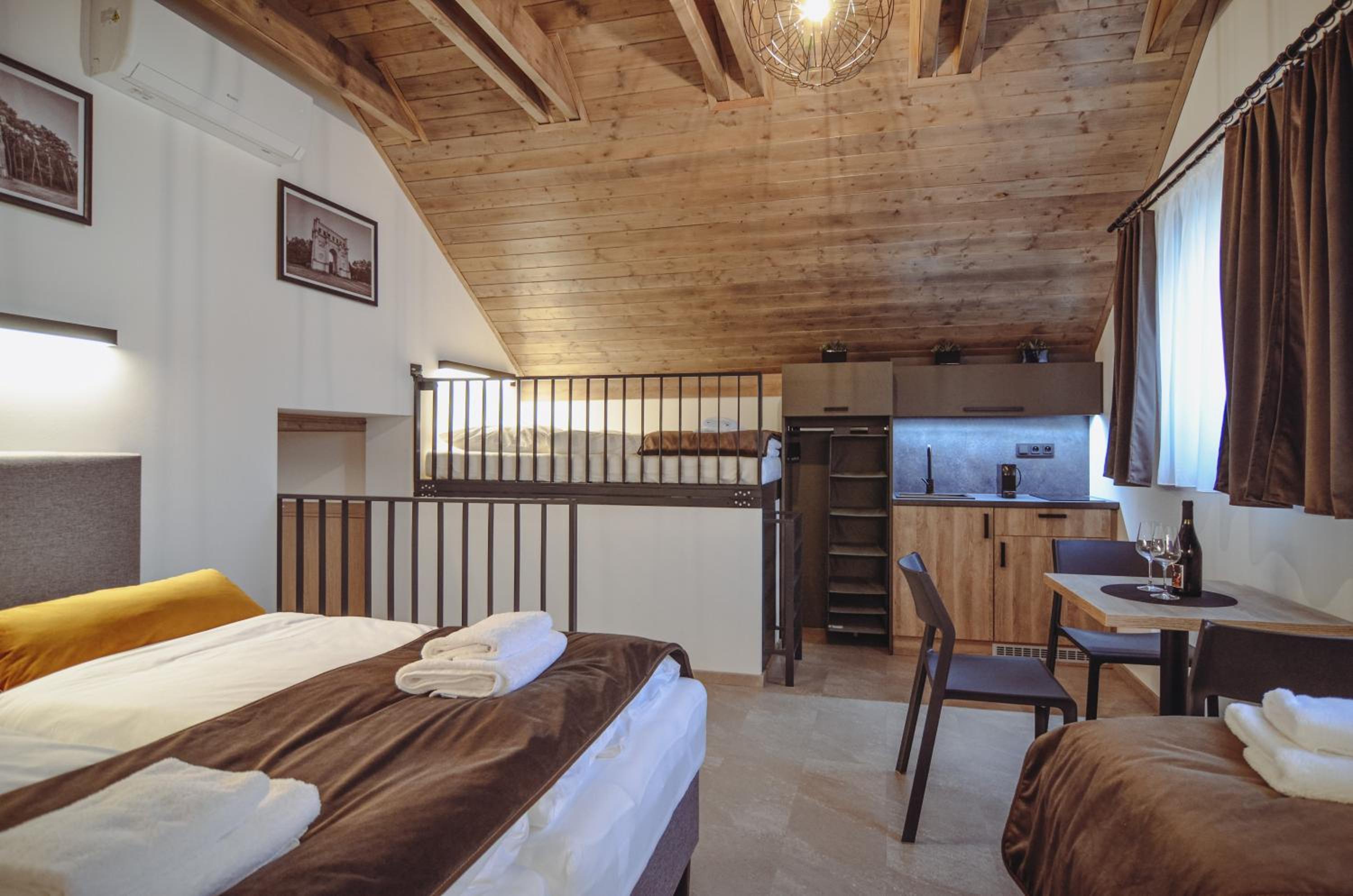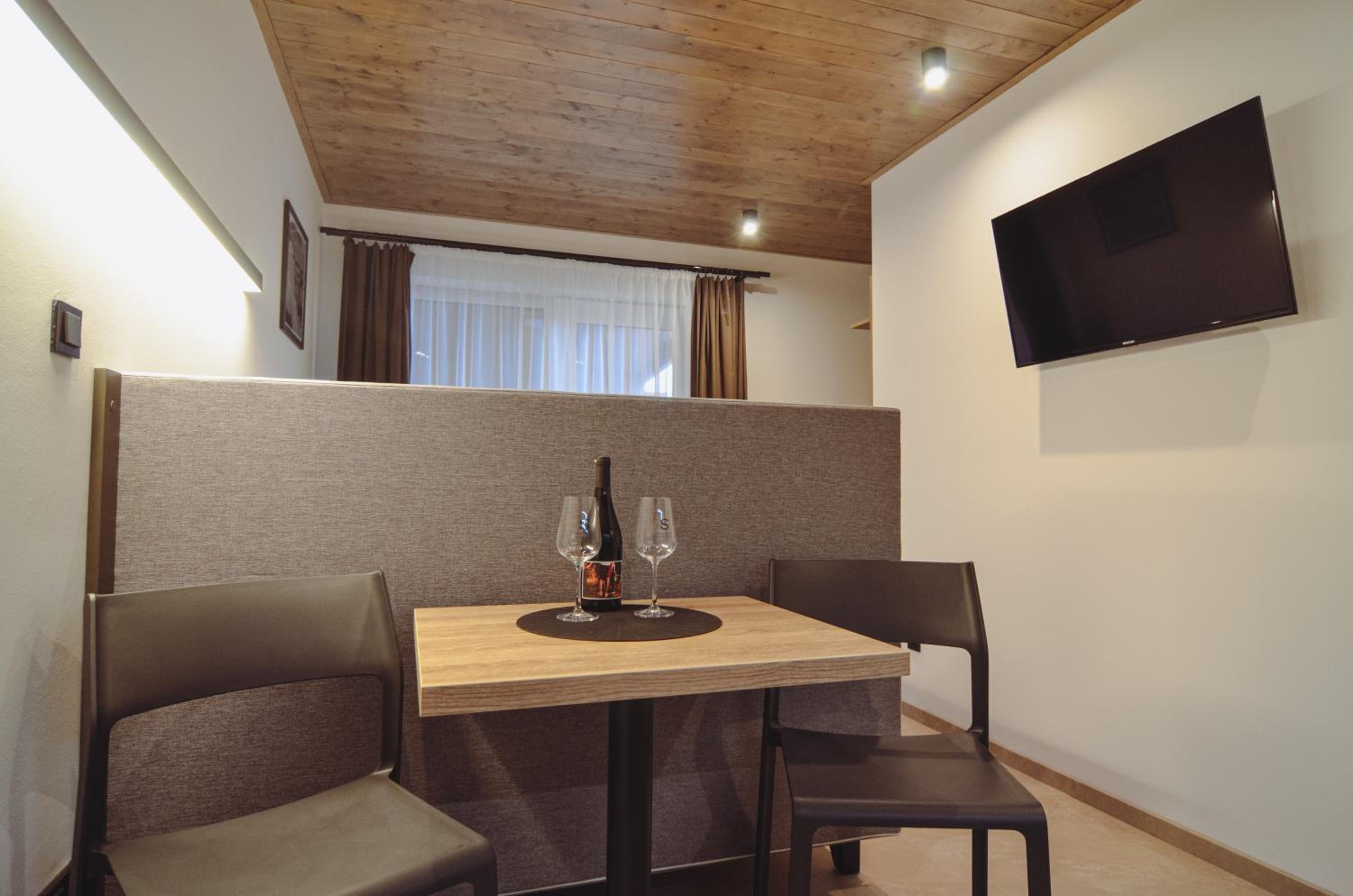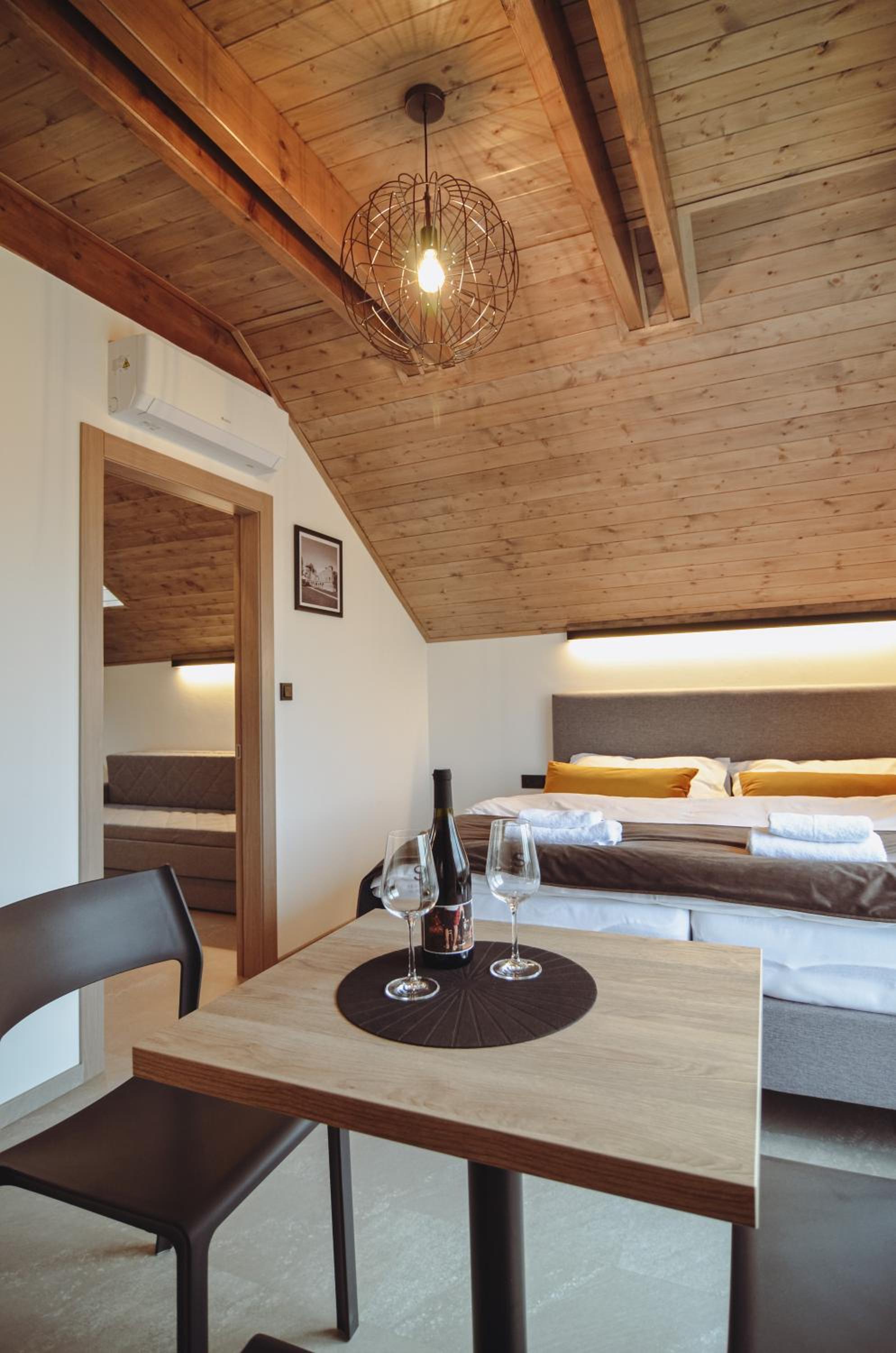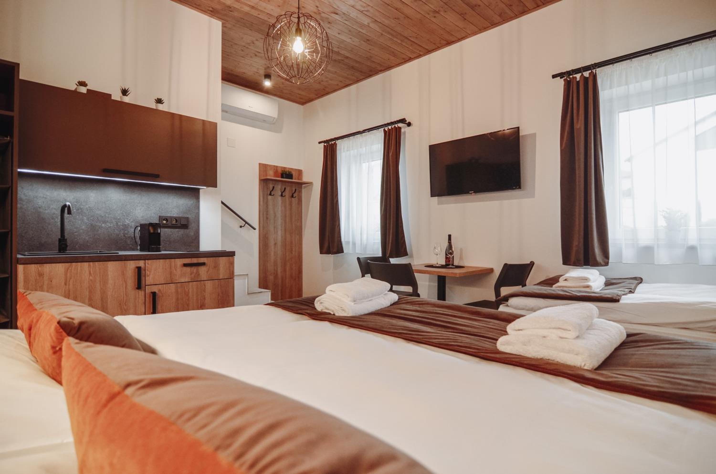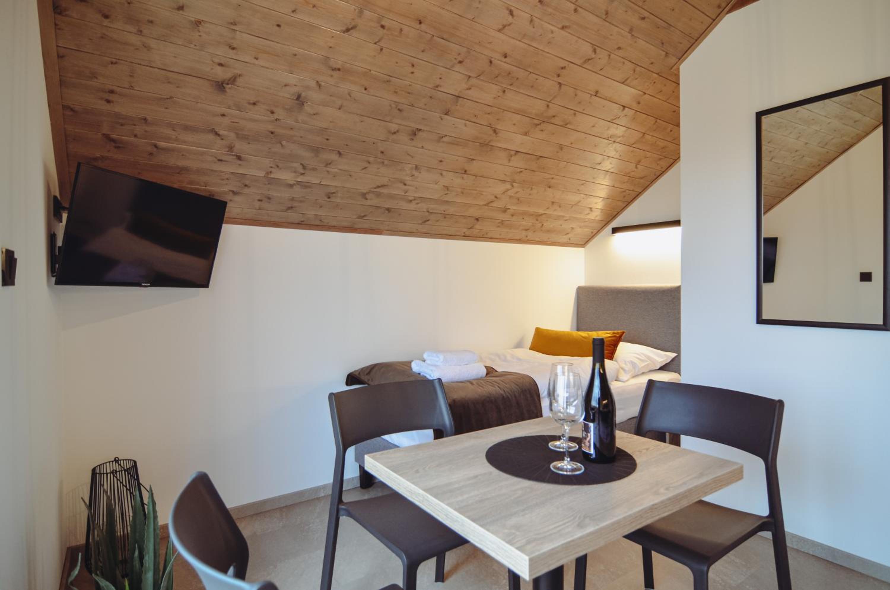 Pokoj v podkroví s terasou. 2 místnosti, malá kuchyňka, s koutkem a pohovkou. Vybavený základními potřebami - dostačující na krátkodobý pobyt. Všechno plně funkční, čisté a bez problému. Příjemný výhled na vinice. Cca 15 minu pěšky do centra. Dost parkovacích míst. Možnost zakoupit si nápoje v ubytování (lednička).