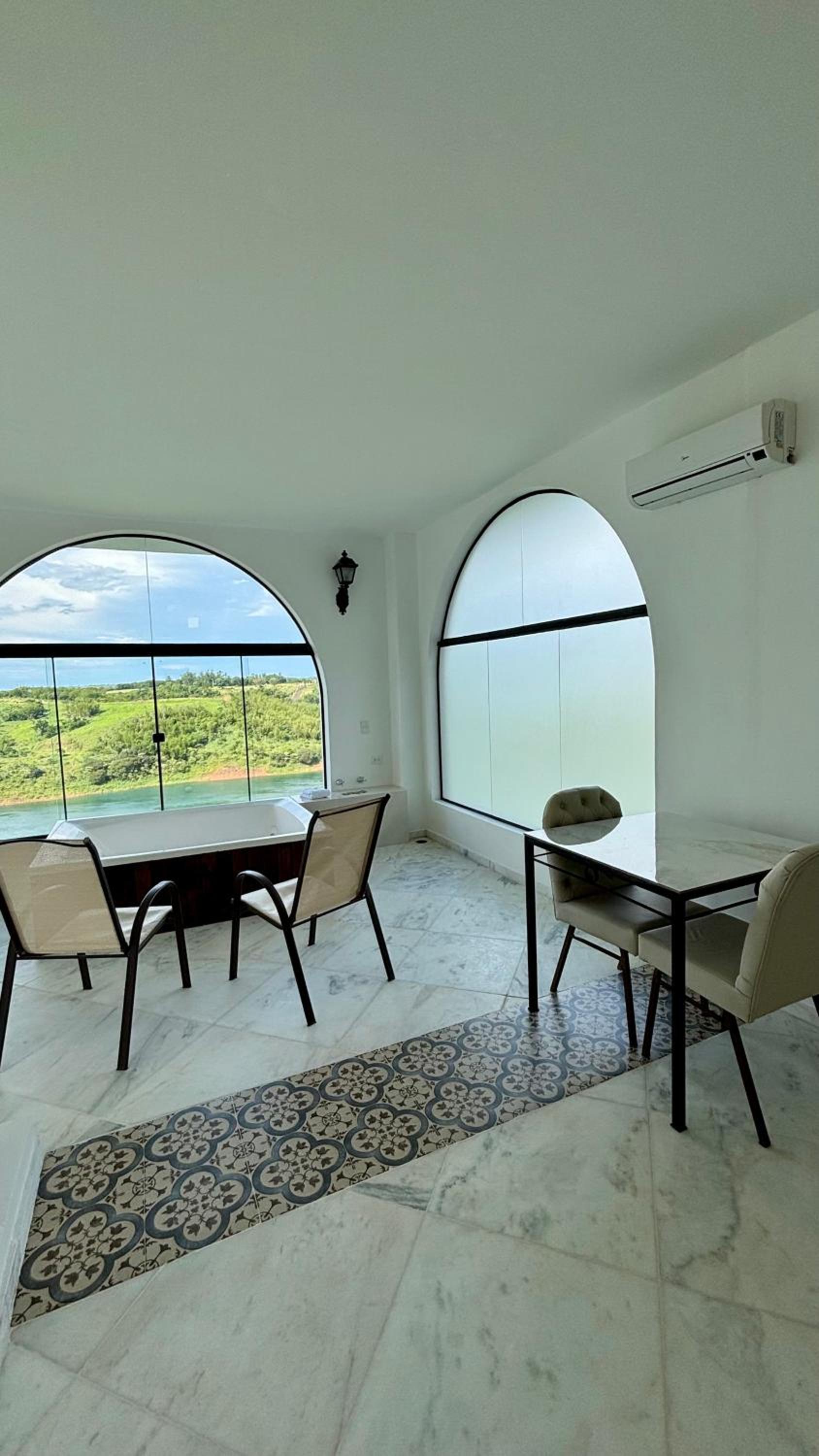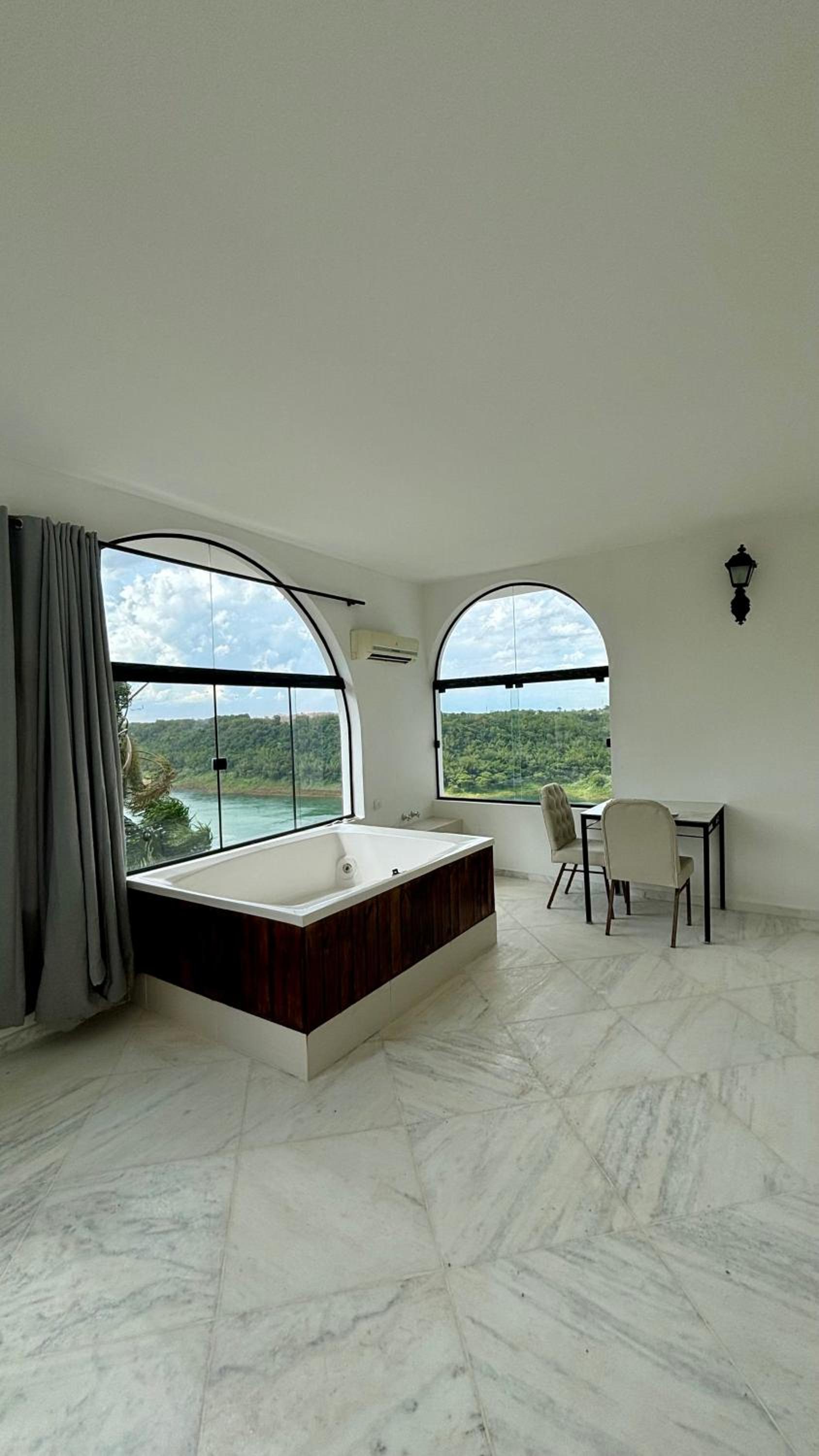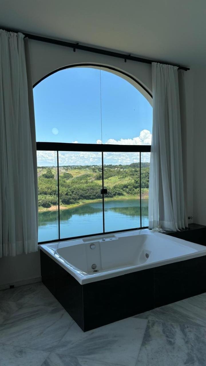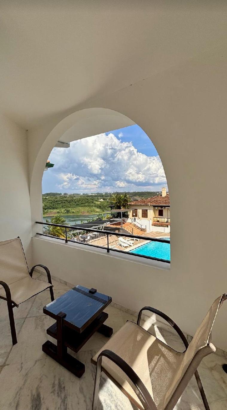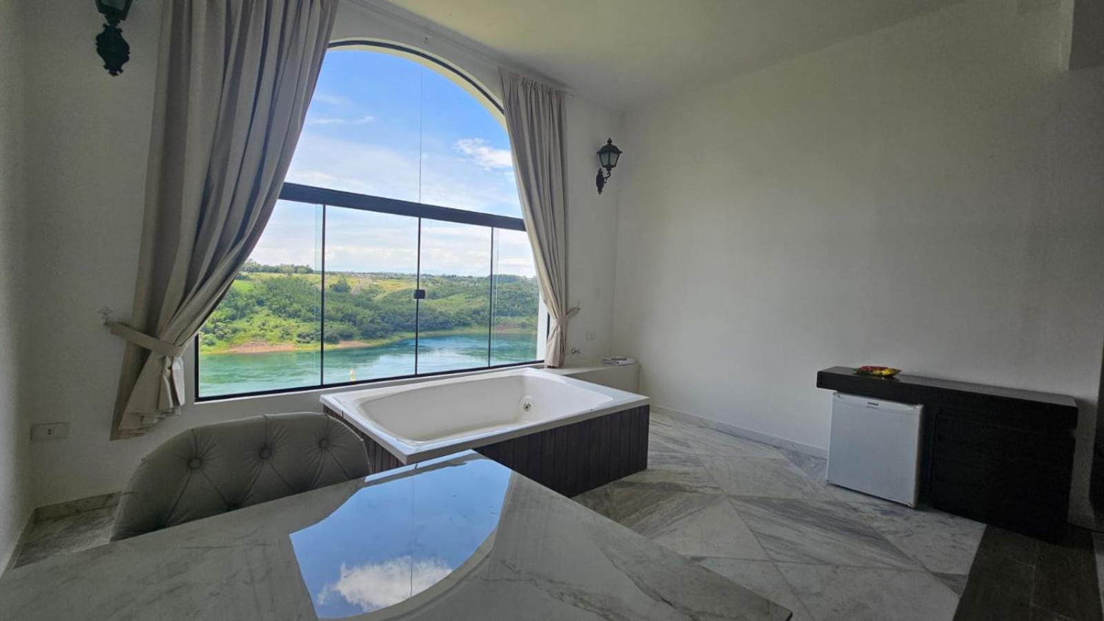 Localizado dentro de um condomínio de luxo, a 20 minutos de carro dos centros de compras de Cidade do Leste, e 15 minutos a pé dos restaurantes do condomínio. Piscina ótima, café da manhã bom, mas repetitivo. Quarto espaçoso e com linda vista para o rio Paraná, cama e banheira muito boas.