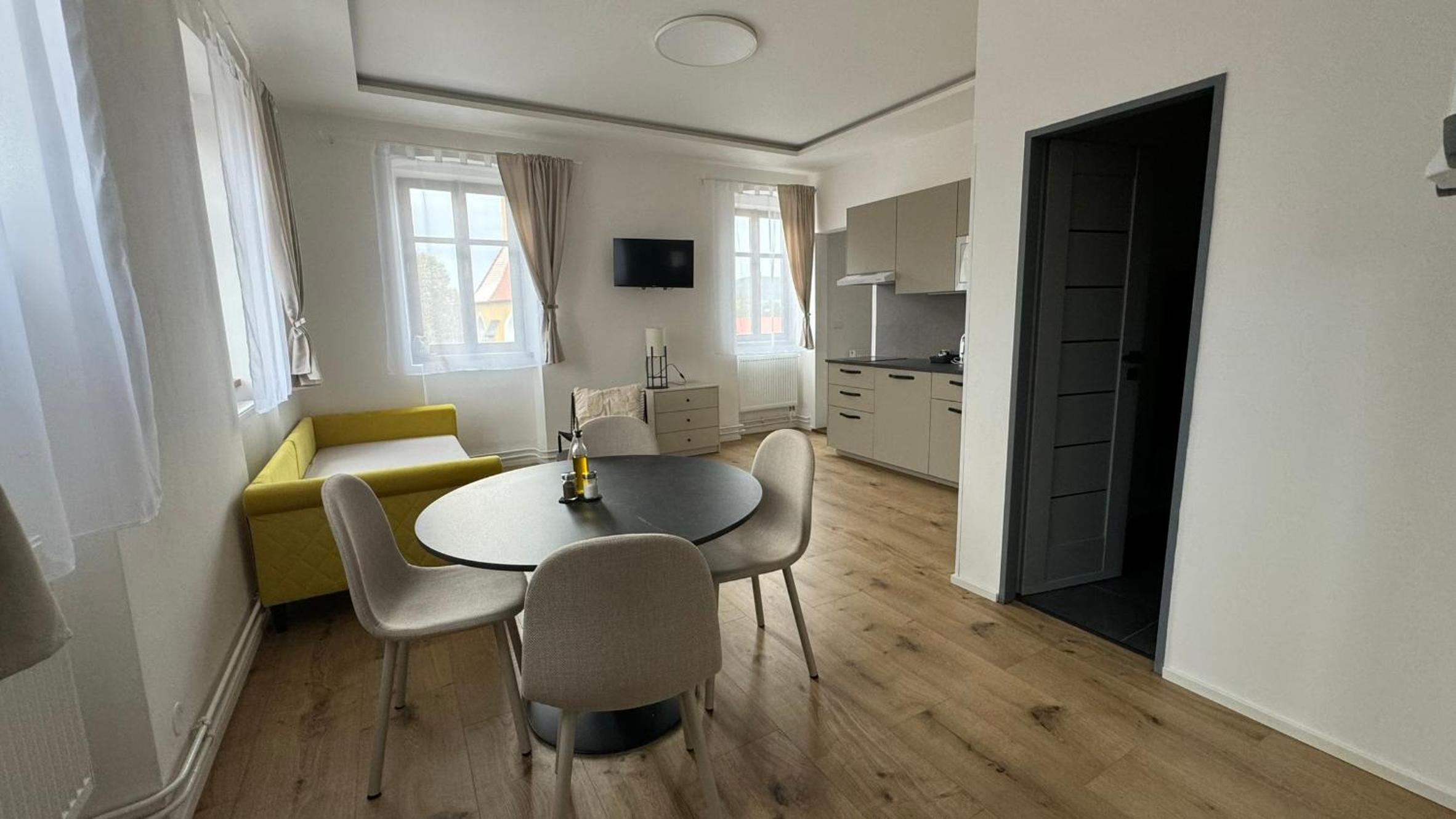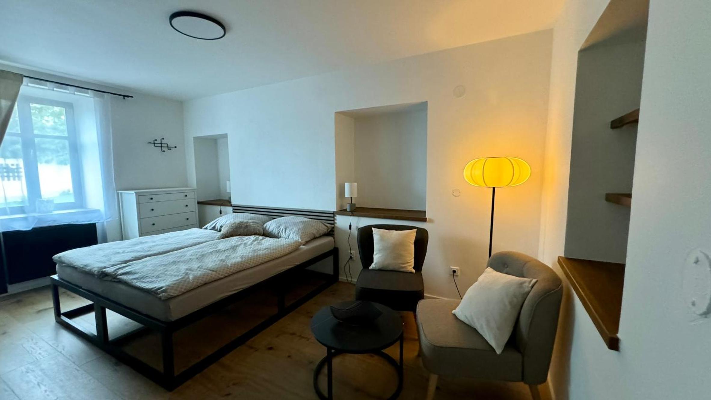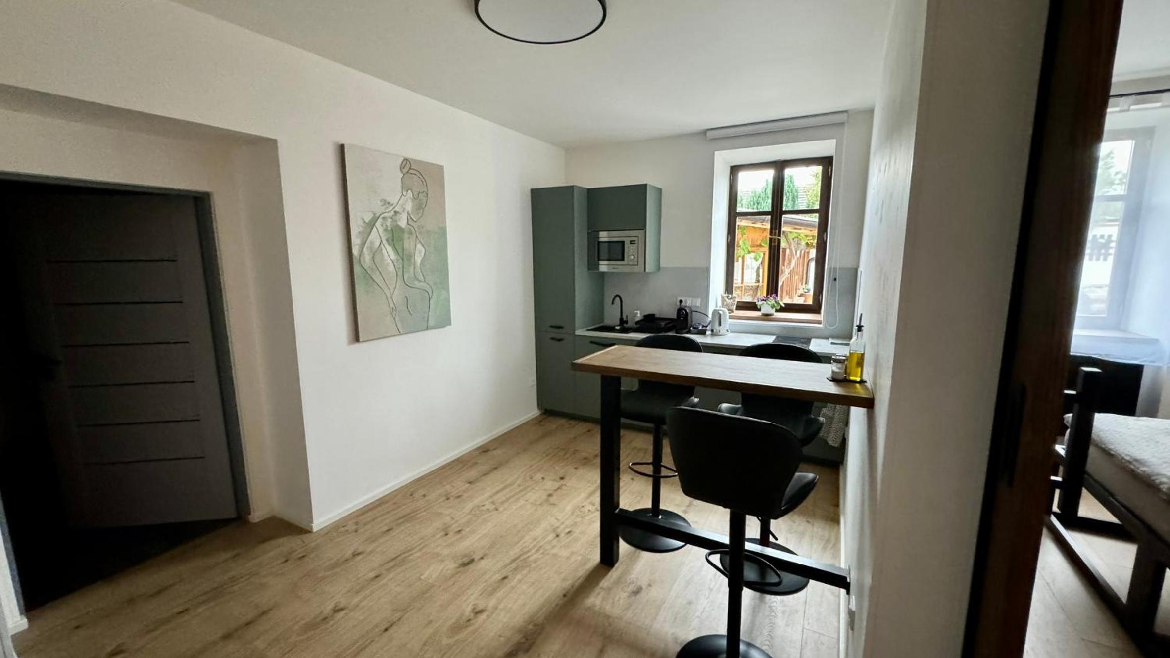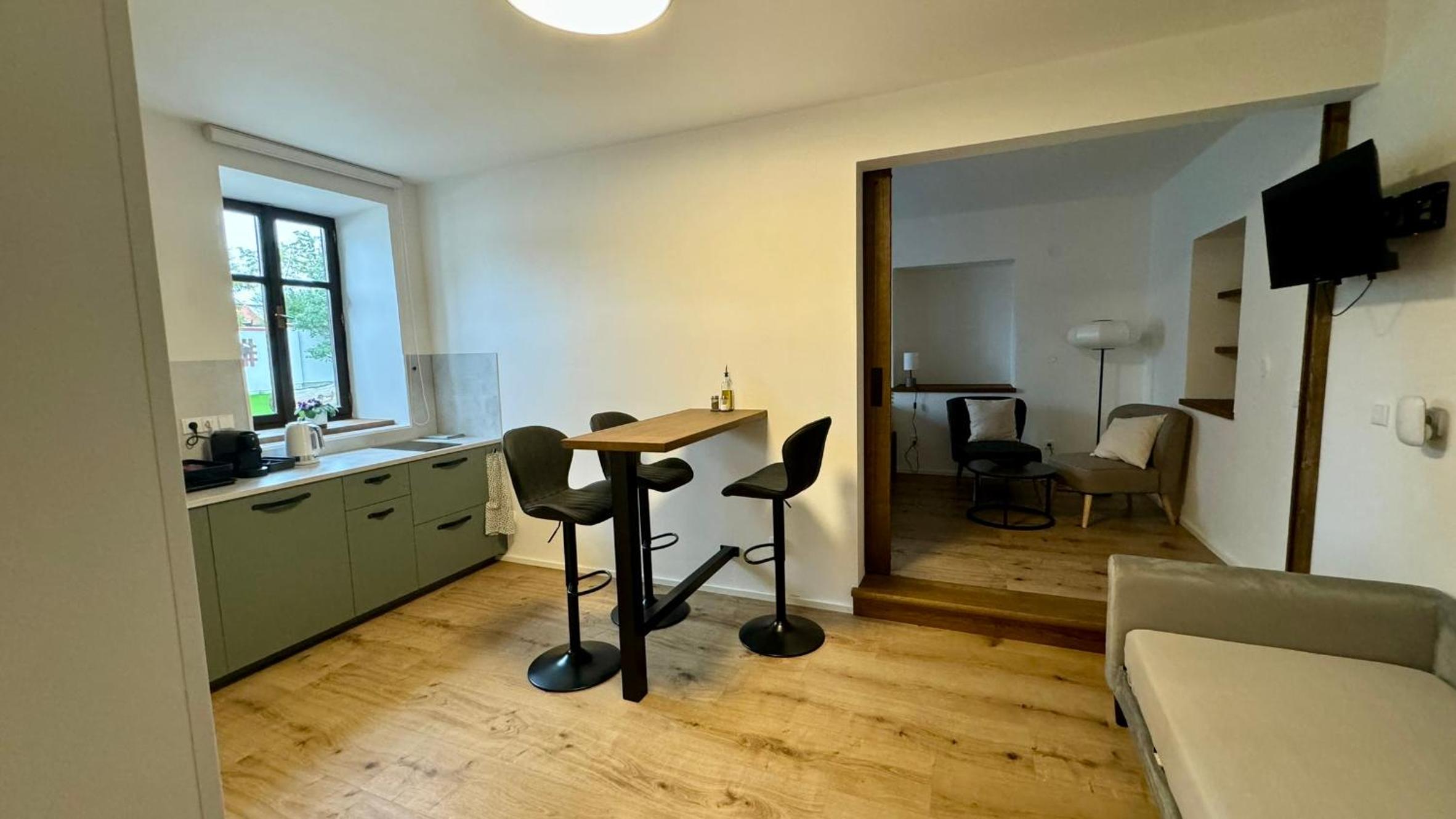 Skvělá lokalita ve velice klidné vesnici, ideální základna pro výlety, jak za kulturou - kousek Český Krumlov nebo České Budějovice, nebo do přírody. Kolem nádherné lesy a louky. Pro milovníky golfu, kousek i golfové hřisťě Český Krumlov, nádherné rybníky. Kousek vodné dílo Římov se zříceninou historického hradu Velešín. My byli na prodloužený víkend s loveckým psem, který si užil nádherné vycházky. Apartmán dobře vybavený, moderní, ale s respektem k původní architektuře. Pani na recepci velice milá.