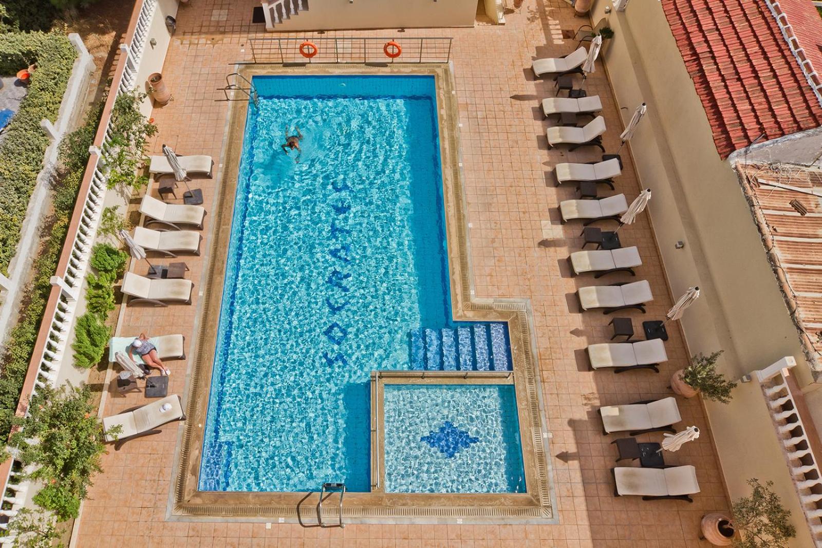 Socrates Studios & Apartments offers a relaxing experience with a swimming pool and two bars where guests can unwind and socialize.