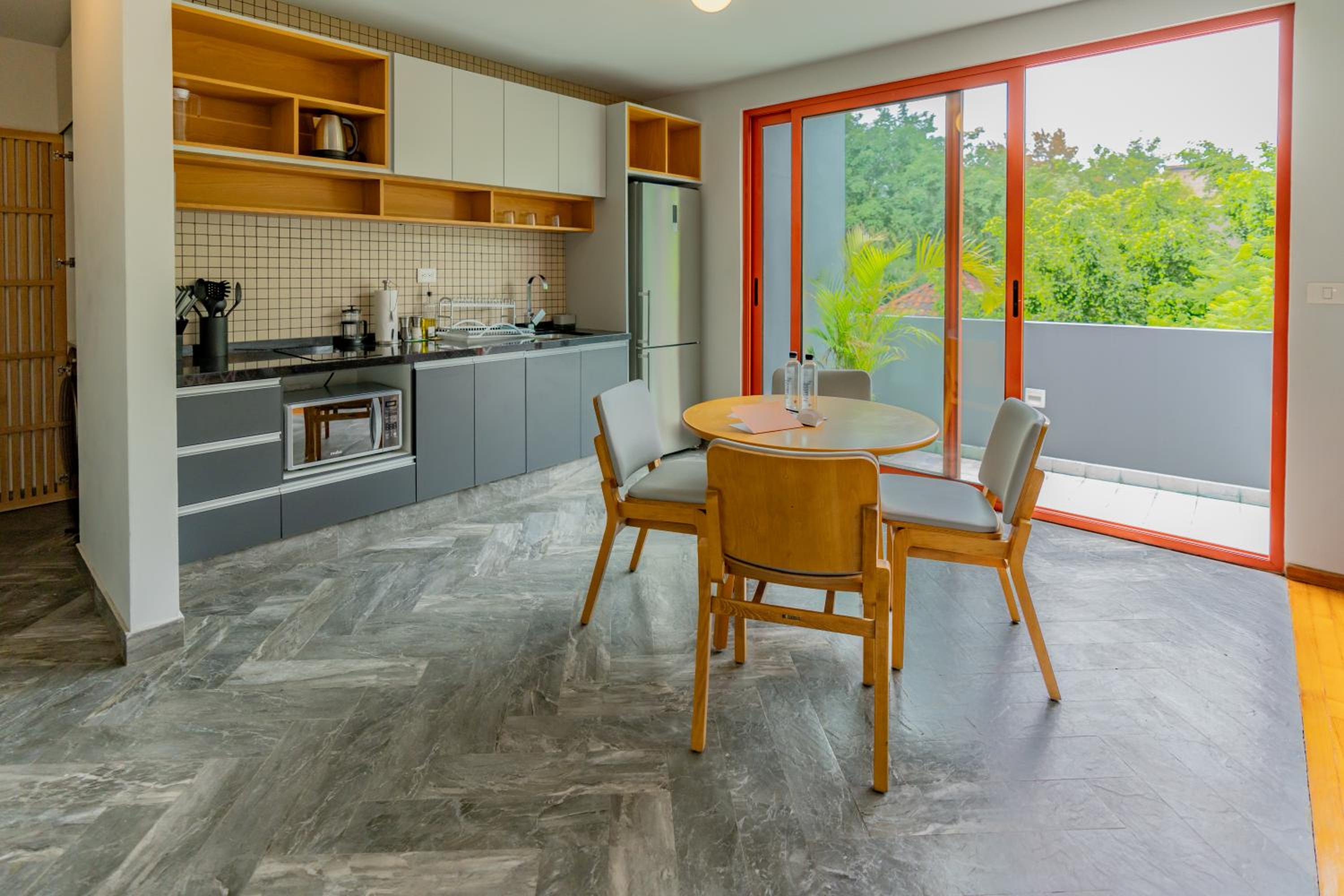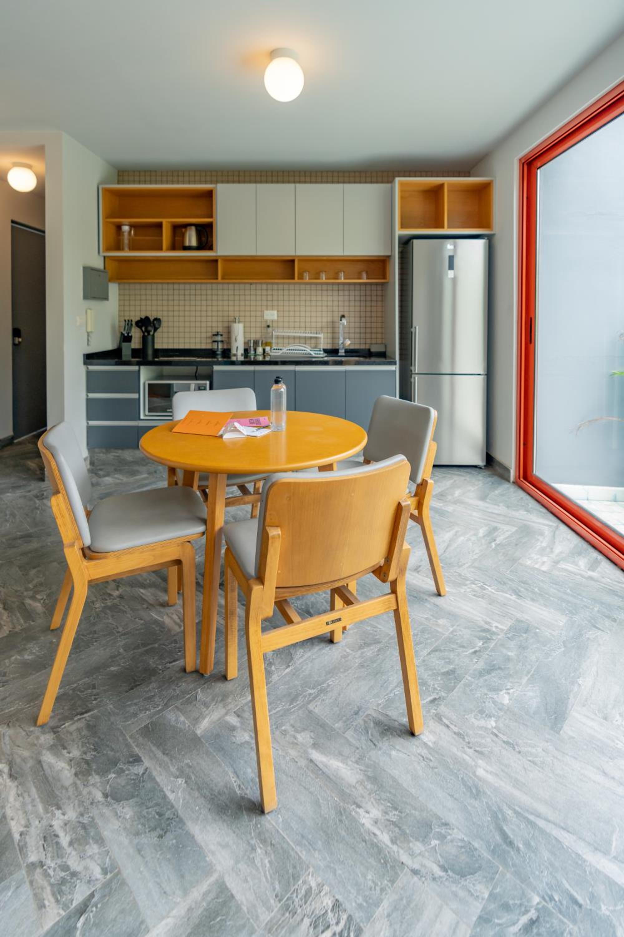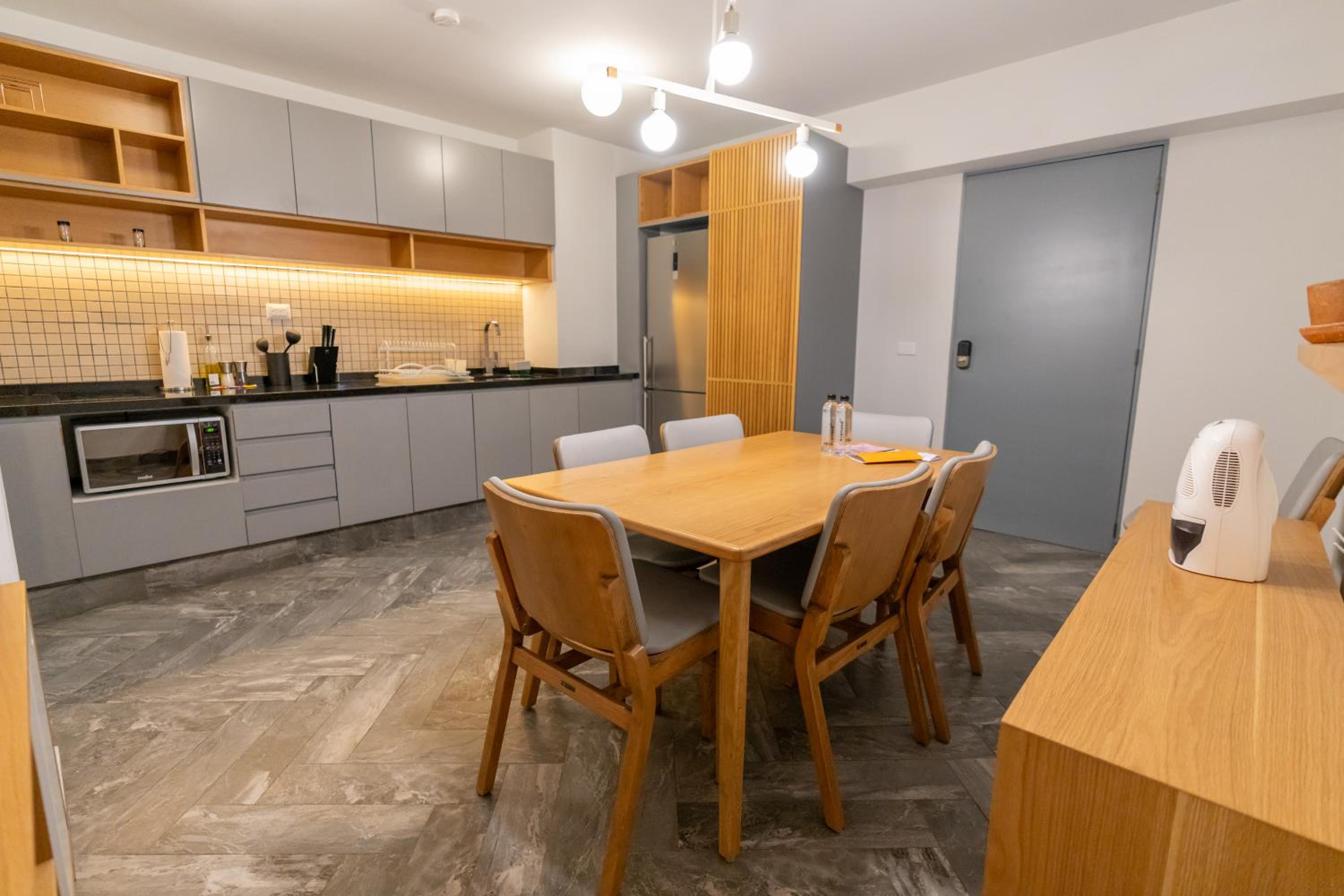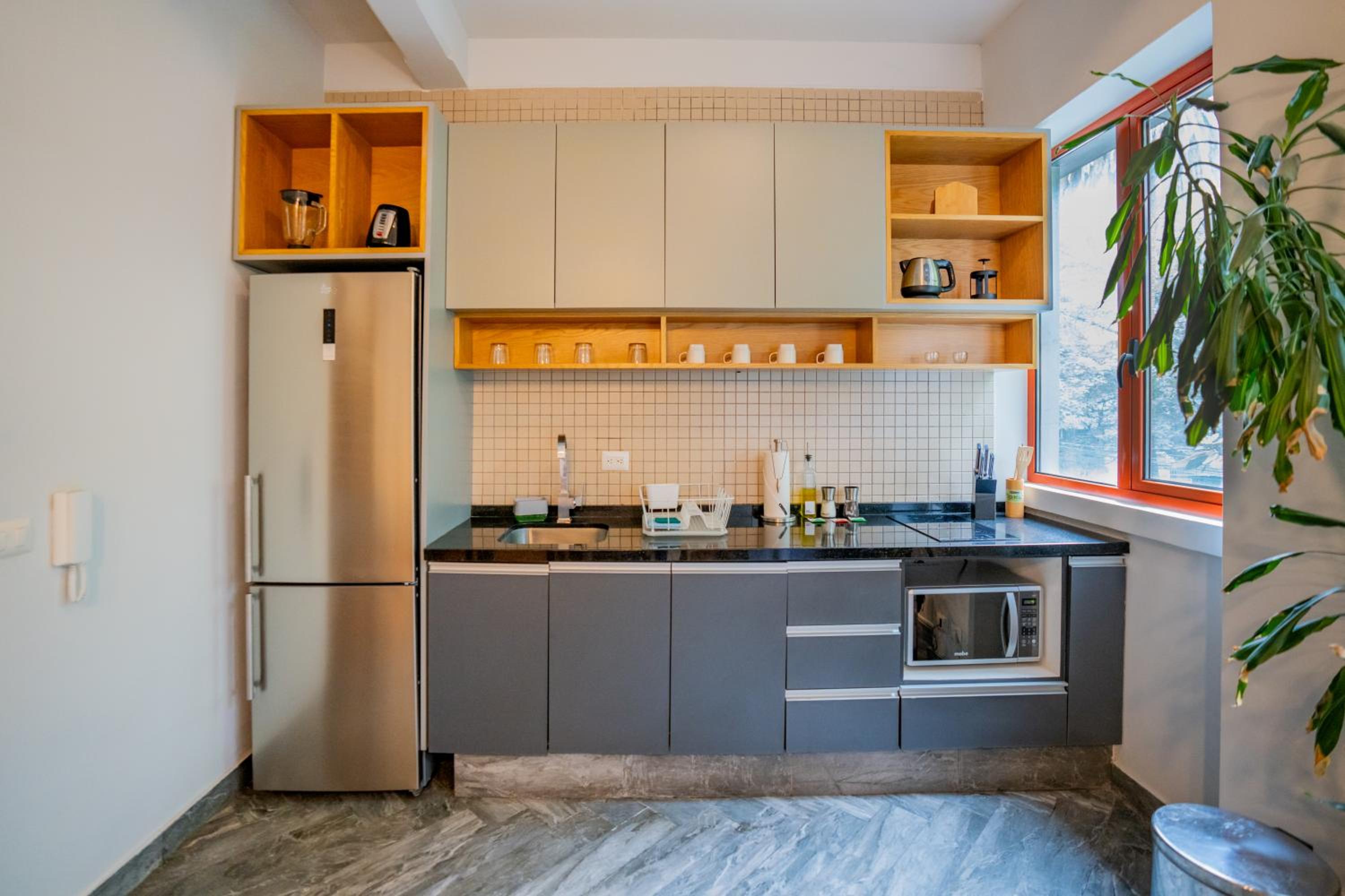 The actual layout of unit 12 (a deluxe 1 br) was nice. We liked being on the top floor with a view of trees. We didn't mind climbing the stairs to get to the 4th floor. We didn't hear noise from other apartments and only an occasional motorcycle from the street below. The location in Condesa was fabulous. We really enjoyed being able to walk to so many restaurants. Two of our favorites were Pasta Comedia and Take a Deep Bread Experimental Bakery. The breakfast in the building is on the first floor, so you have to walk down to get your coffee. We didn't mind the exercise but having come from sea level, we often were a bit out of breath by the time we got to our floor (CDMX is over 7K feet above sea level.) The staff (door man and front desk) were very friendly. Housekeeping came every day except Sunday to empty trash and make the bed. They changed the towels once towards the end. Not sure if they changed the sheets. (We don't require new towels or sheets for a 6 night stay -- it saves water, etc.) The kitchen had basic equipment...we only made breakfast (avocado toast with eggs - bought our breakfast food at Walmart, about a 10-14 min walk away). There is a Nespresso machine but no pods. Downstairs, on the 1st floor, they have a newer Nespresso machine with pods along with yogurt, cereal/museli, toast, boxed cookies, milk and juice.
