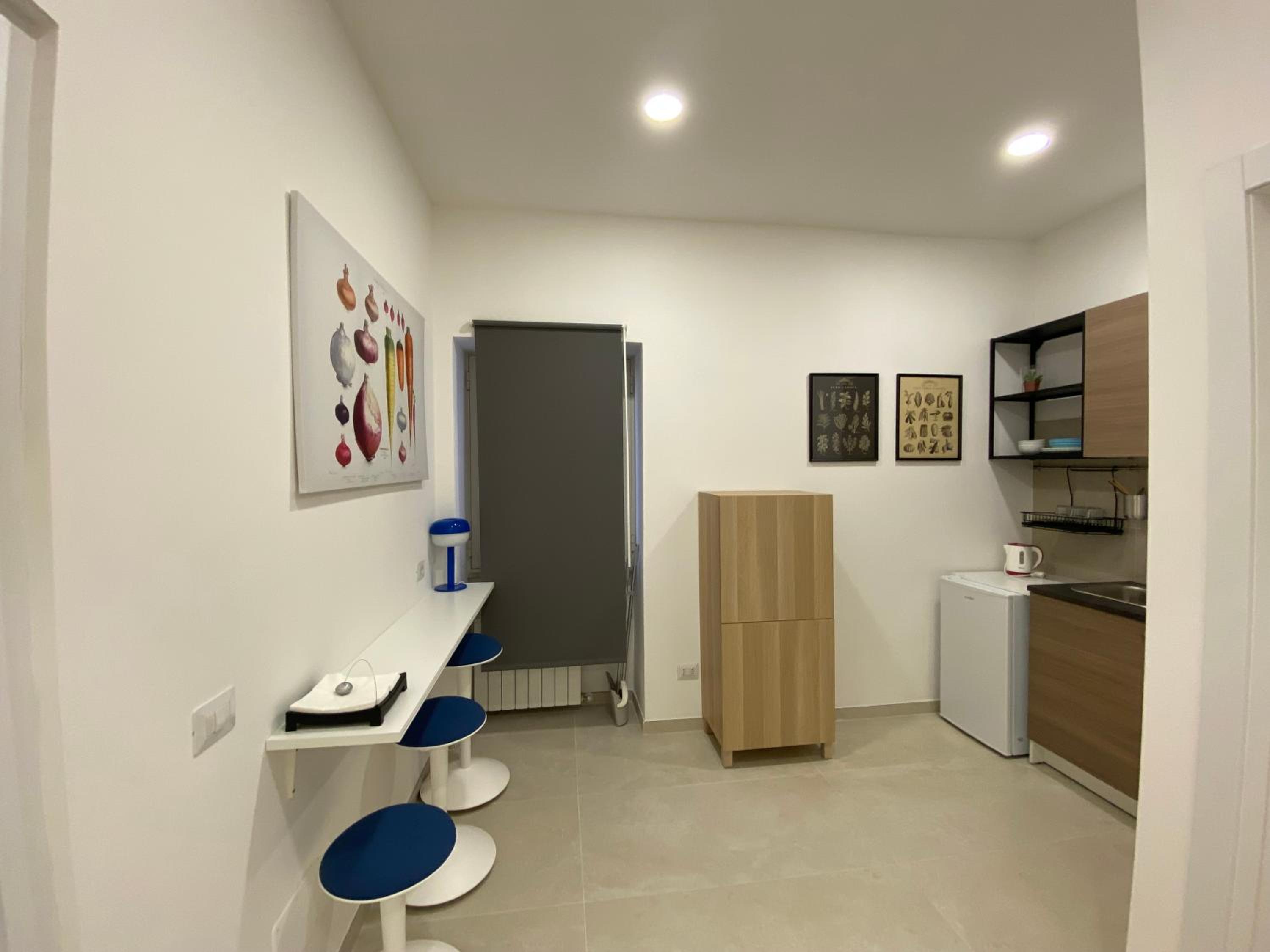 Inside the apartment, there are several rooms (I think three) with a common small kitchen and area. It is extremely well equipped and snacks and packaged pastries are provided, as well as books, games and even power adaptors, which I thought was super thoughful! Thanks!.