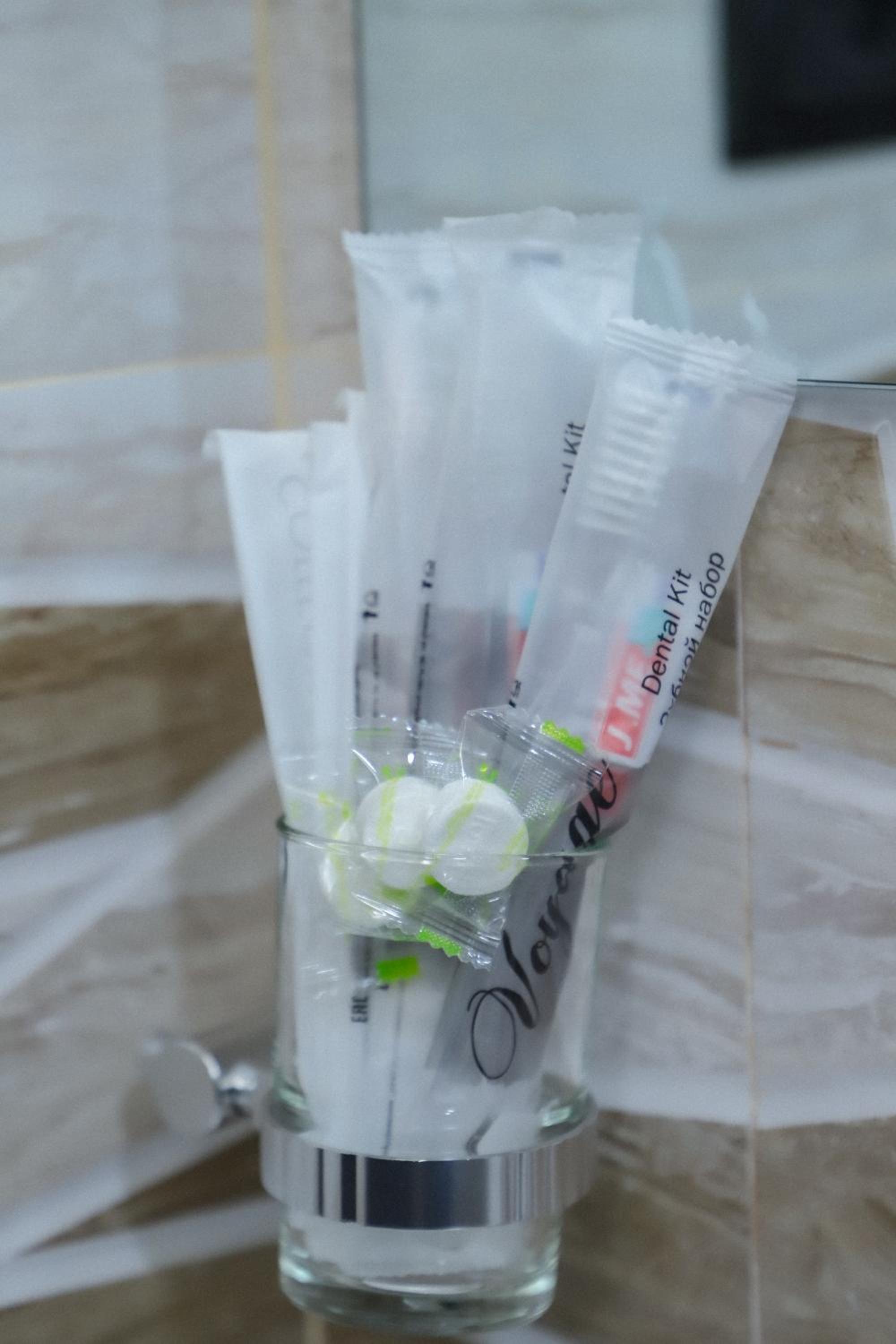 Есть зубной набор, фен, халаты, тапочки, хорошие полотенца, чайник, растворимый кофе 3 в 1, чай.