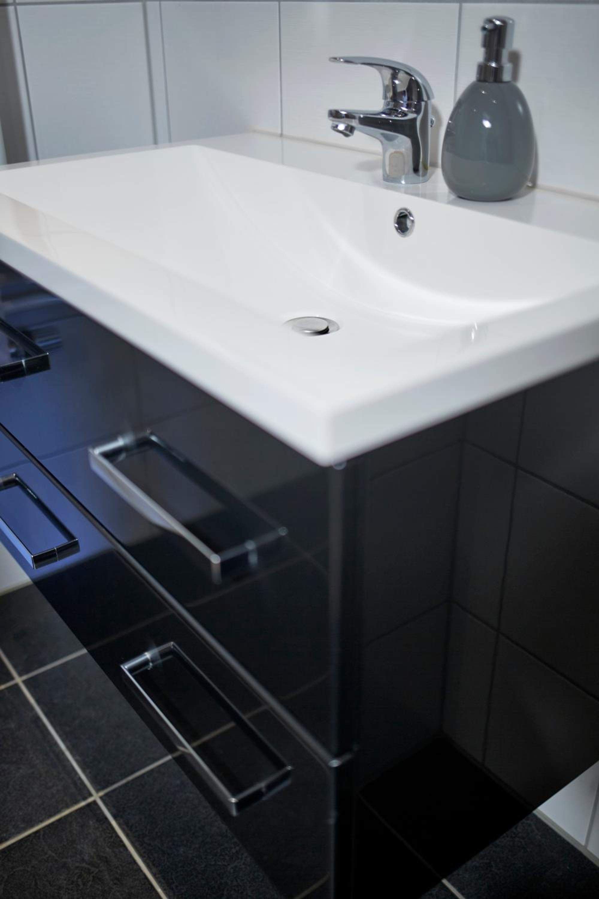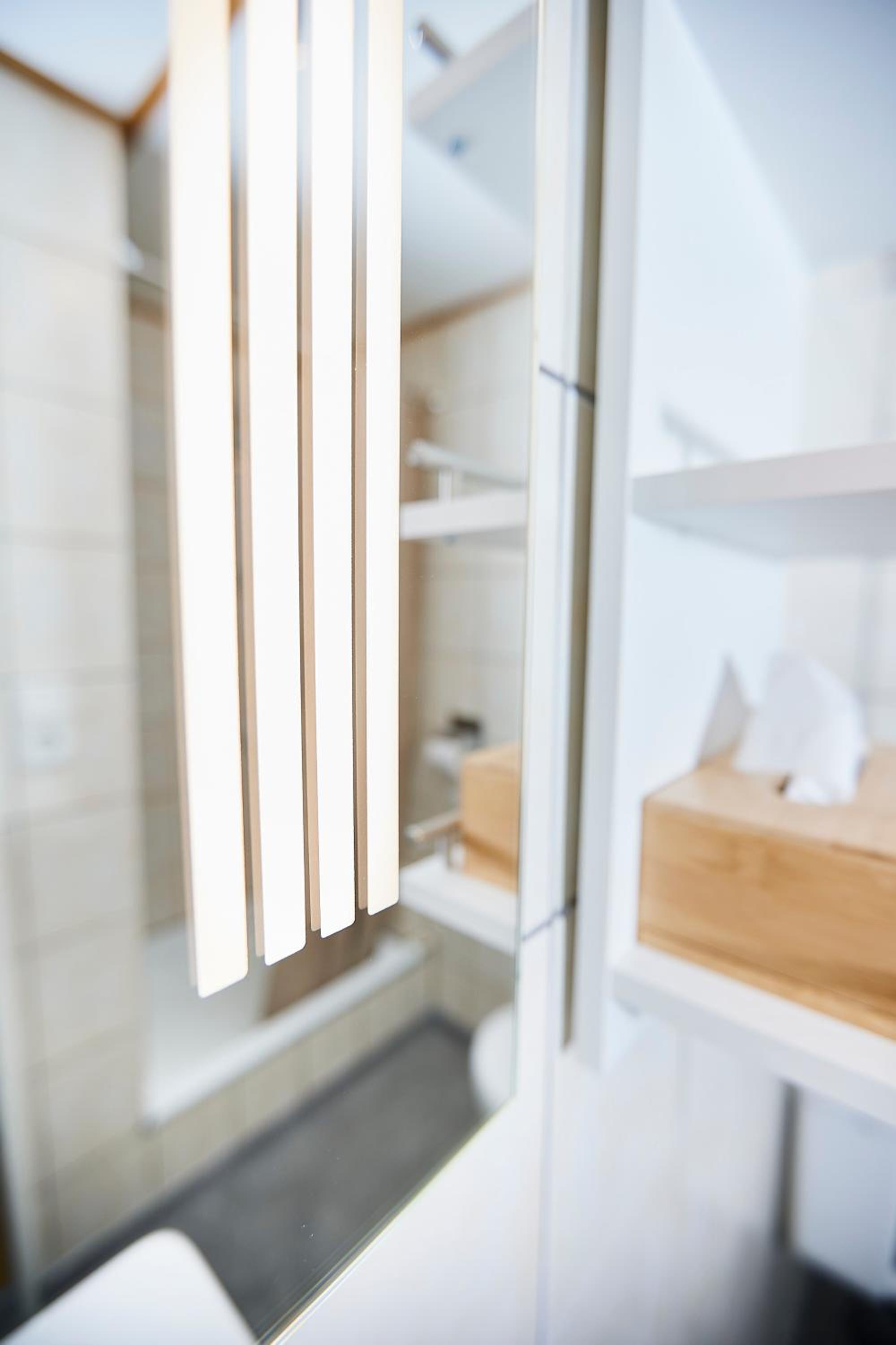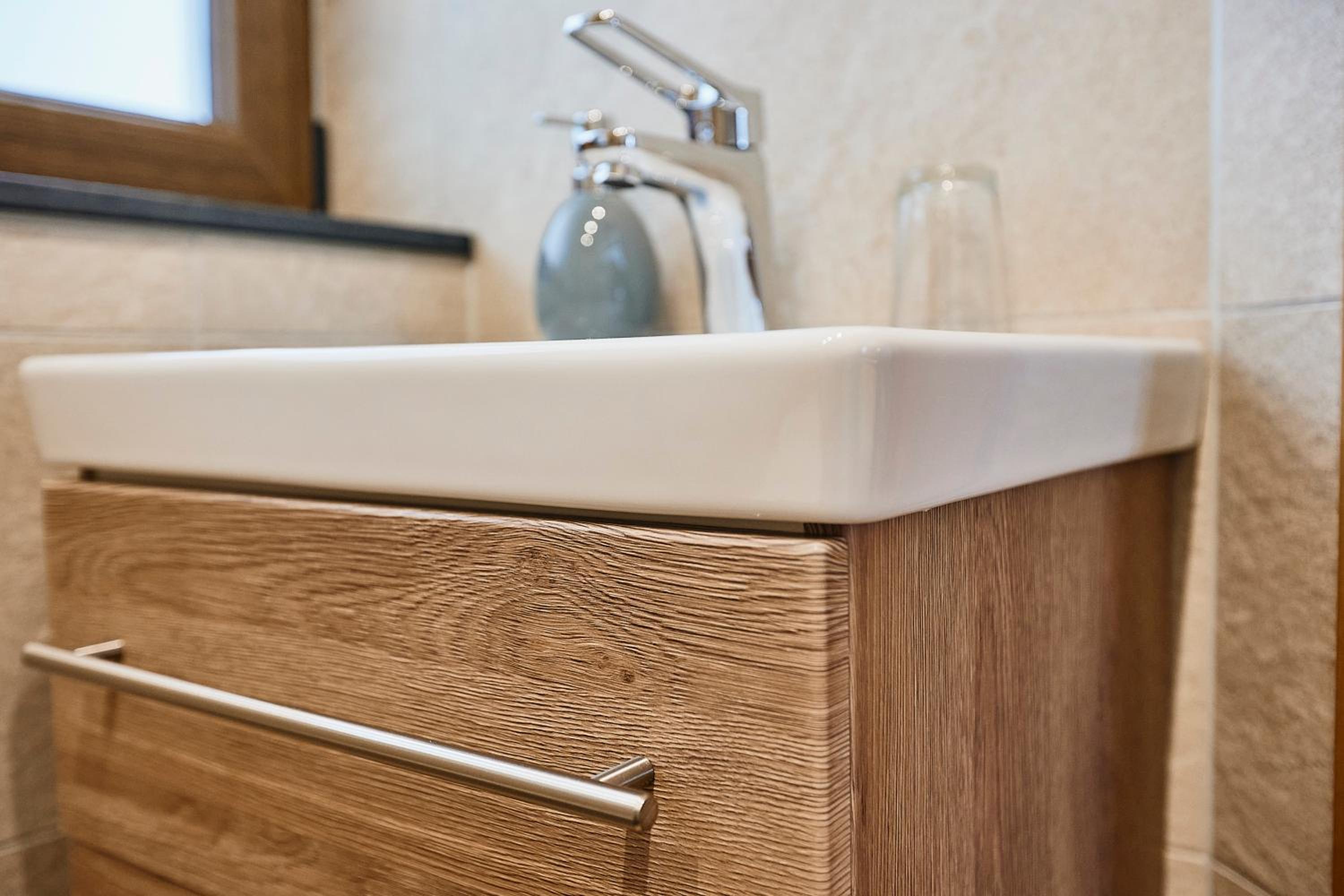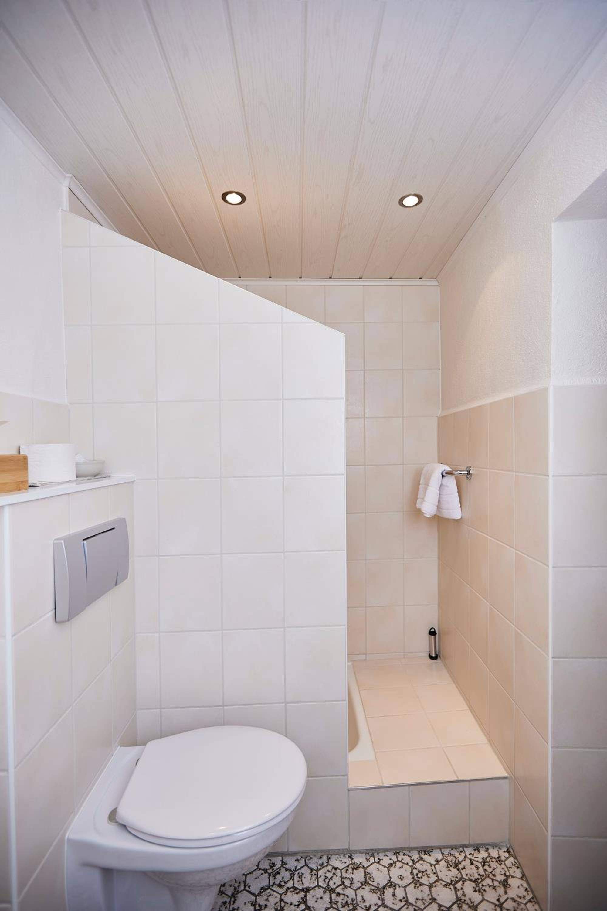 A casa de banho do nosso quarto era bem apertada! As tábuas rangem ao andar no quarto.