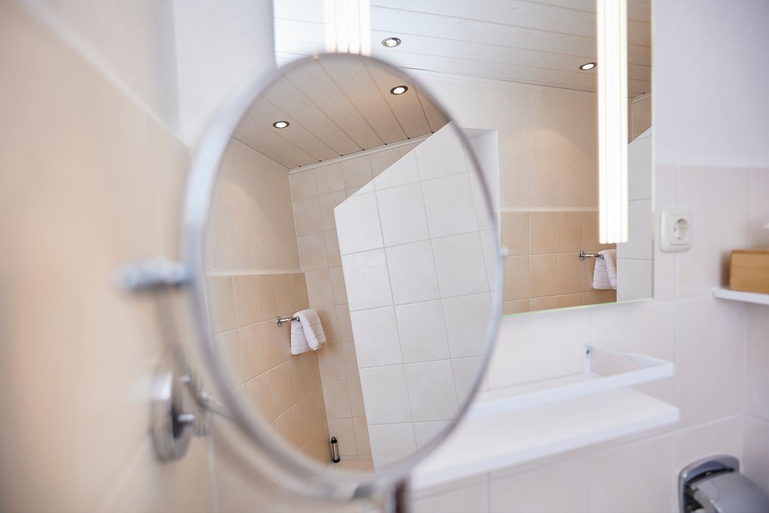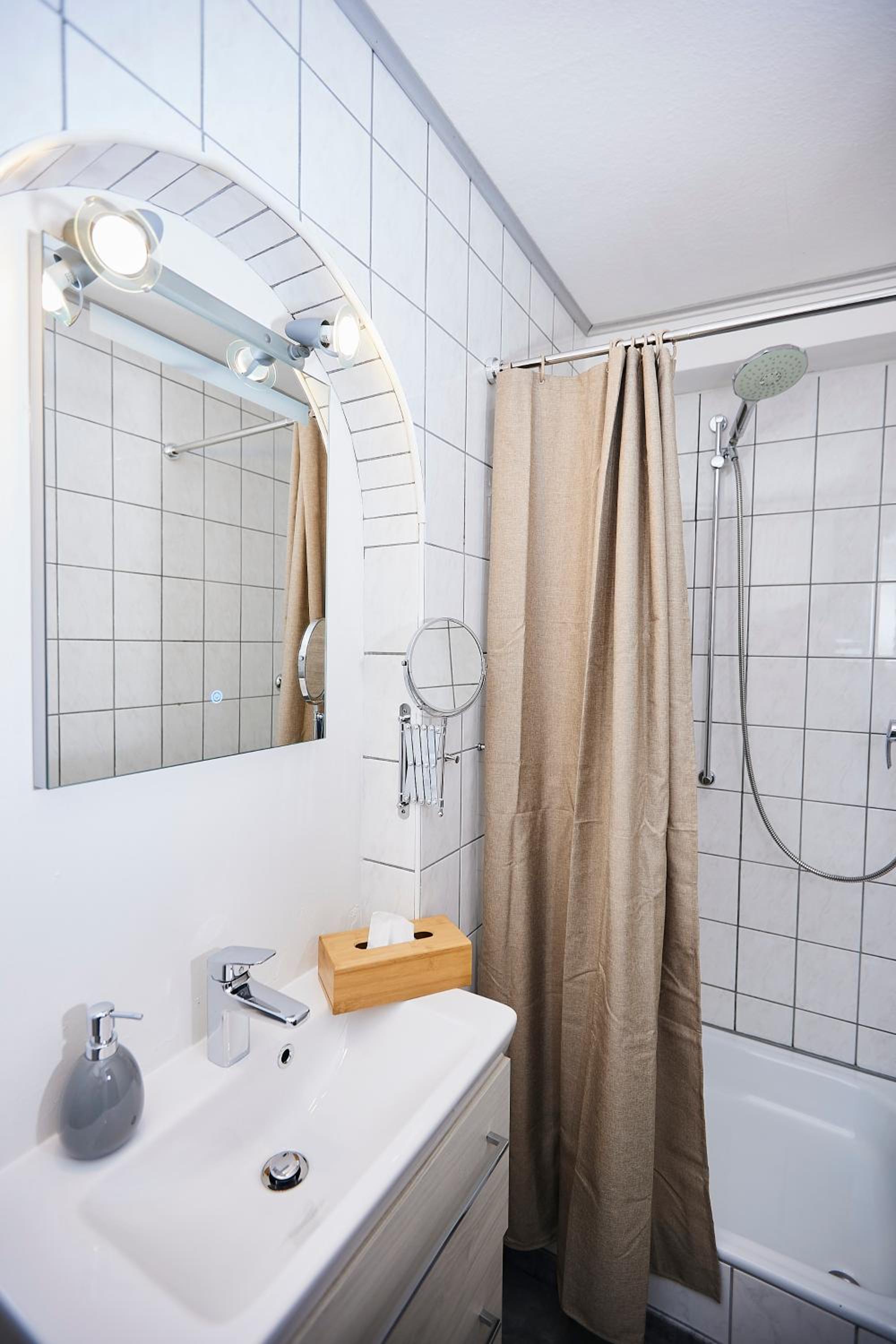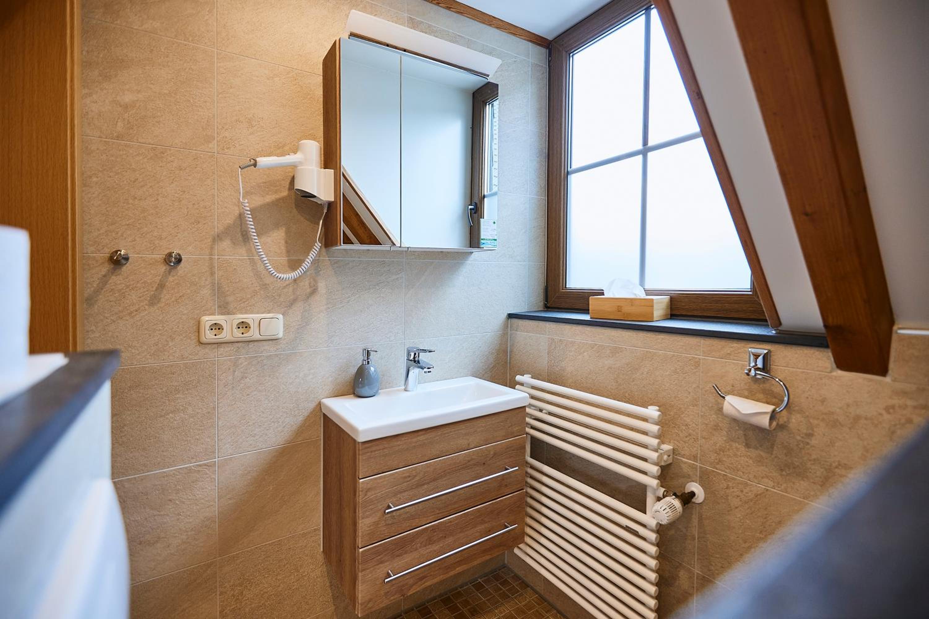 Das Bad nebst Dusche und WC, die in die Jahre gekommen sind. Das WC hatte einen unangenehmen Uringeruch. Keinen Fön, wobei ich nicht geprüft habe ob ich einen benötige.