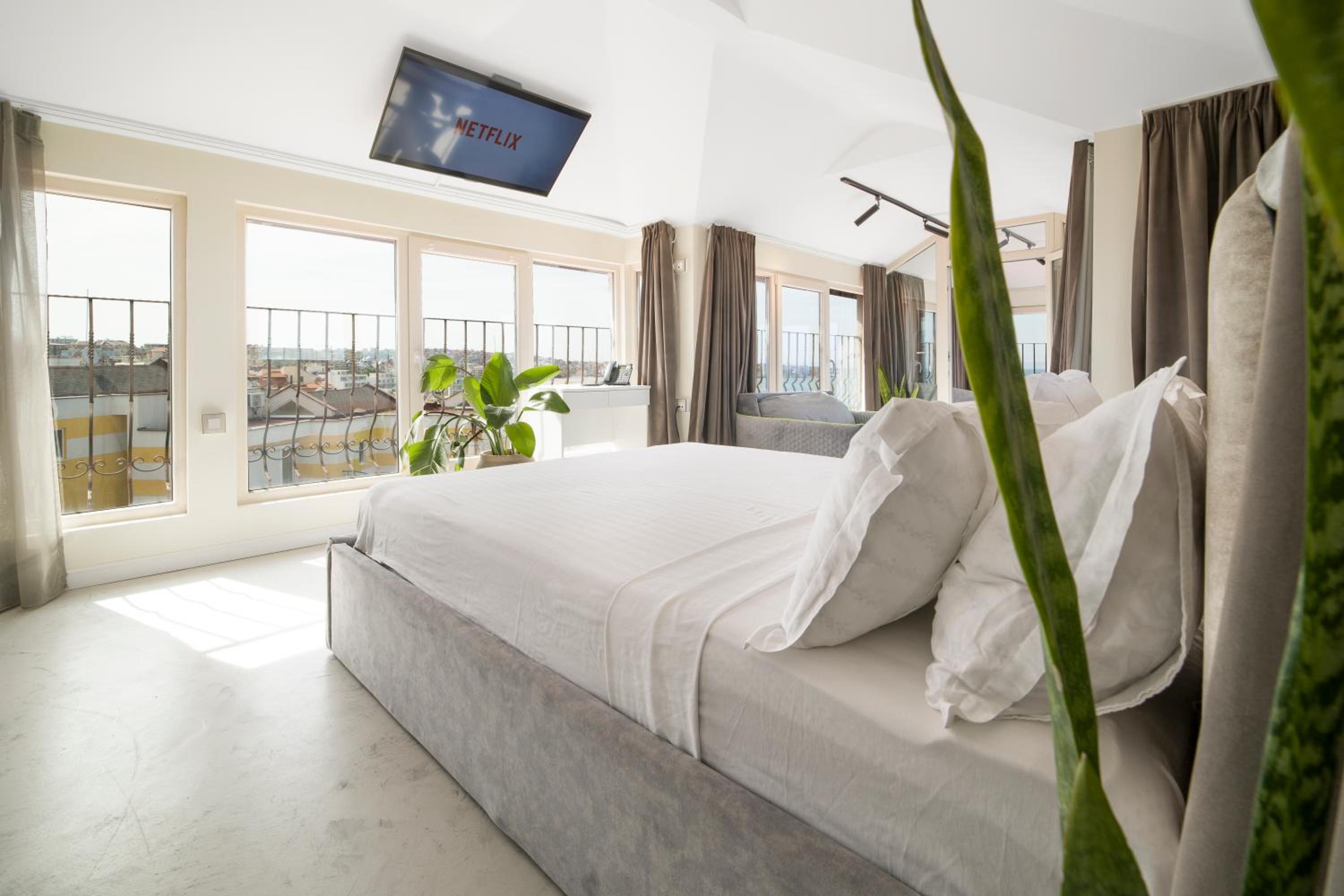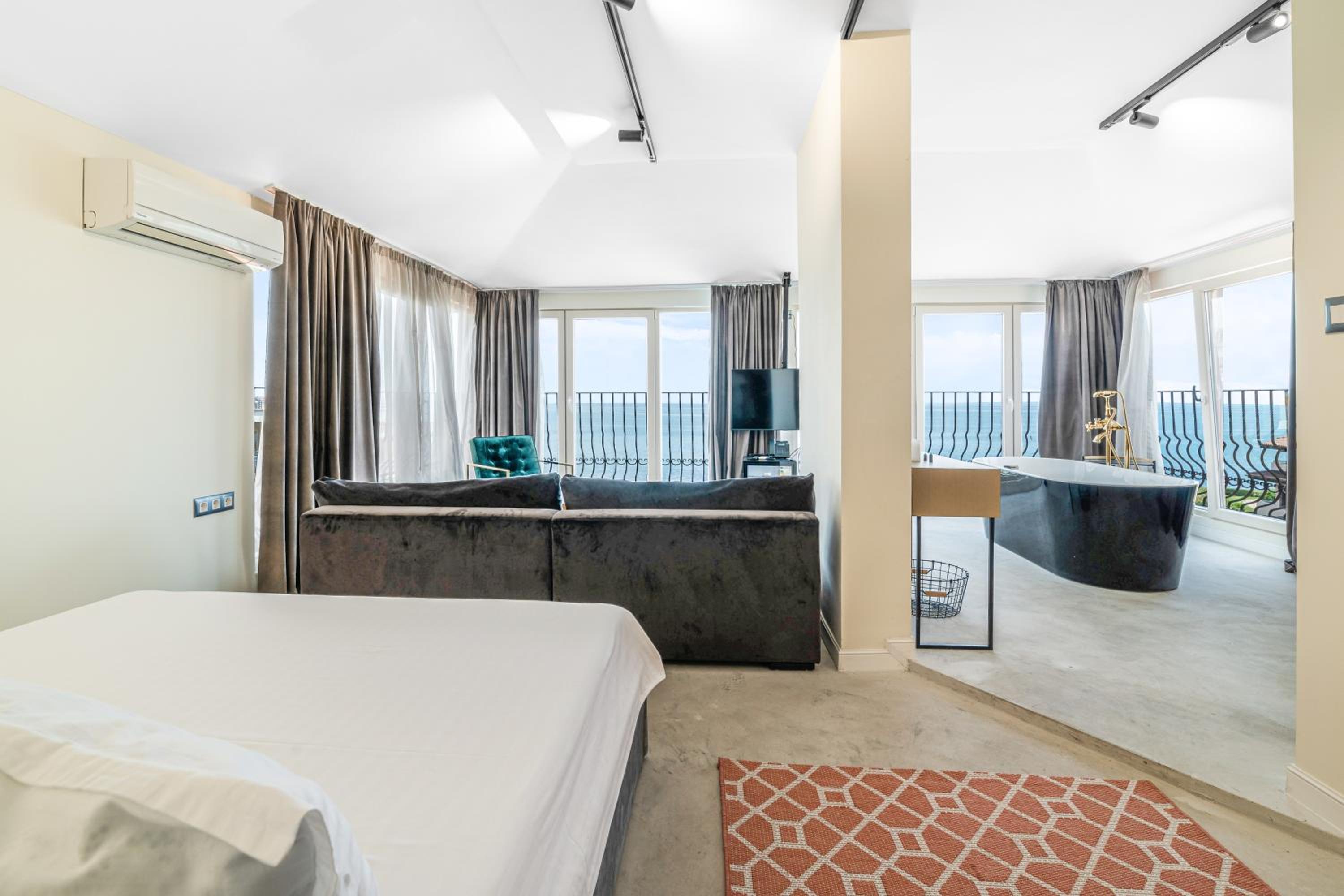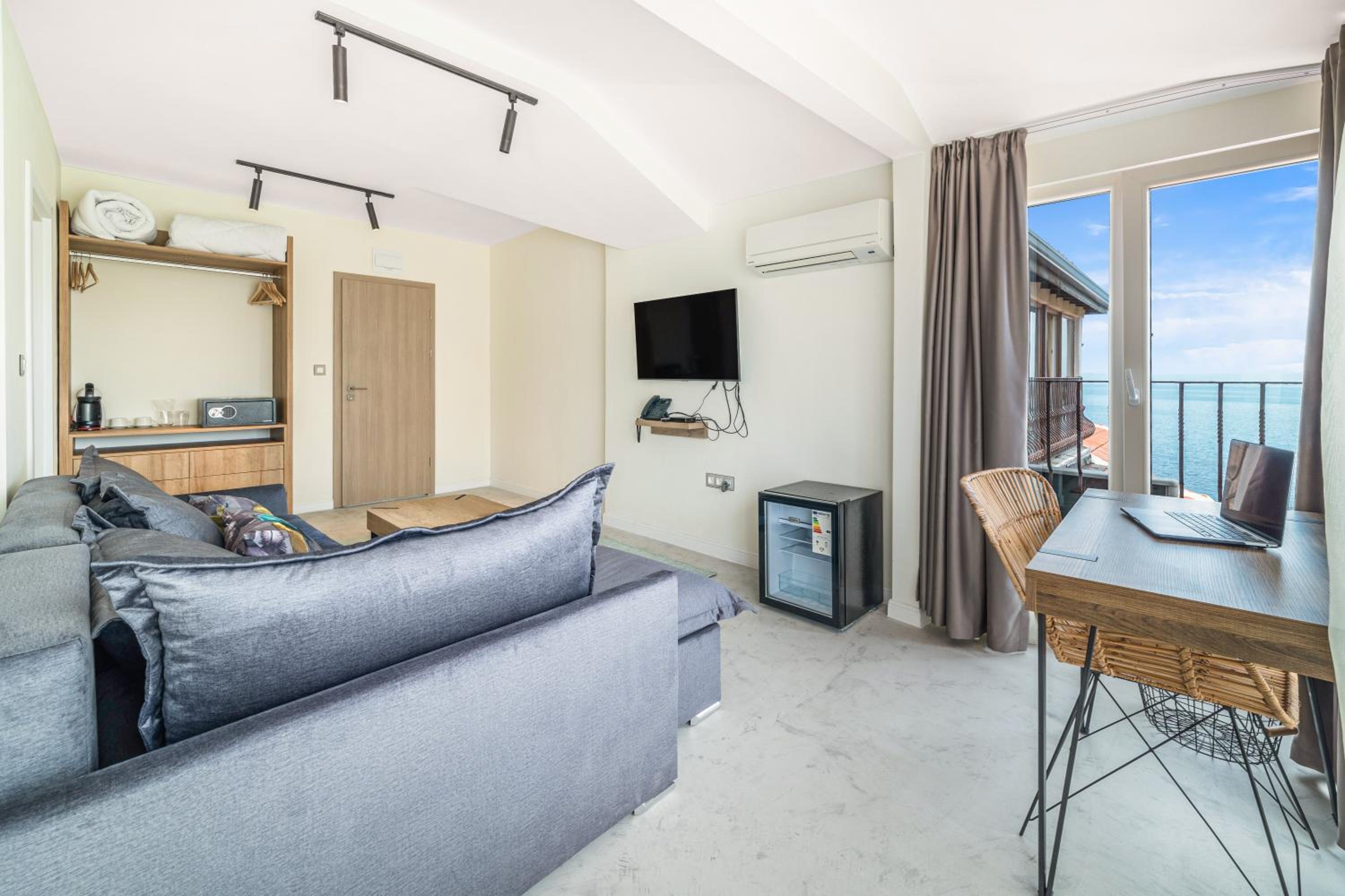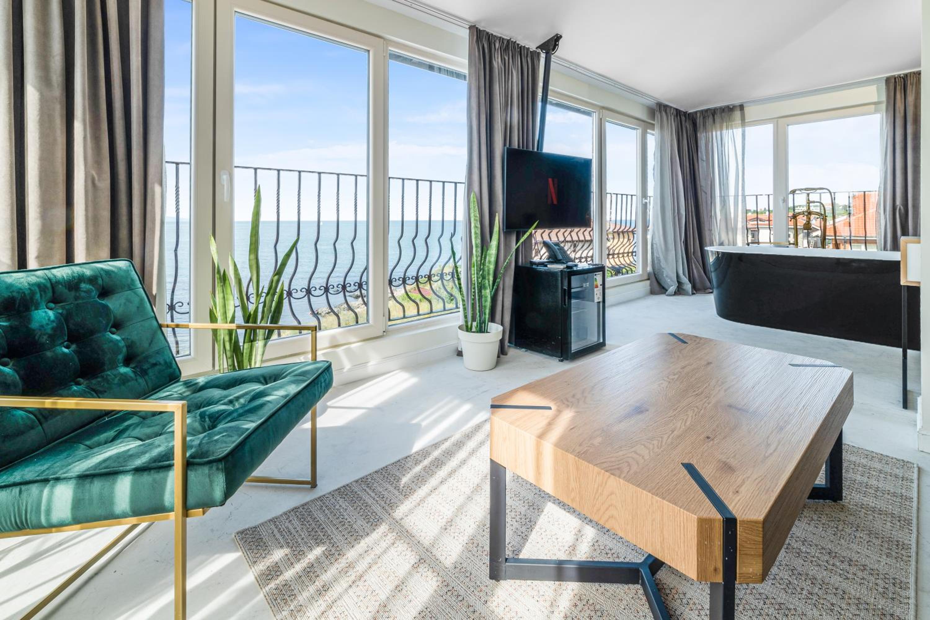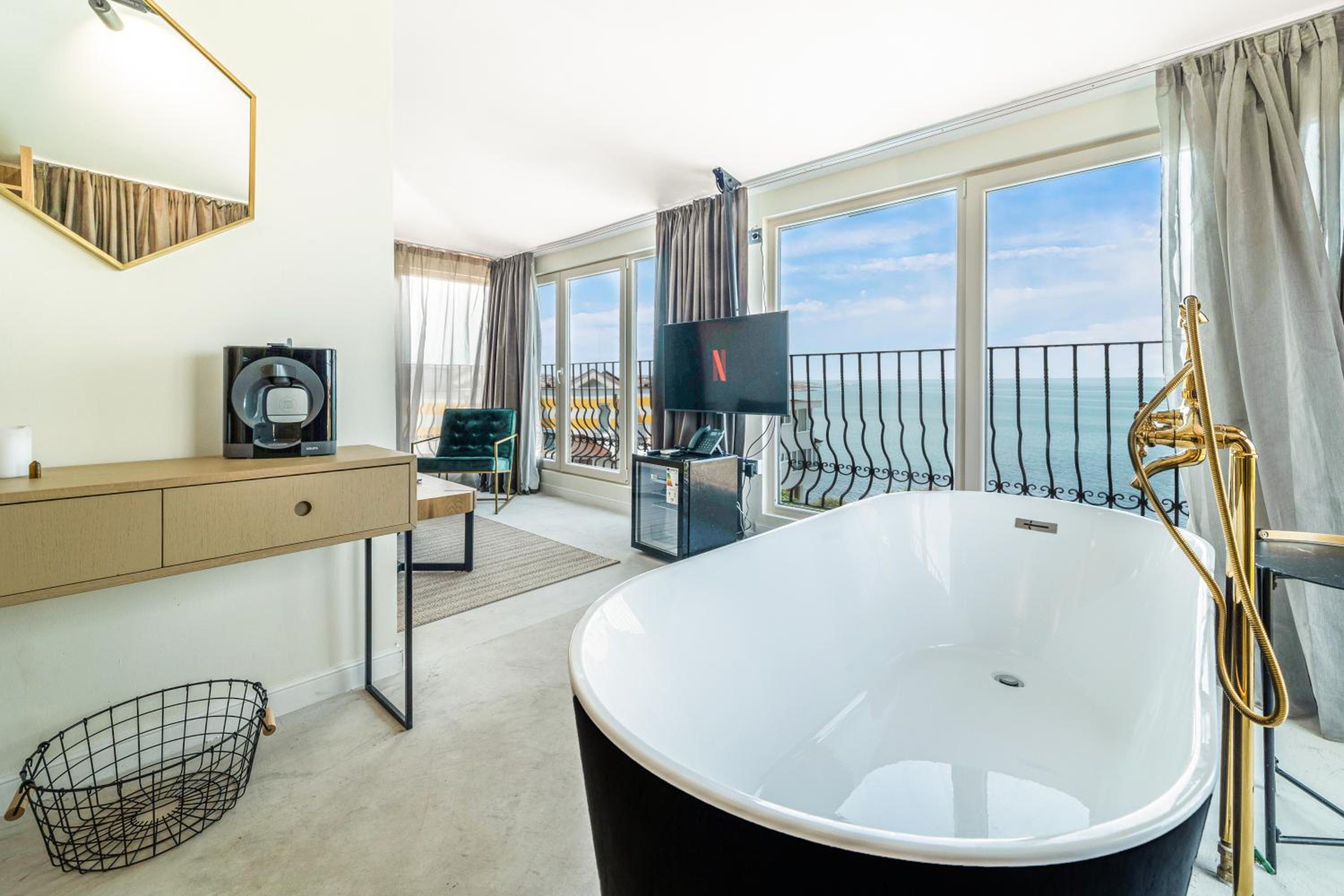 All air-conditioned rooms open to full frontal or side sea views and have a flat-screen TV. The rooms are reachable by elevator and daily maid service is provided. Small breed dogs up to 5KG are welcomed in the hotel. There is a fee of 20BGN per pet, per day, should be paid upon check-in.