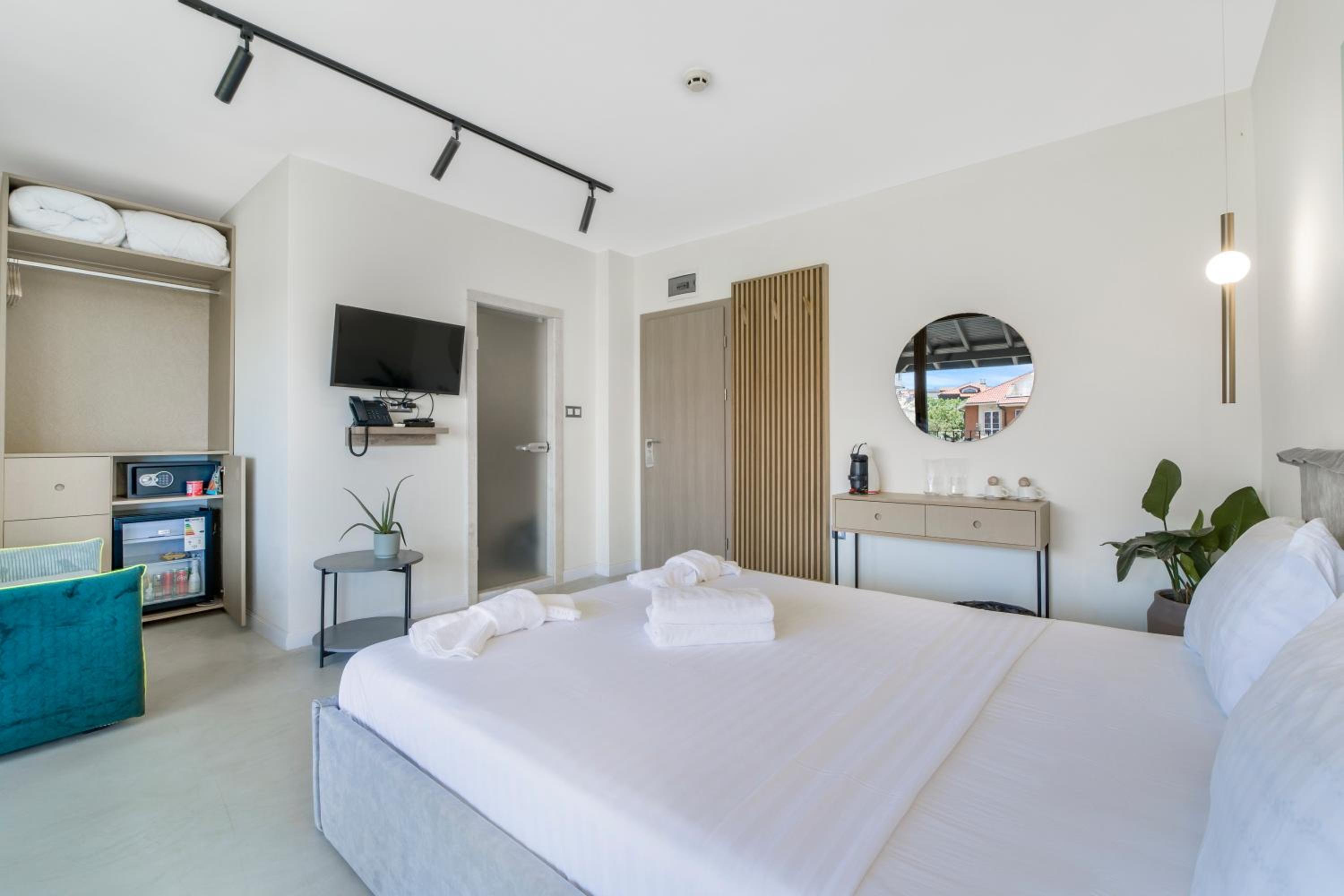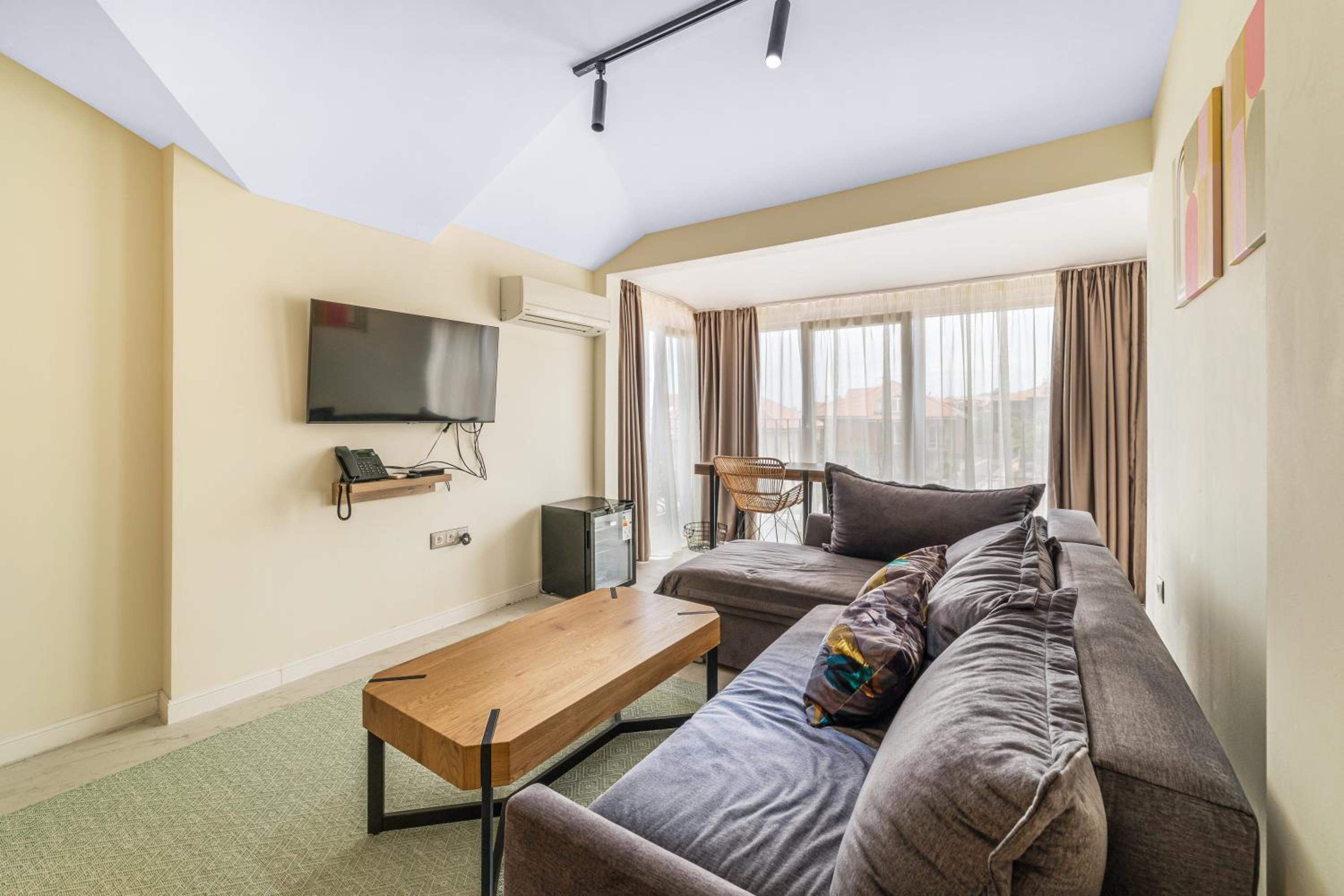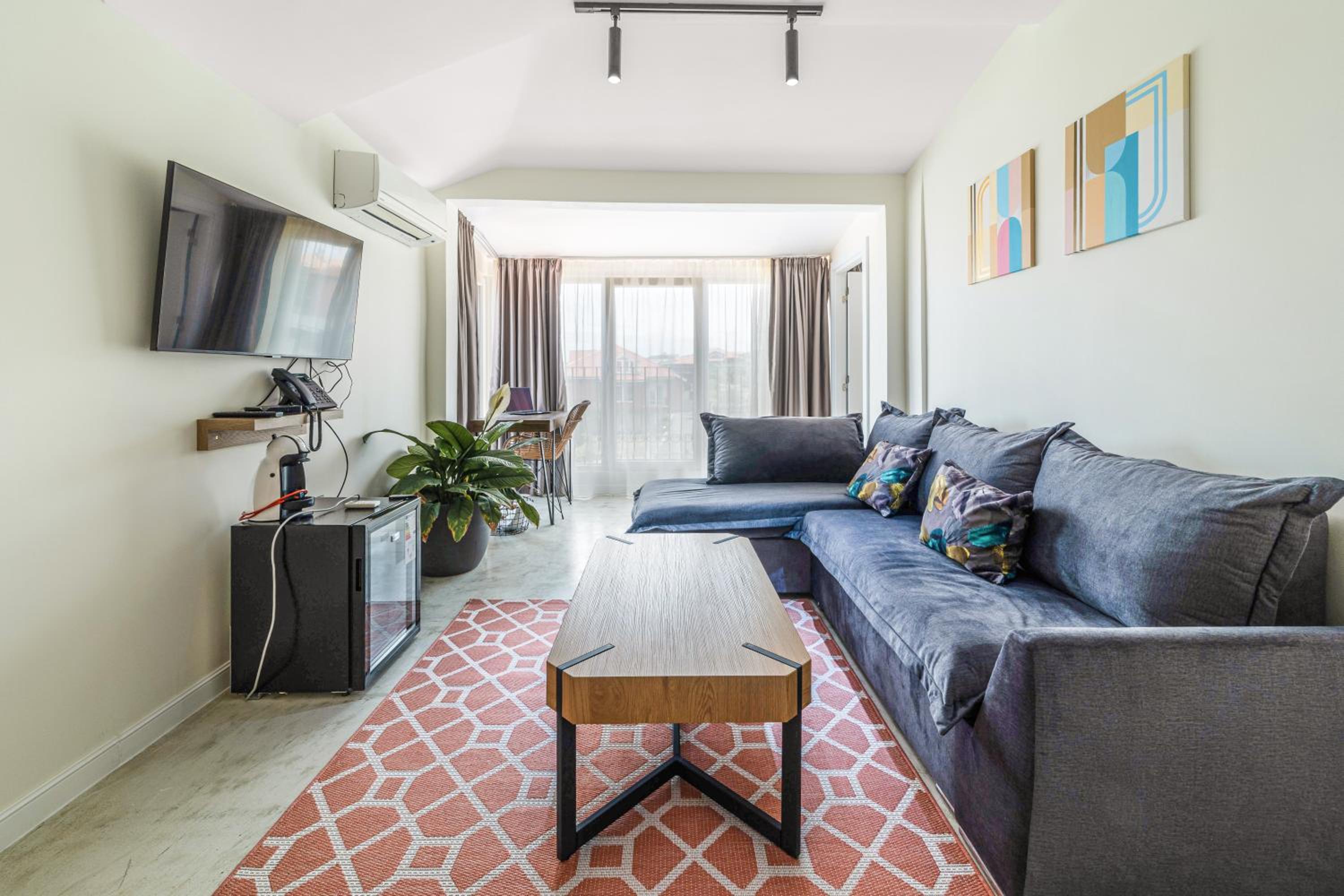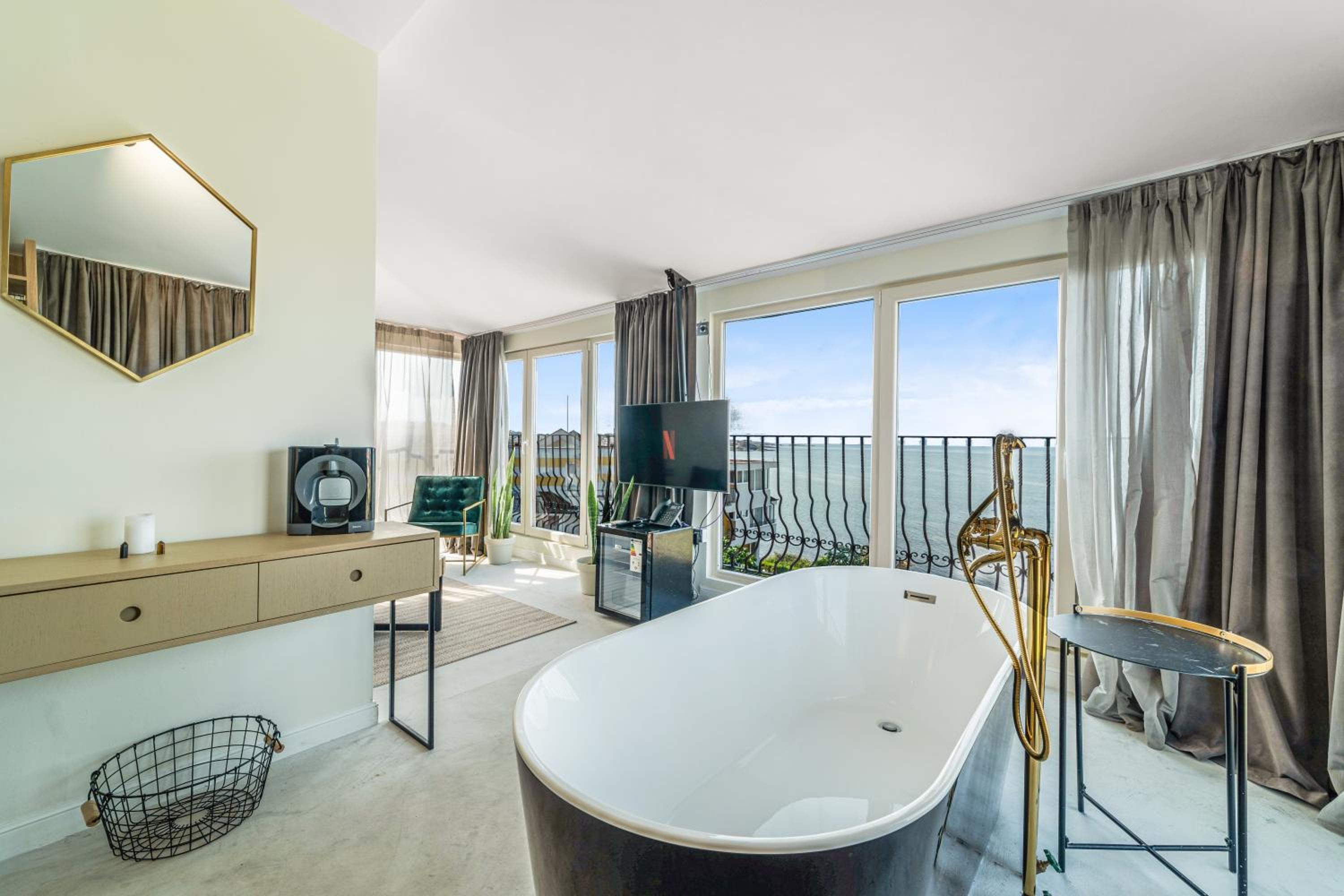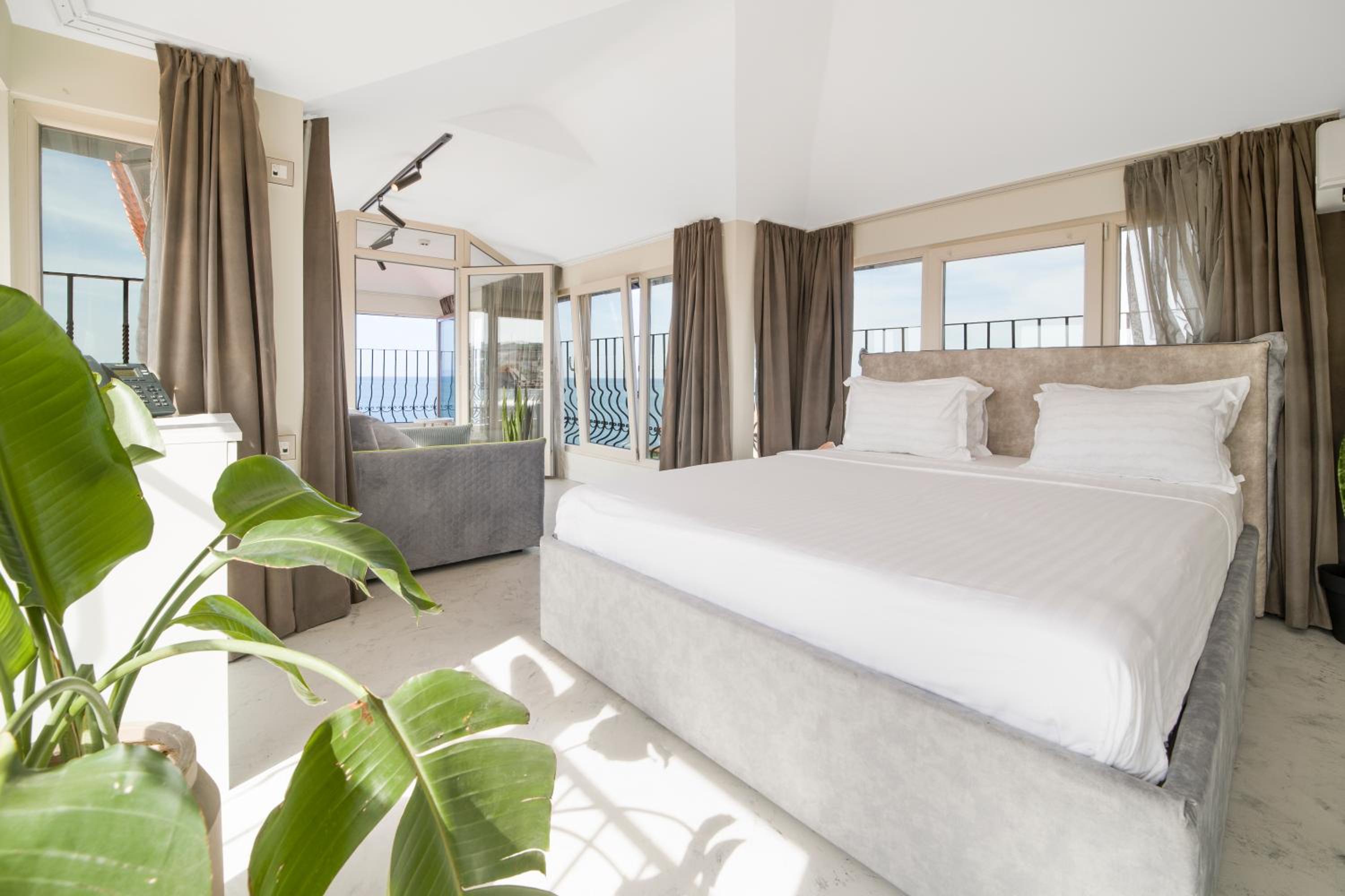 All air-conditioned rooms open to full frontal or side sea views and have a flat-screen TV. The rooms are reachable by elevator and daily maid service is provided. Small breed dogs up to 5KG are welcomed in the hotel. There is a fee of 20BGN per pet, per day, should be paid upon check-in.