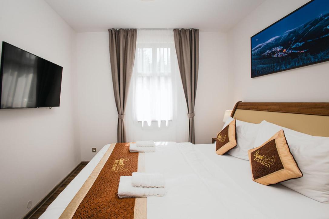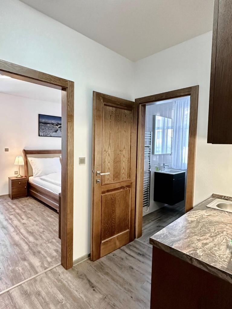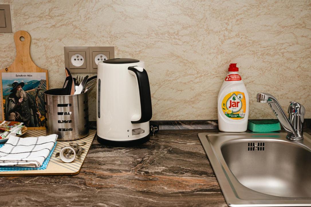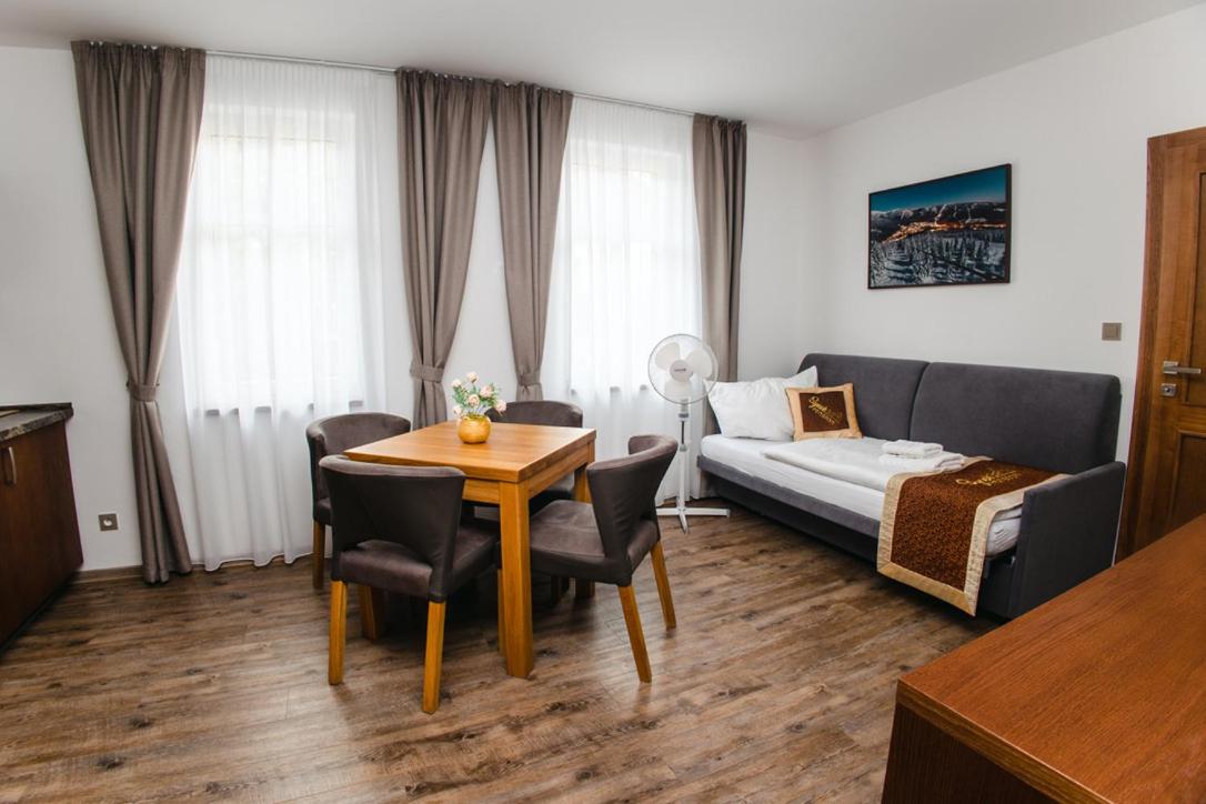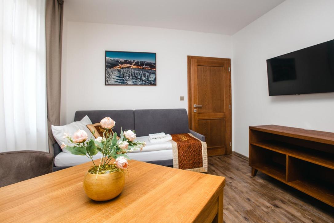 SYNEK Pension in Špindlerův Mlýn offers a 4-star aparthotel experience with free WiFi, private parking, and family rooms. Each unit boasts a fully equipped kitchenette, flat-screen TV, and a private bathroom with modern amenities.