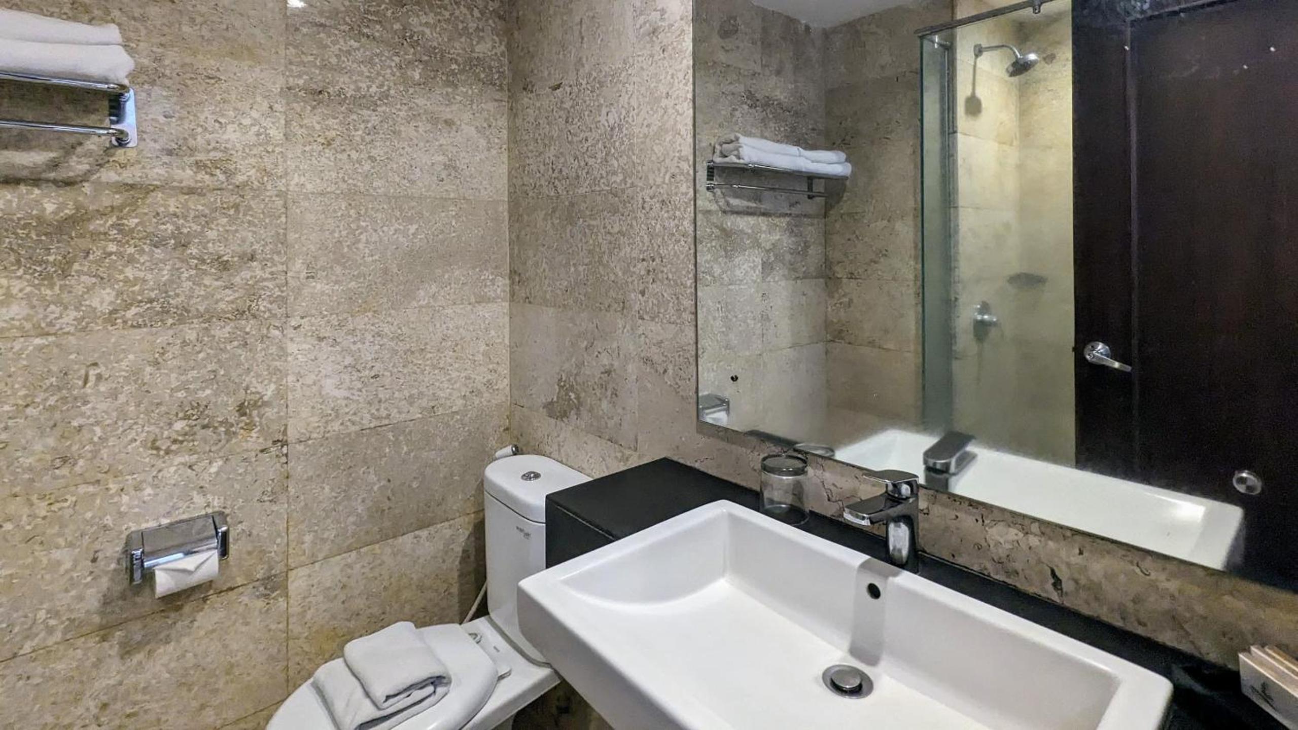 The room is old & dirty, shower drainage & sink clogged, no hand towels, no face towels & iron only by request.