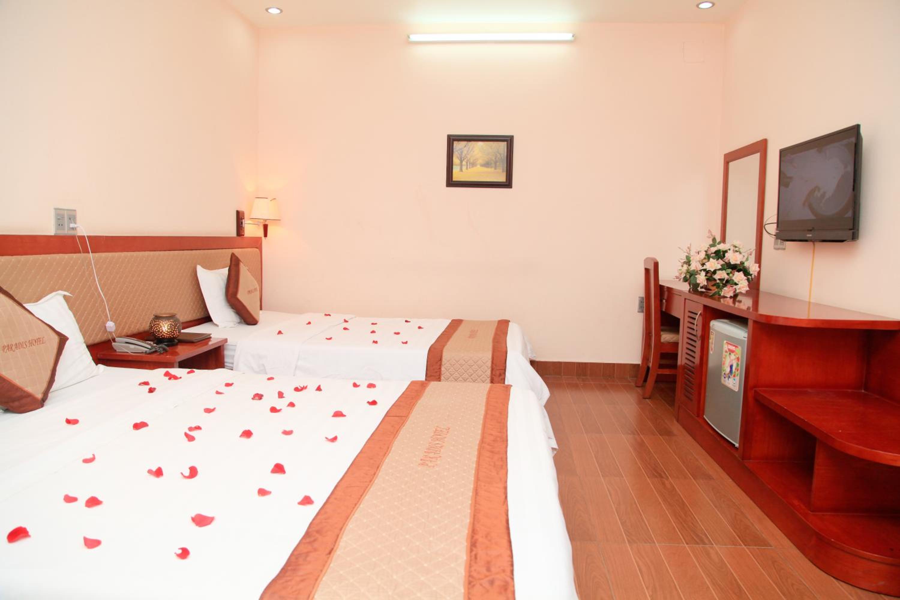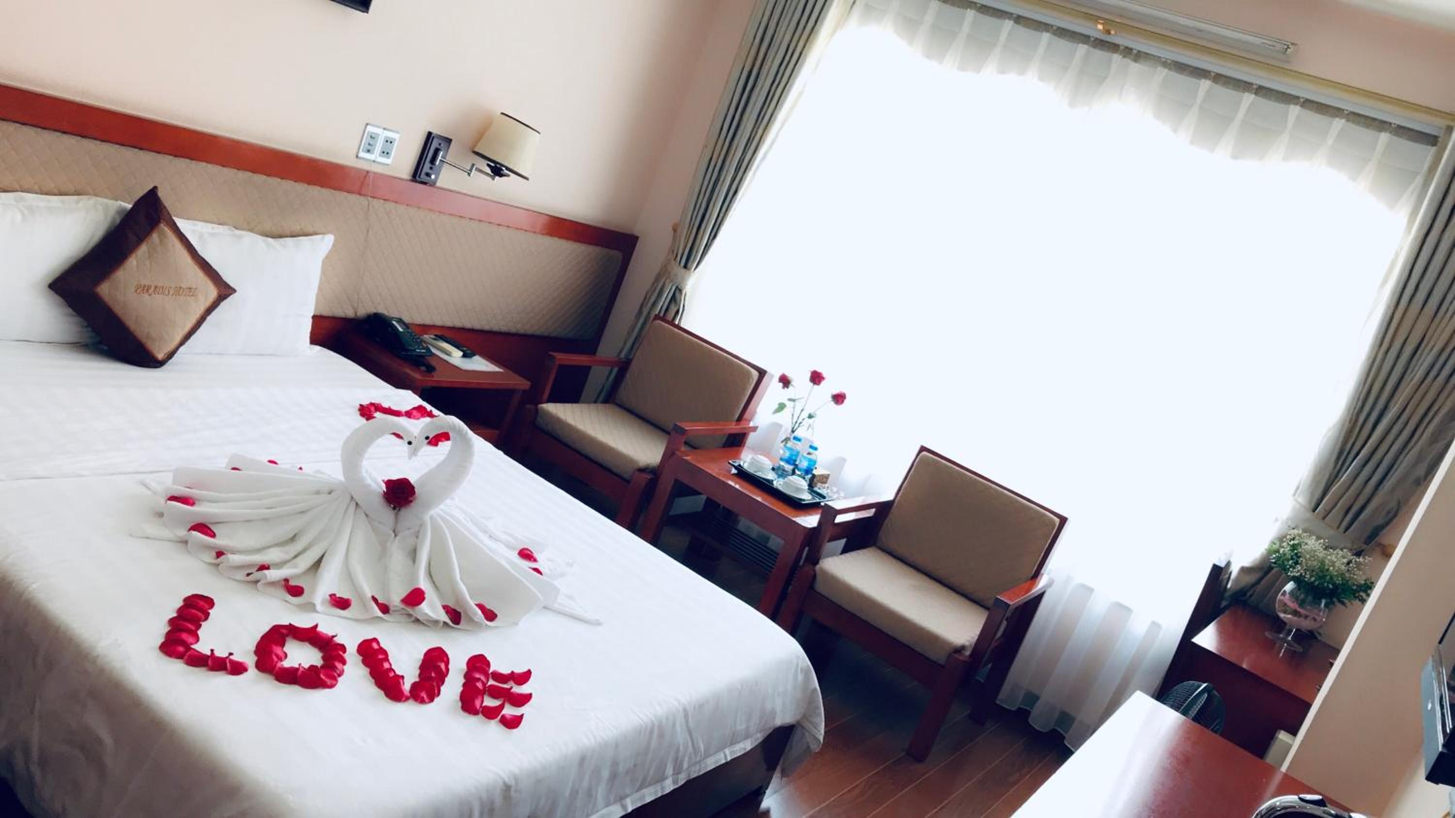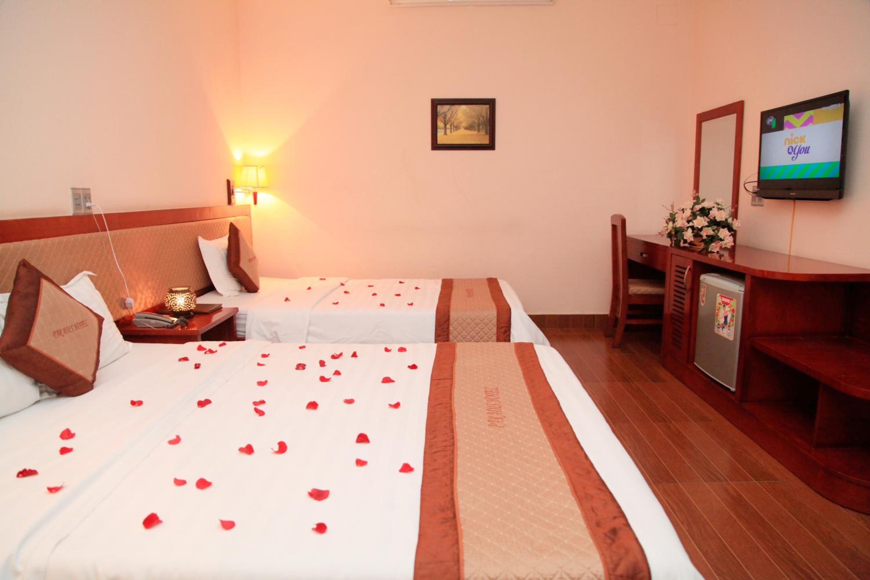 Paradis Hotel in Halong offers air-conditioned rooms with free Wi-Fi and amenities like a flat-screen cable TV, minibar, and comfortable seating area. The private bathrooms are equipped with a shower, hairdryer, and complimentary toiletries for a relaxing stay.
