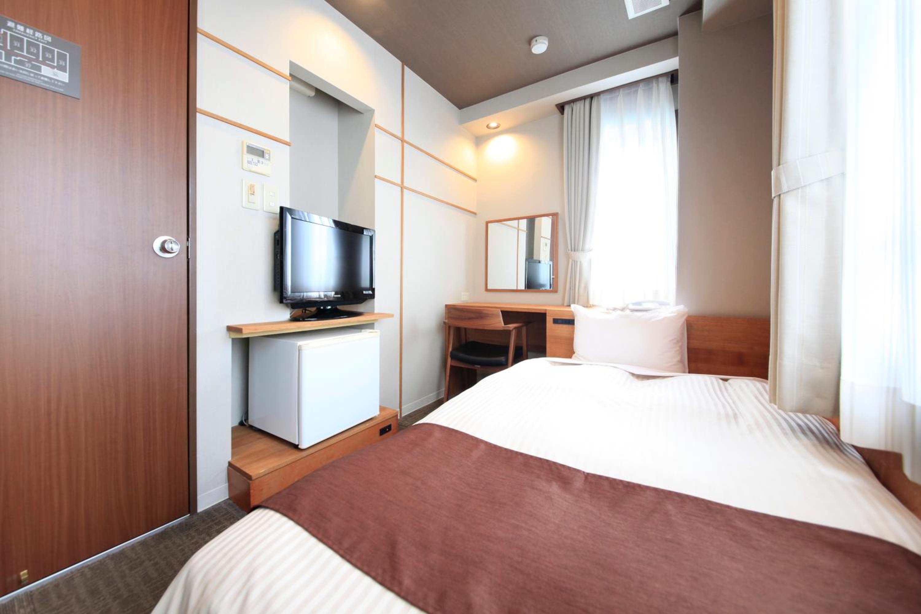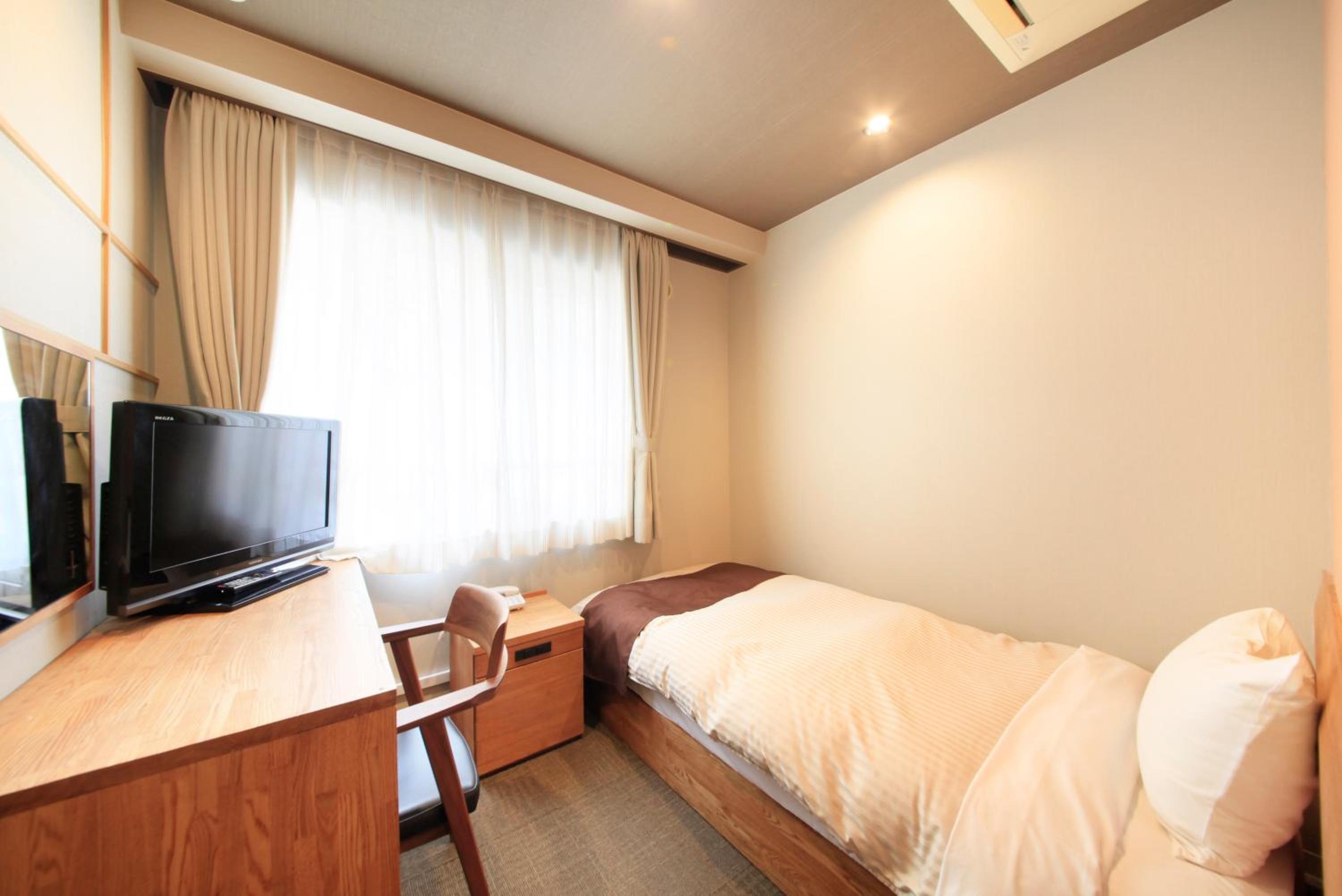 別館の客室は古く質素なビジネスホテルみたいな感じ。室内は狭くて最低限の物のみ。