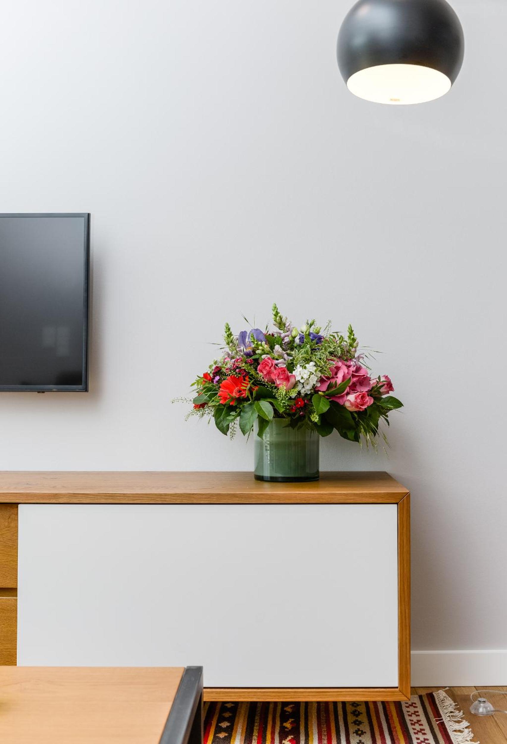 The apartment is cleaned once a week. Cleaning includes a change of bed linen and towels, garbage disposal and a light cleaning of the kitchen.