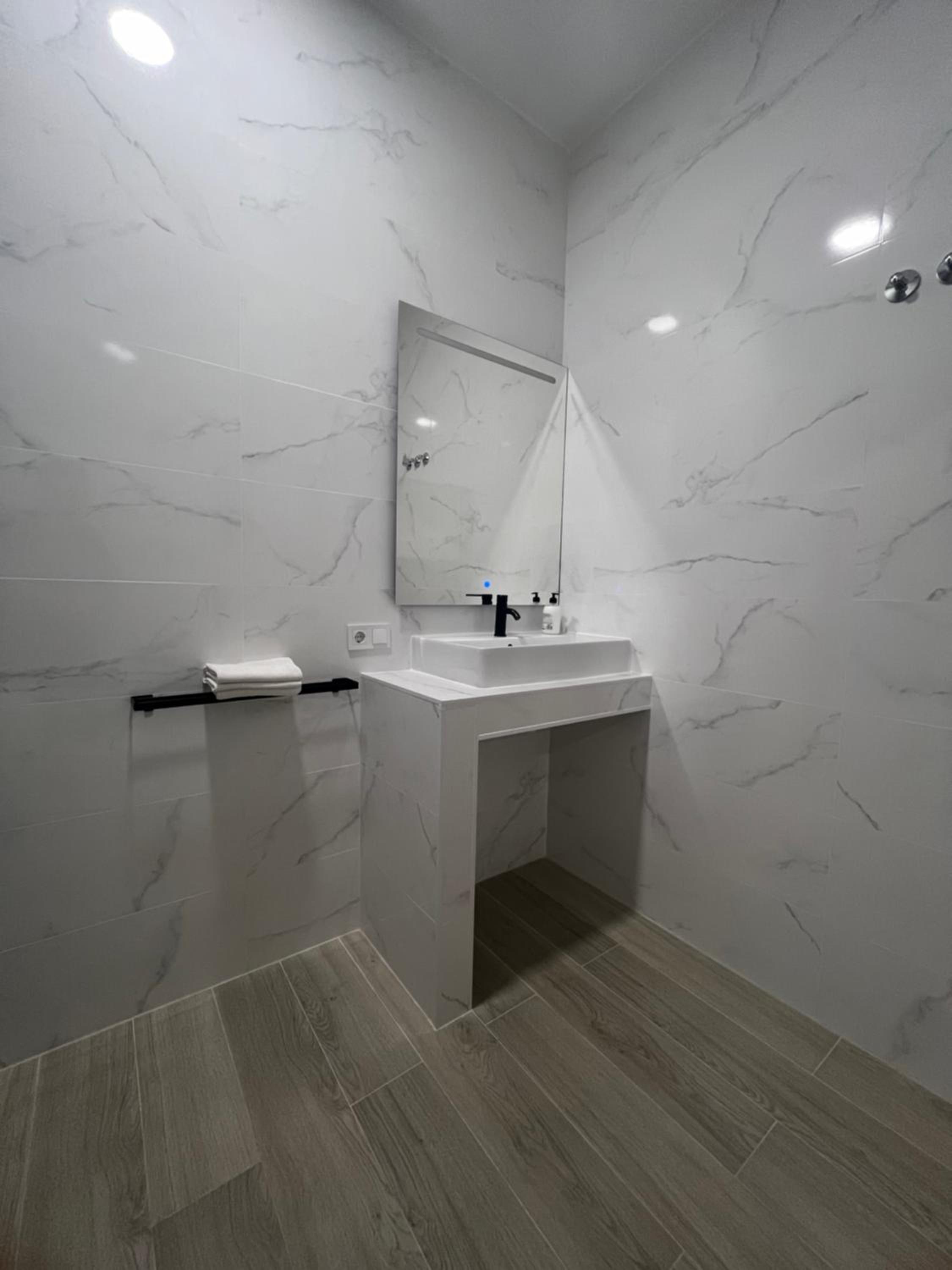 Trochu pretekajúce umývadlo a batéria v sprche.
