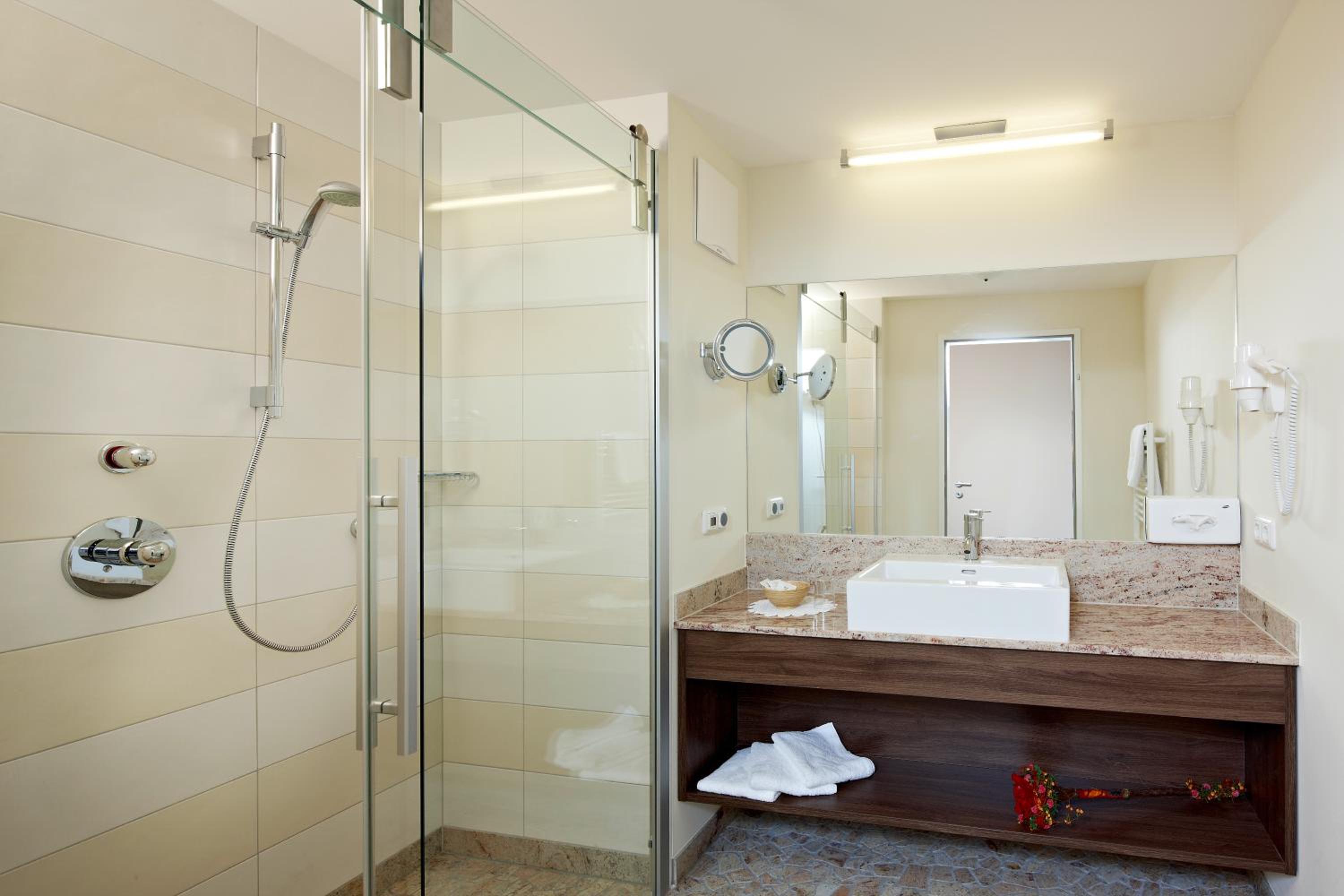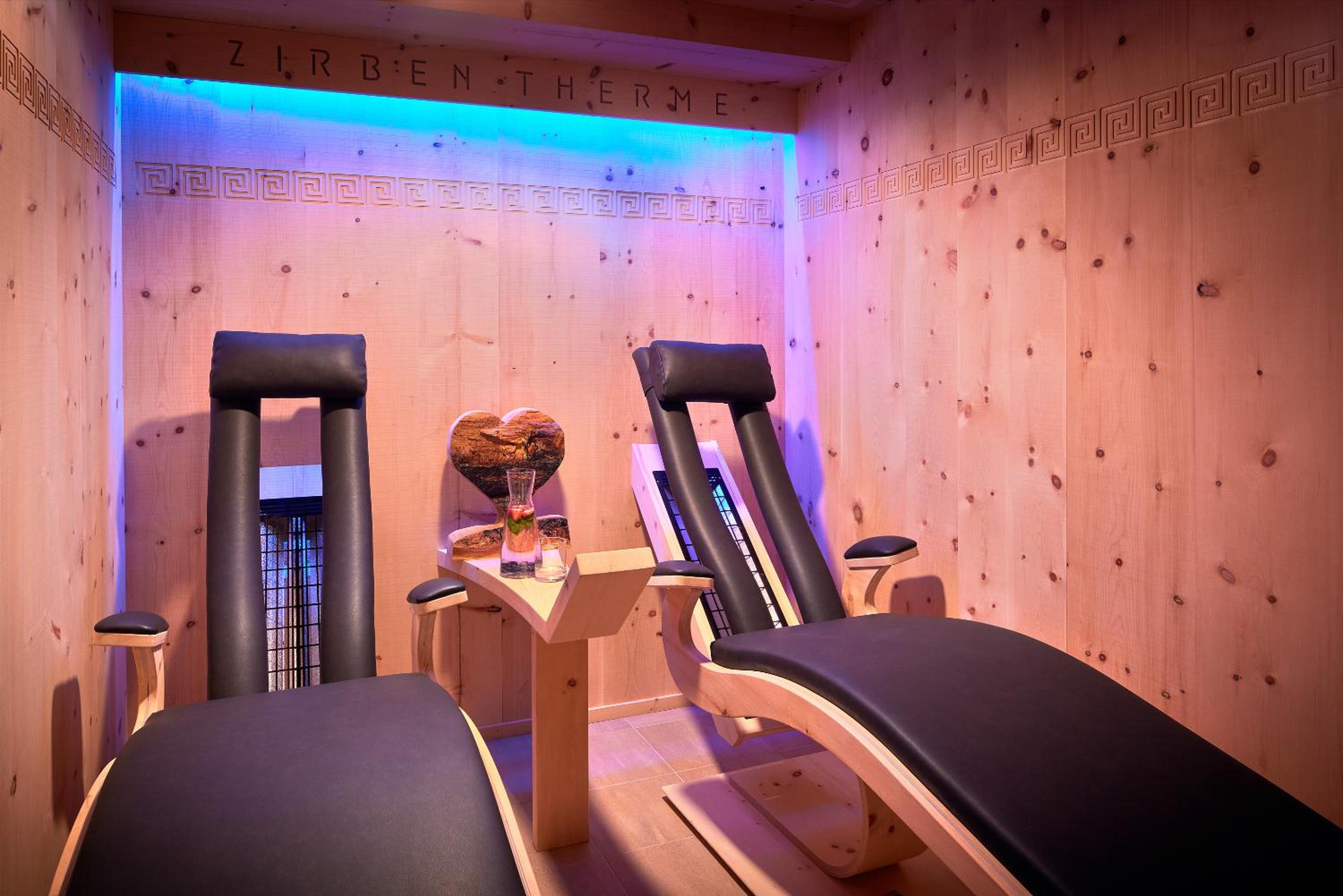 Unwind and rejuvenate in the 200 m² spa area, complete with a sauna, steam bath, relaxation room, and a serene swimming pond with a sunbathing lawn. The latest additions of infrared loungers and a soft sauna made of pine wood provide an extra touch of luxury. Treat yourself to a soothing massage upon request.